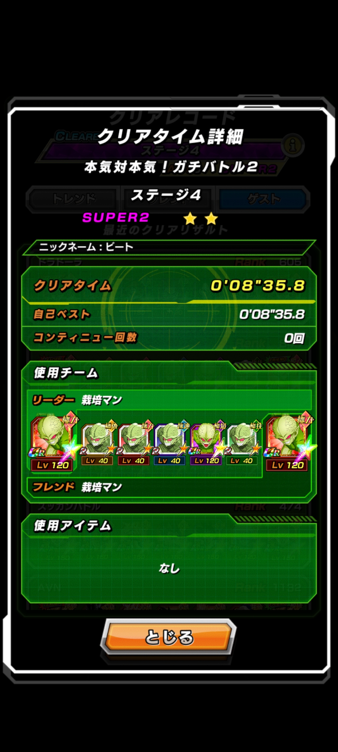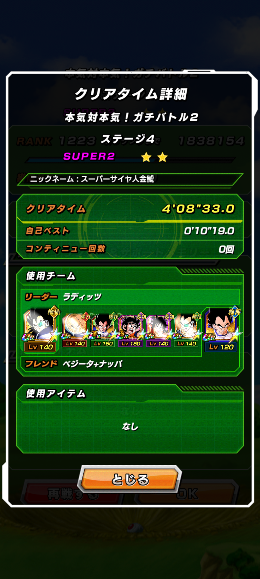 • サイヤ人編ミッションクリアしてから体属性6体に絶望してたけど体力残り1の超大接戦であえなく被弾して必殺封印された身勝手弟に技の手本を見せたラディッツ兄さんが追撃必殺と潜在通常出して見事勝利、ラディッツさん…ホンマに俺は嬉しいよ…