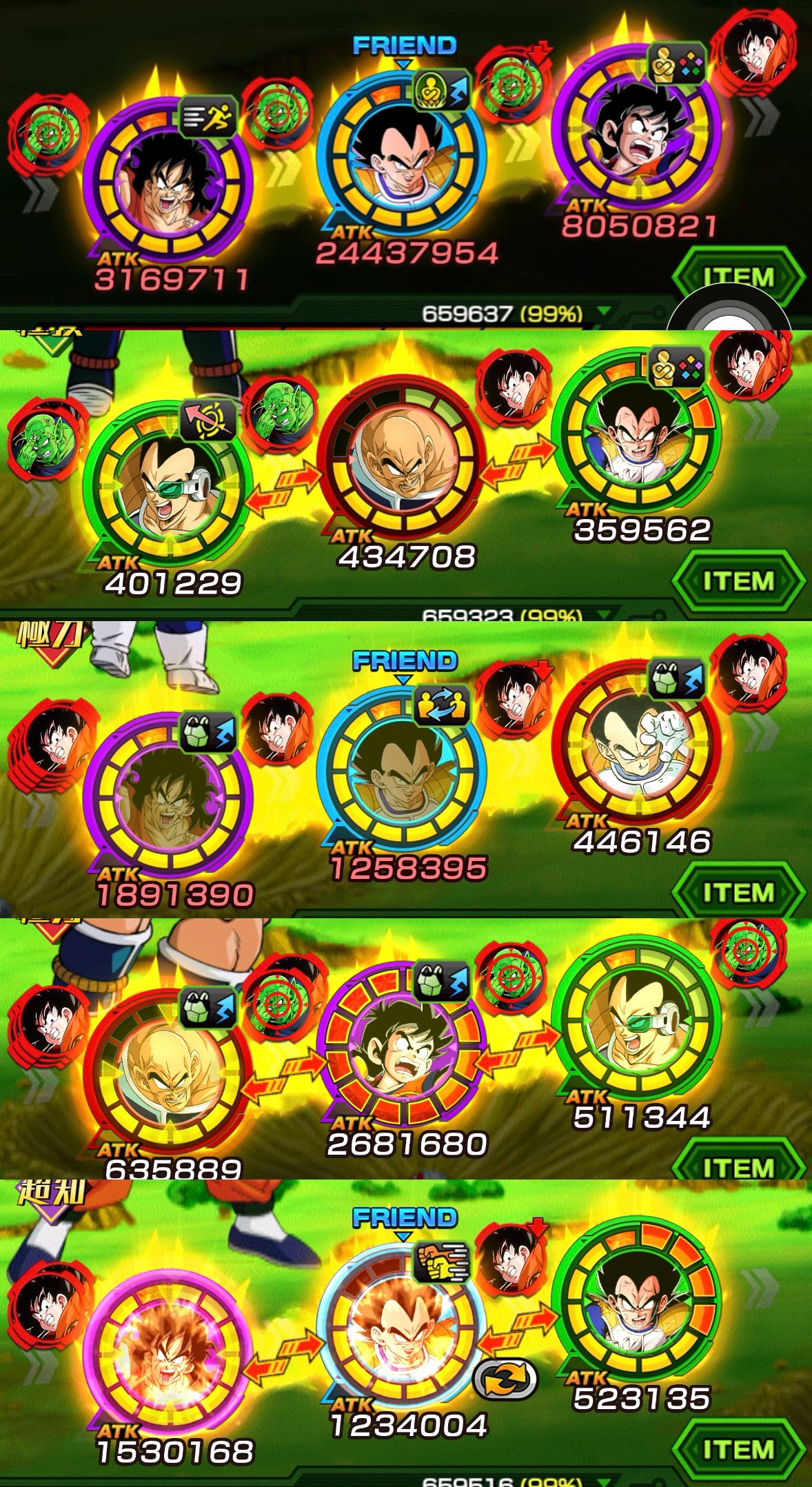 ちなみに1ターン目(上)から5ターン目(下)までの並び。これで5ターン目開始時点でピッコロ倒せてて悟空1体のみの状況。