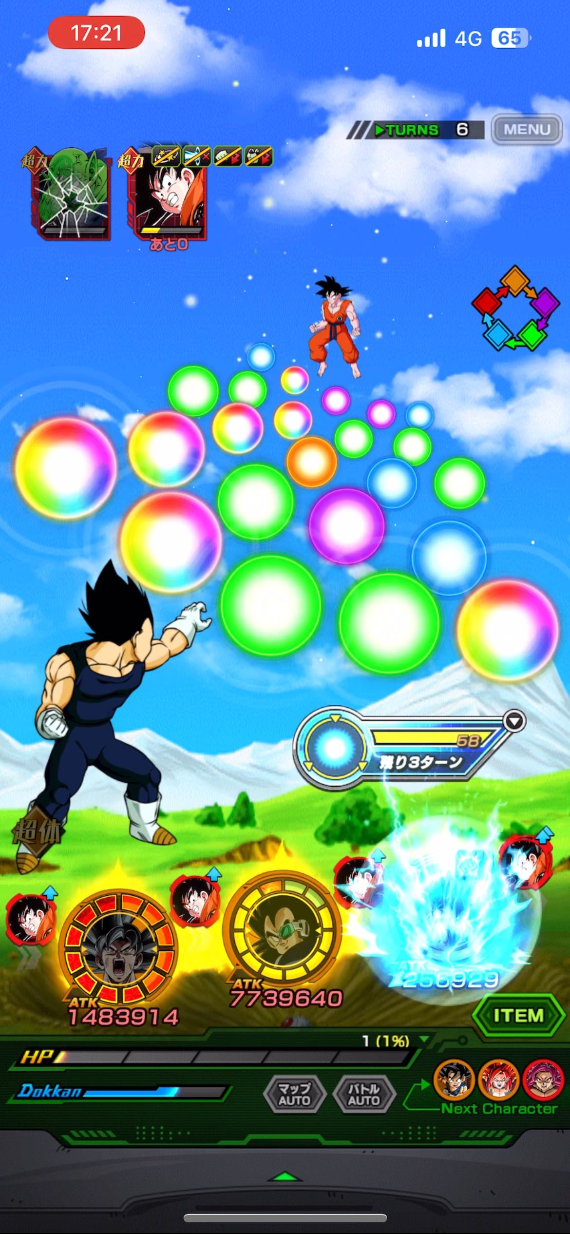 セオリー通りならまずデバフ使いの悟空を片付けてからピッコロに…となるのですが、悟空の方がタフ&デバフで手間取るのでそこで時間を掛け過ぎると5T以降のピッコロで事故る確率が激増するしでどちらを先に倒すかも非常に悩ましいです。