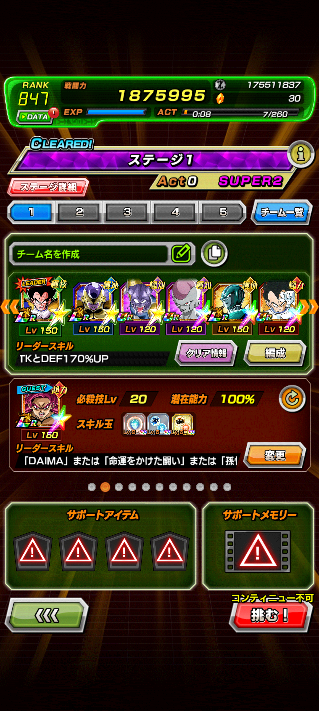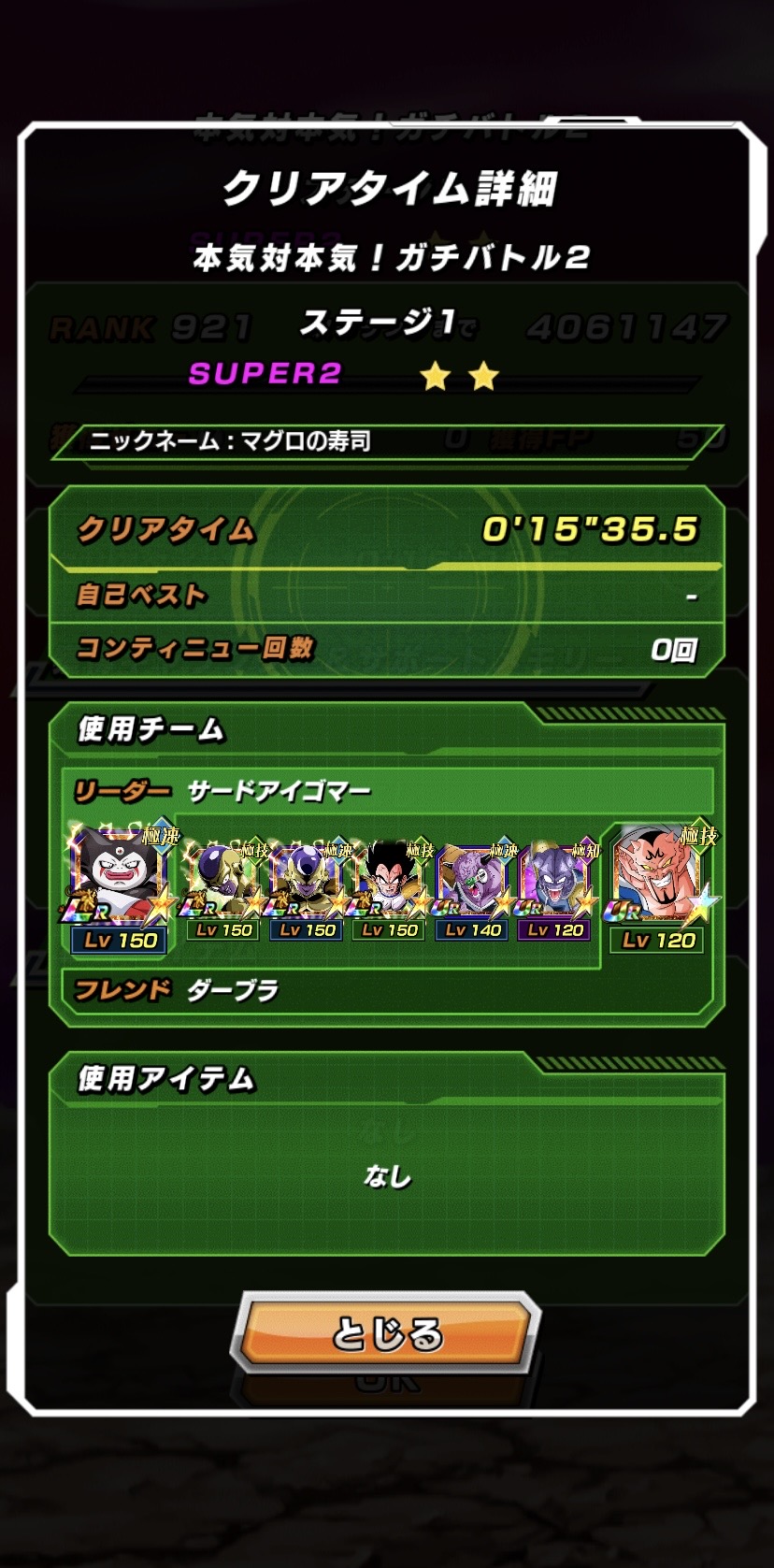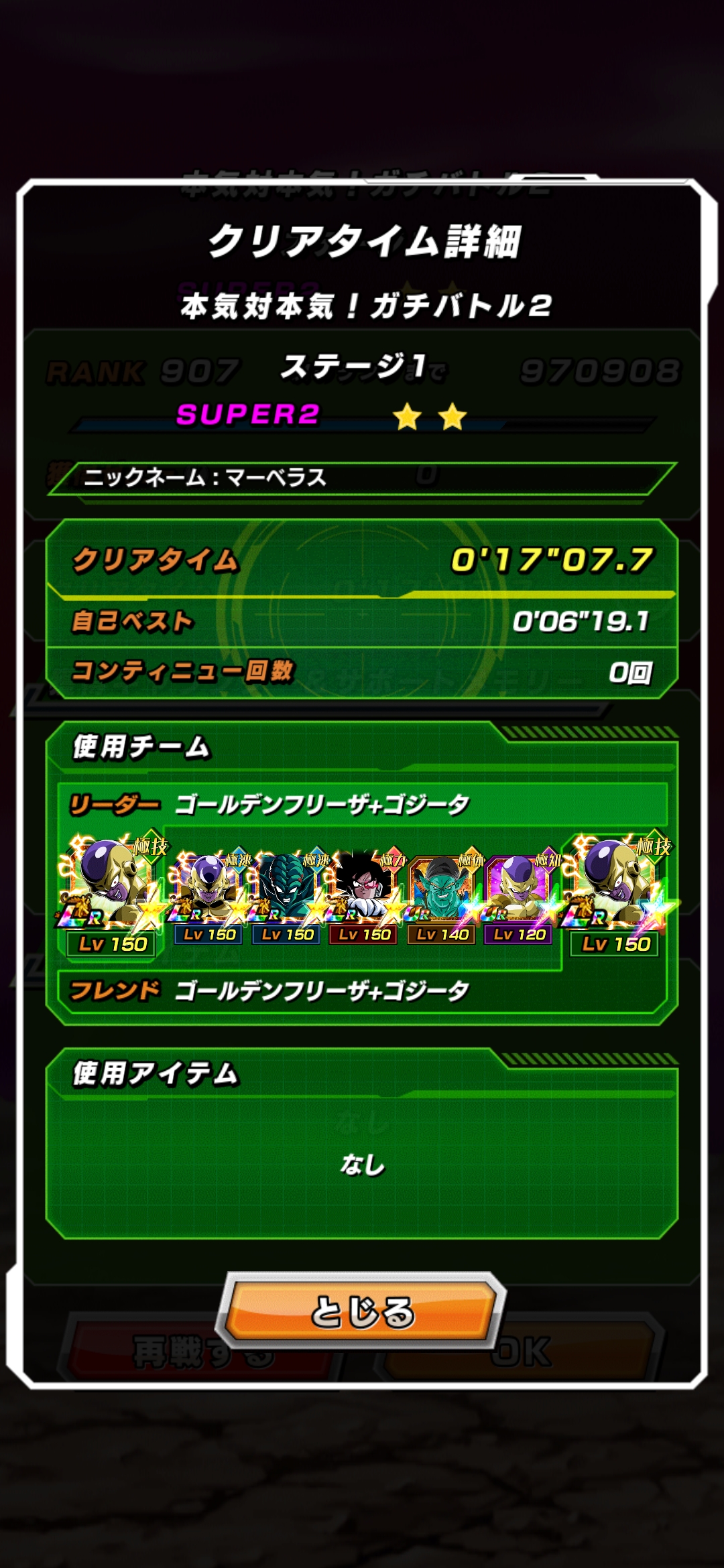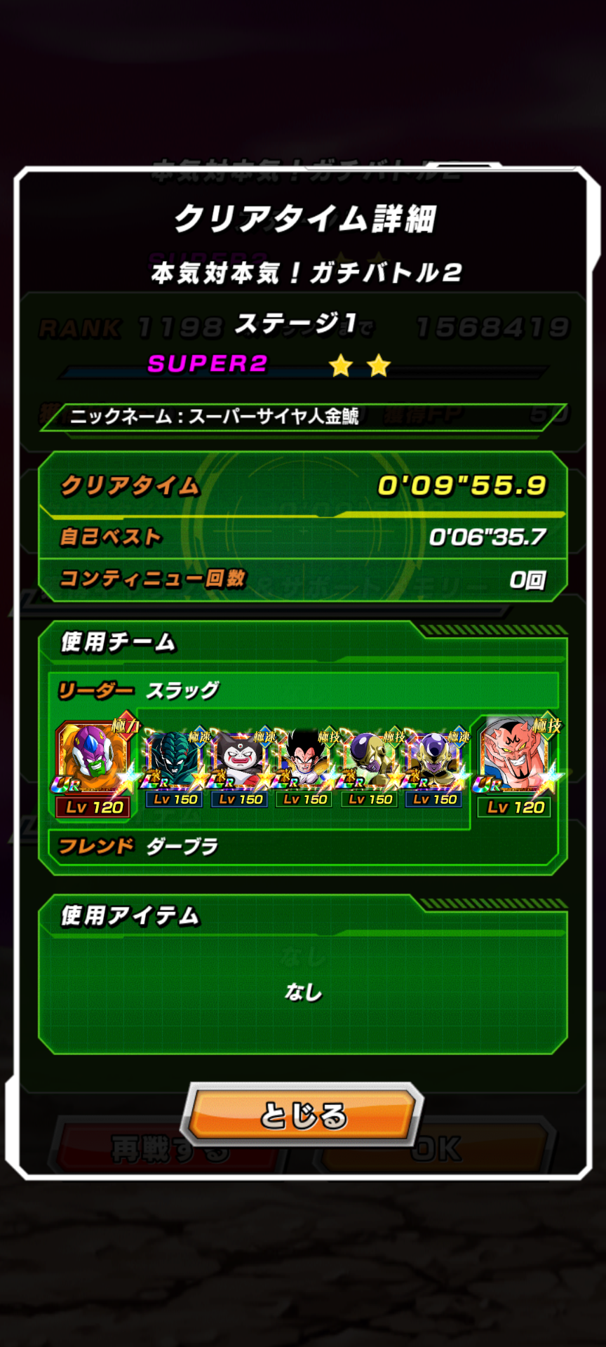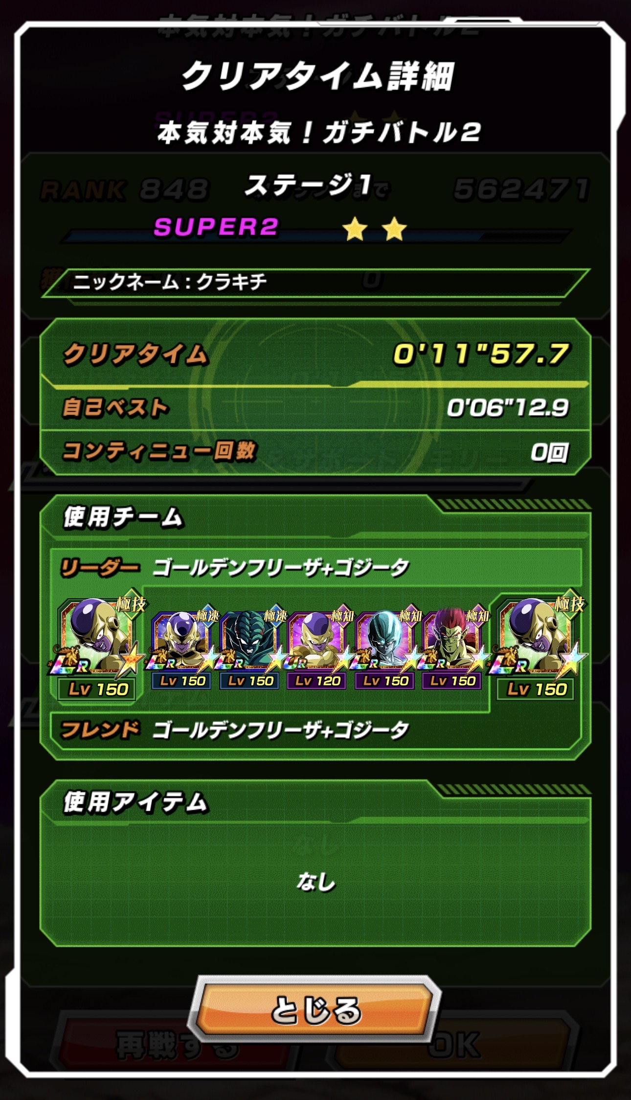 • 9ターンかかったけどゴジータが回避してくれるのと、ガーリックJr.が固かったこともあり倒されずに済んだ感じ。復活せずに終わることができた。