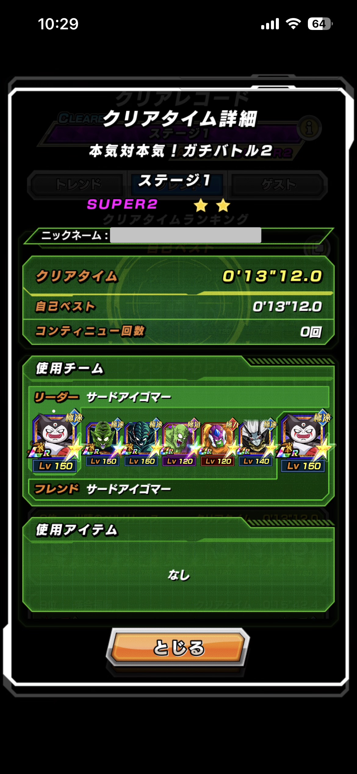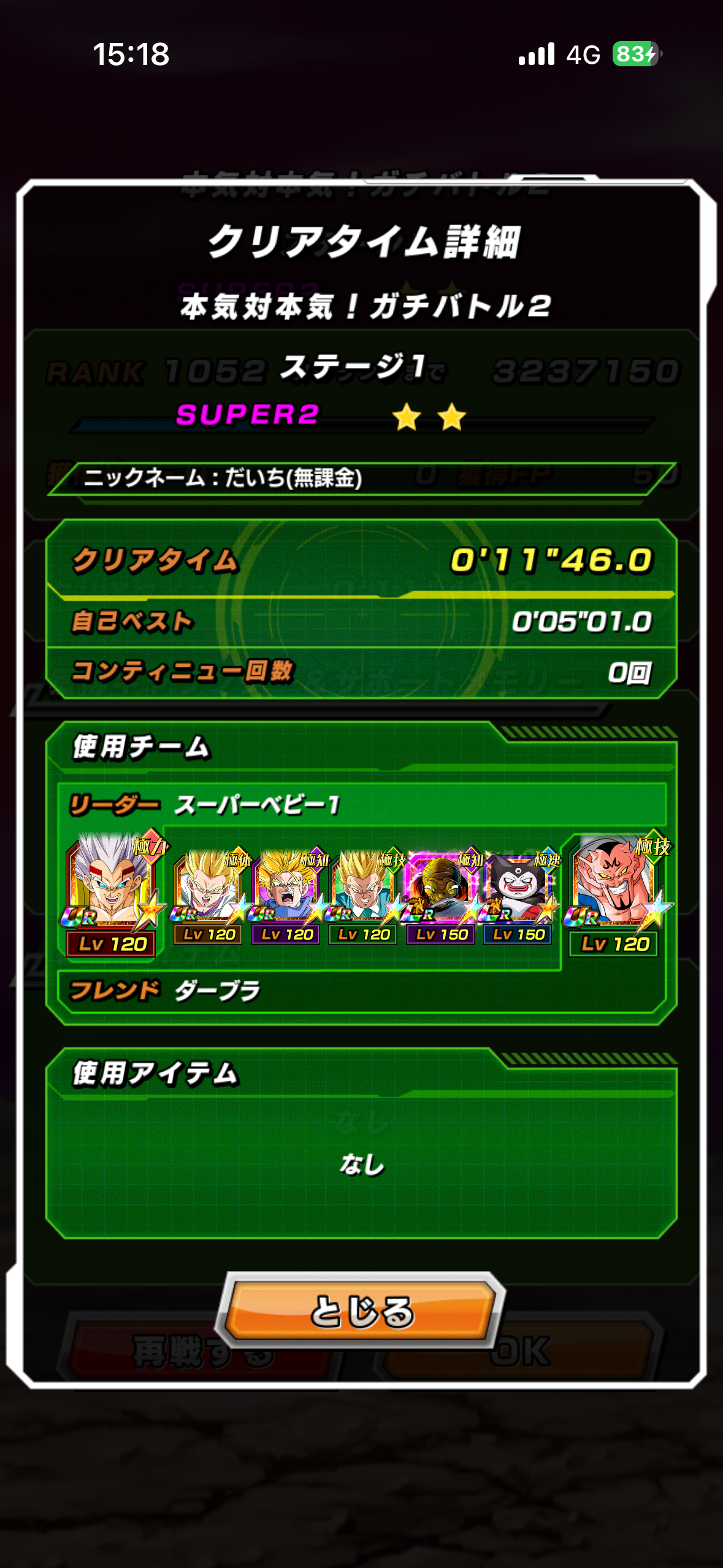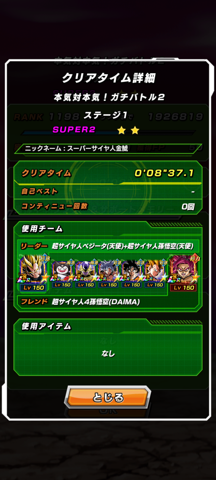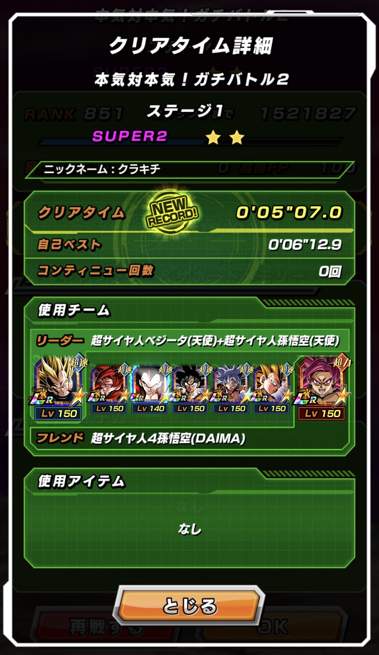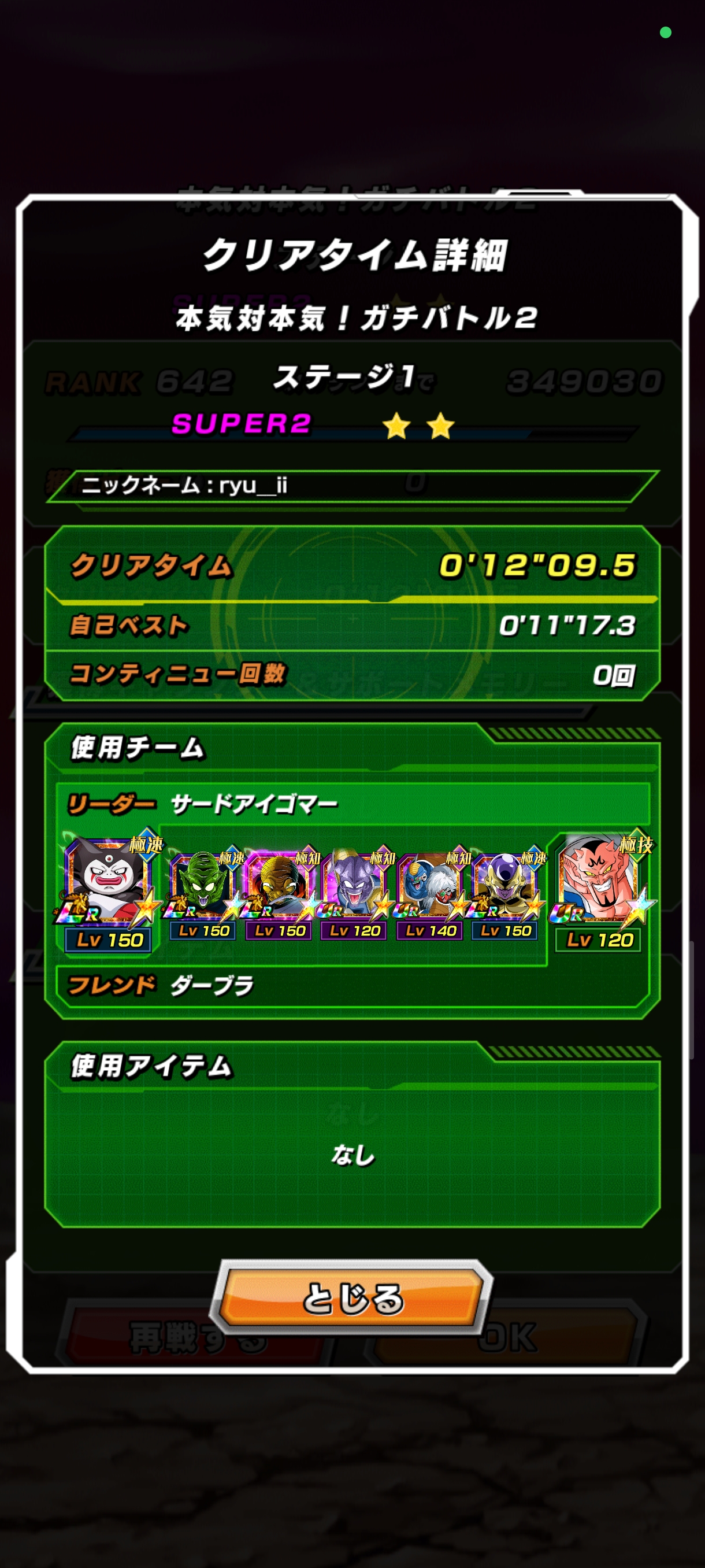 • 9ターンかかったけどゴジータが回避してくれるのと、ガーリックJr.が固かったこともあり倒されずに済んだ感じ。復活せずに終わることができた。