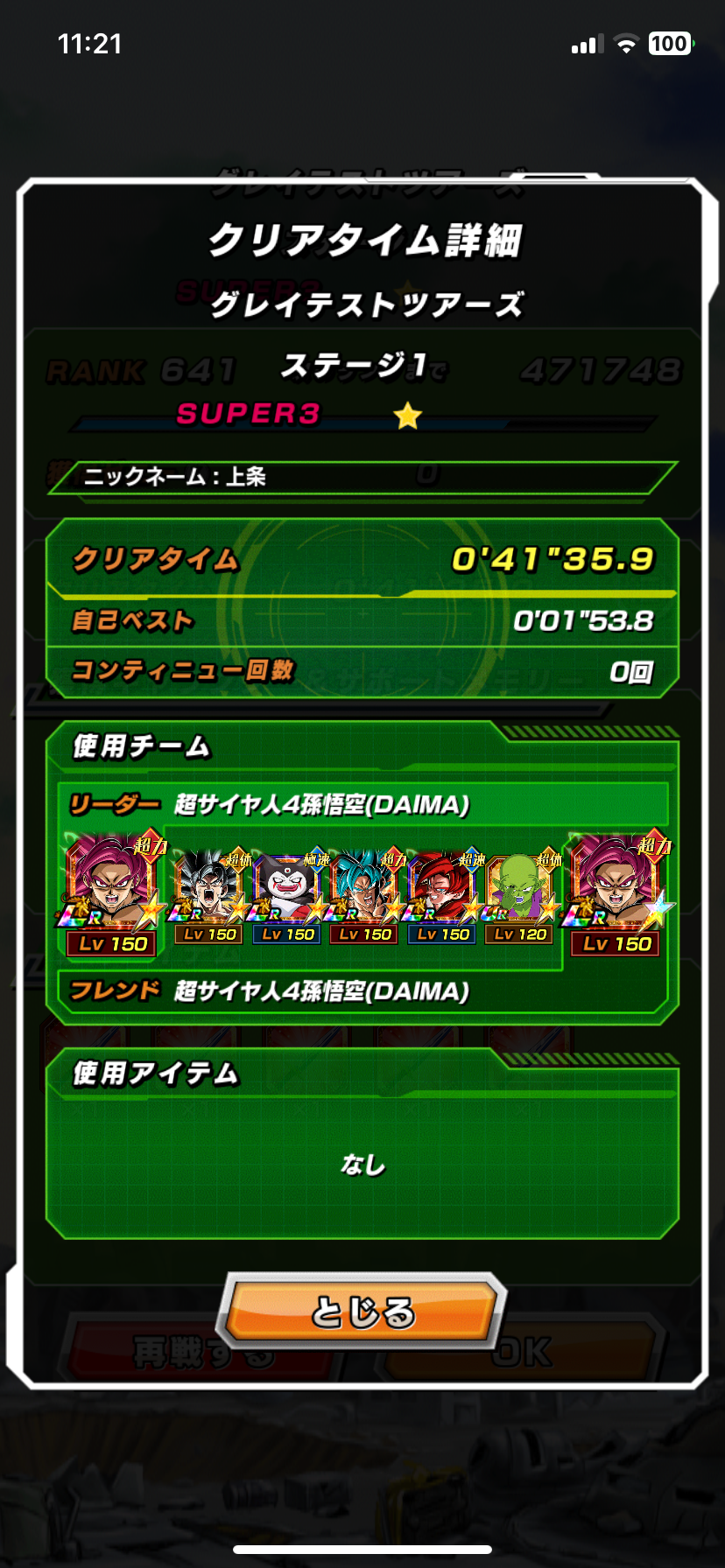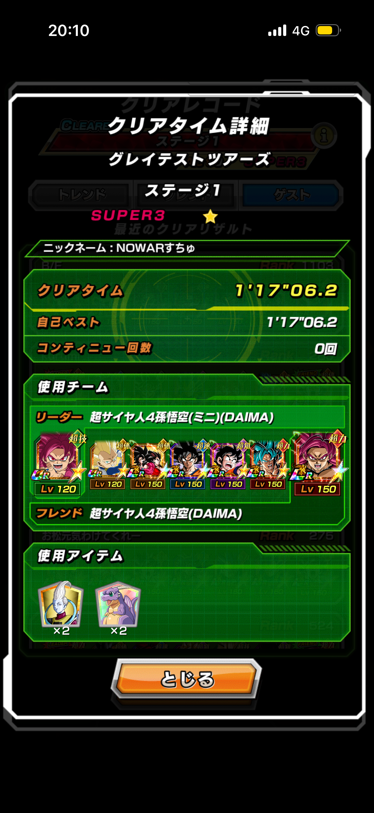 ダイマ悟空4サンド自前無凸、ダイマベジ3無凸、リバチェン超コンビ、リバチェン身勝手1凸、リバチェンGTベジ4一凸、鉄器悟空2凸でボコボコにされんだけど、