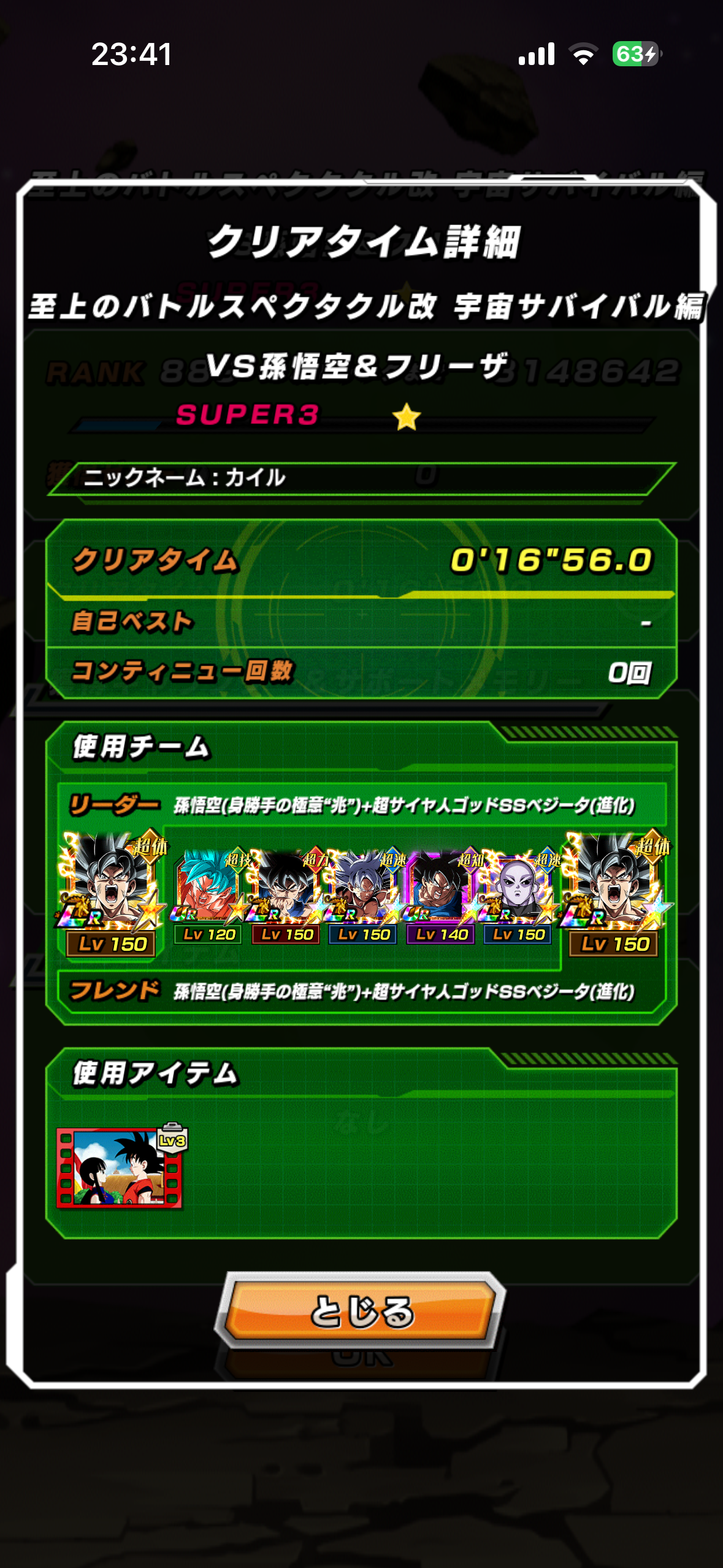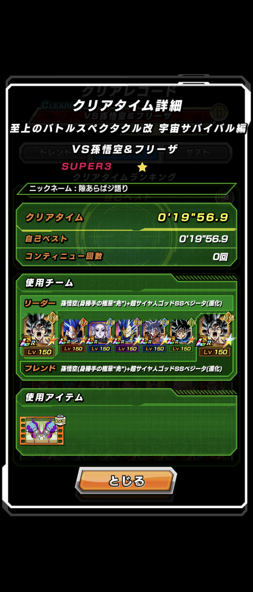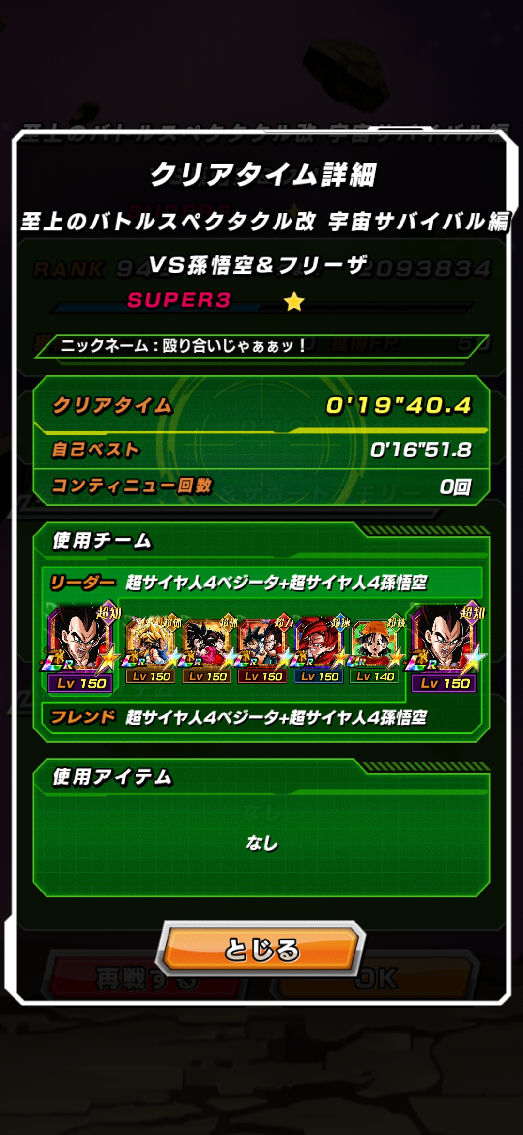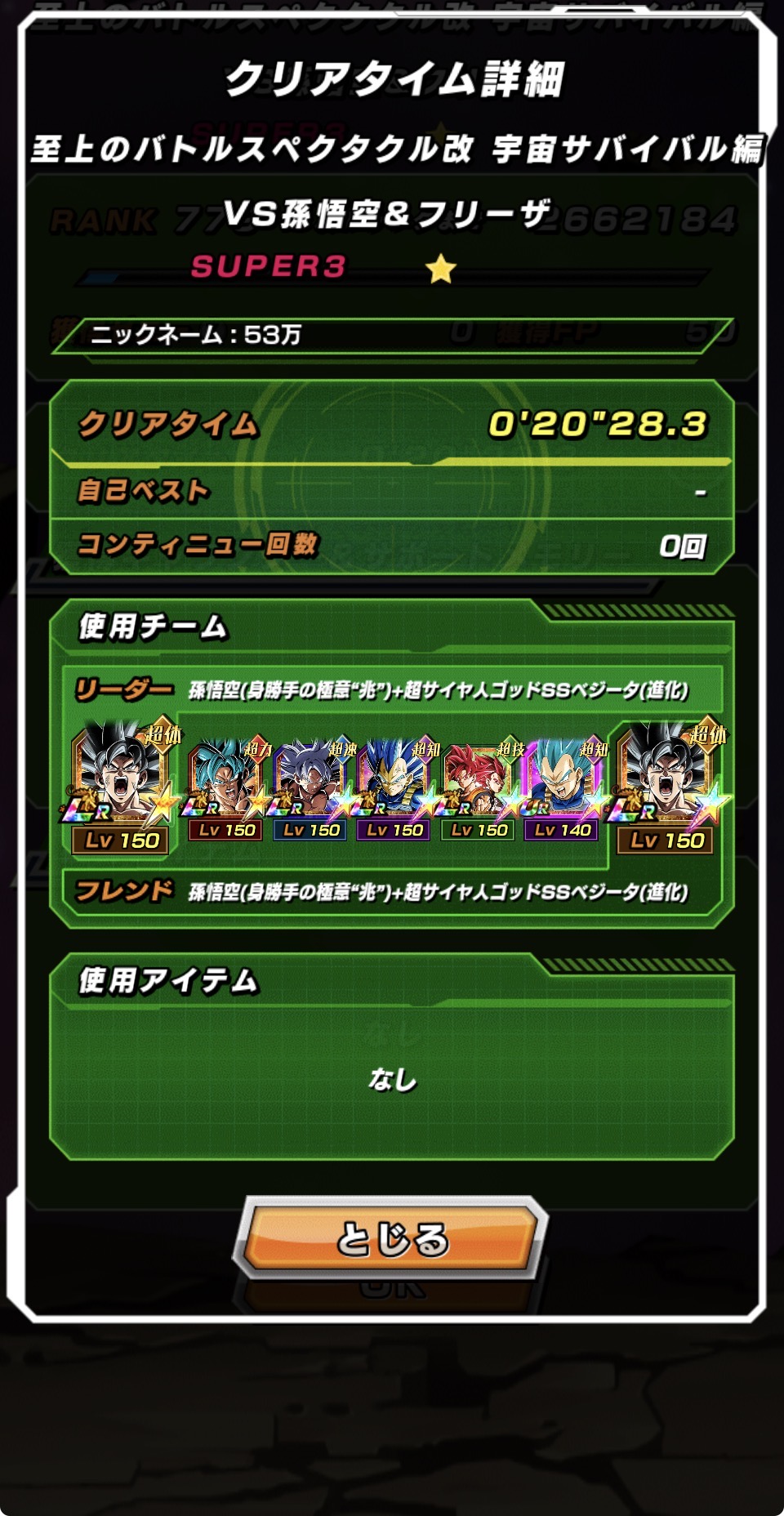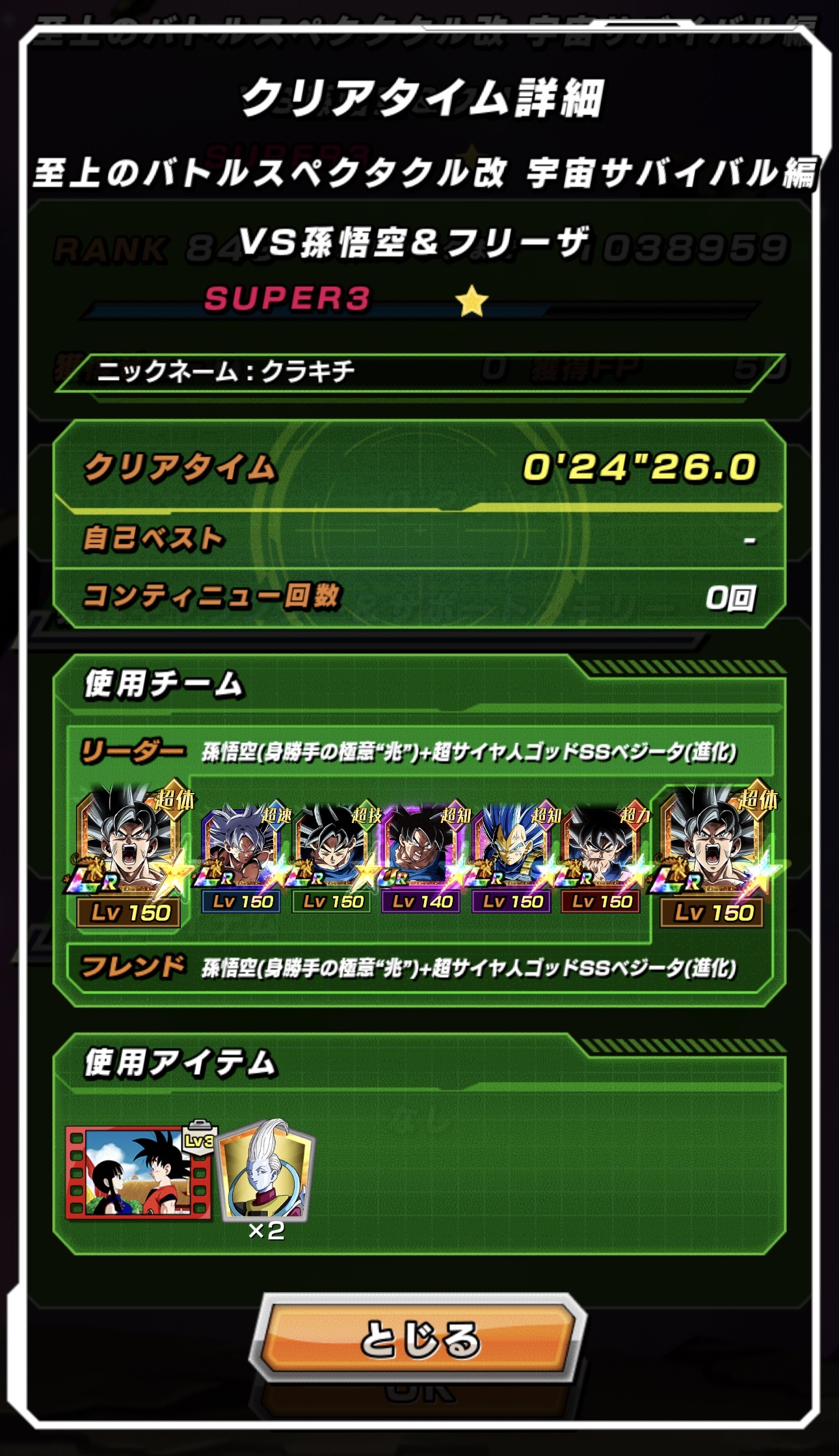 ゴクフリが50%以上ある時に速身勝手が避けなさ過ぎて、残りHP4000になったけど、そのターンで50%以下にしたからここから勝負と思いウイス2枚がけしてカスみたいなHPを削られないようにしつつミギキラのベジータでアクティブ撃って、次のターンで倒せたらいいなと思ってたら残り50%弱を一気に削って倒した。復活せず、速身勝手ともう一体のミガキラはアクティブ未発動。
