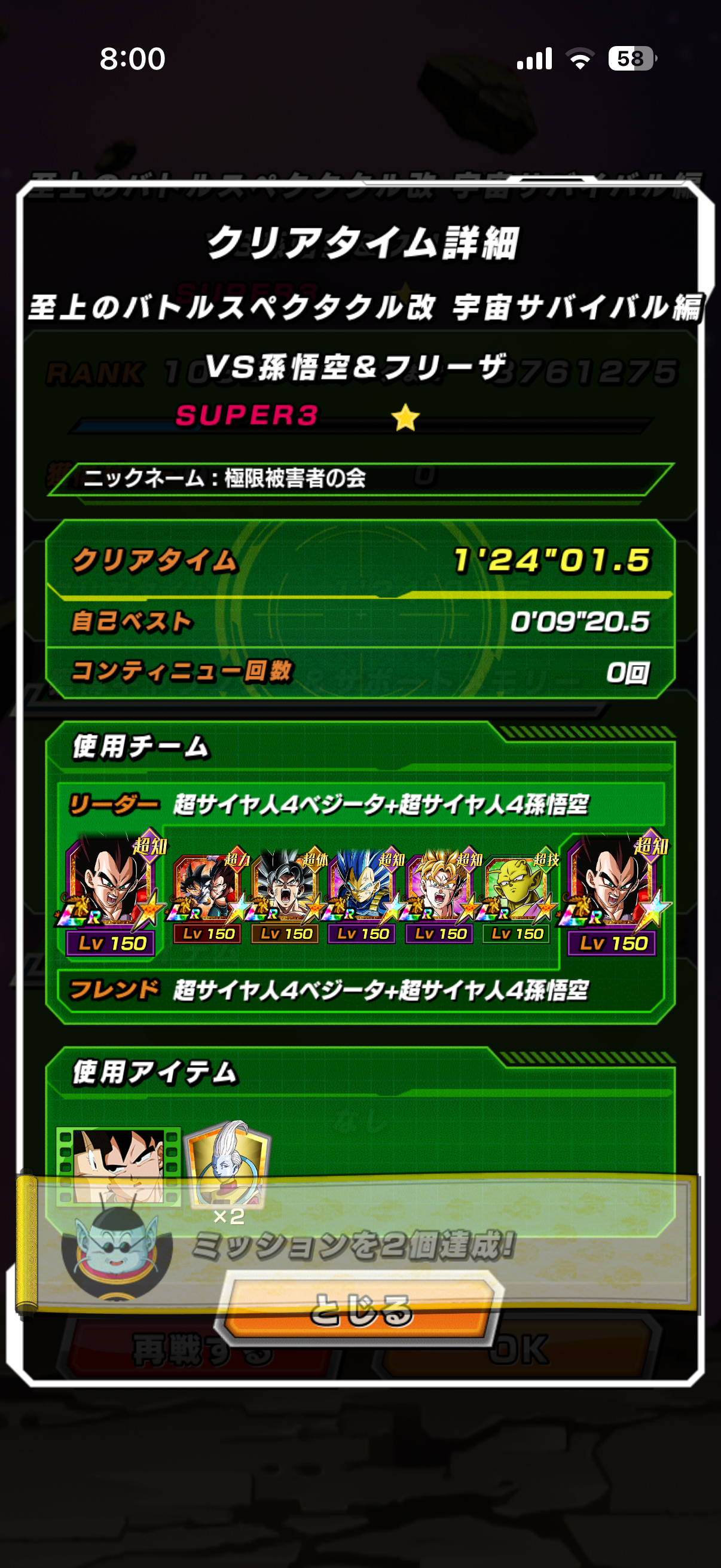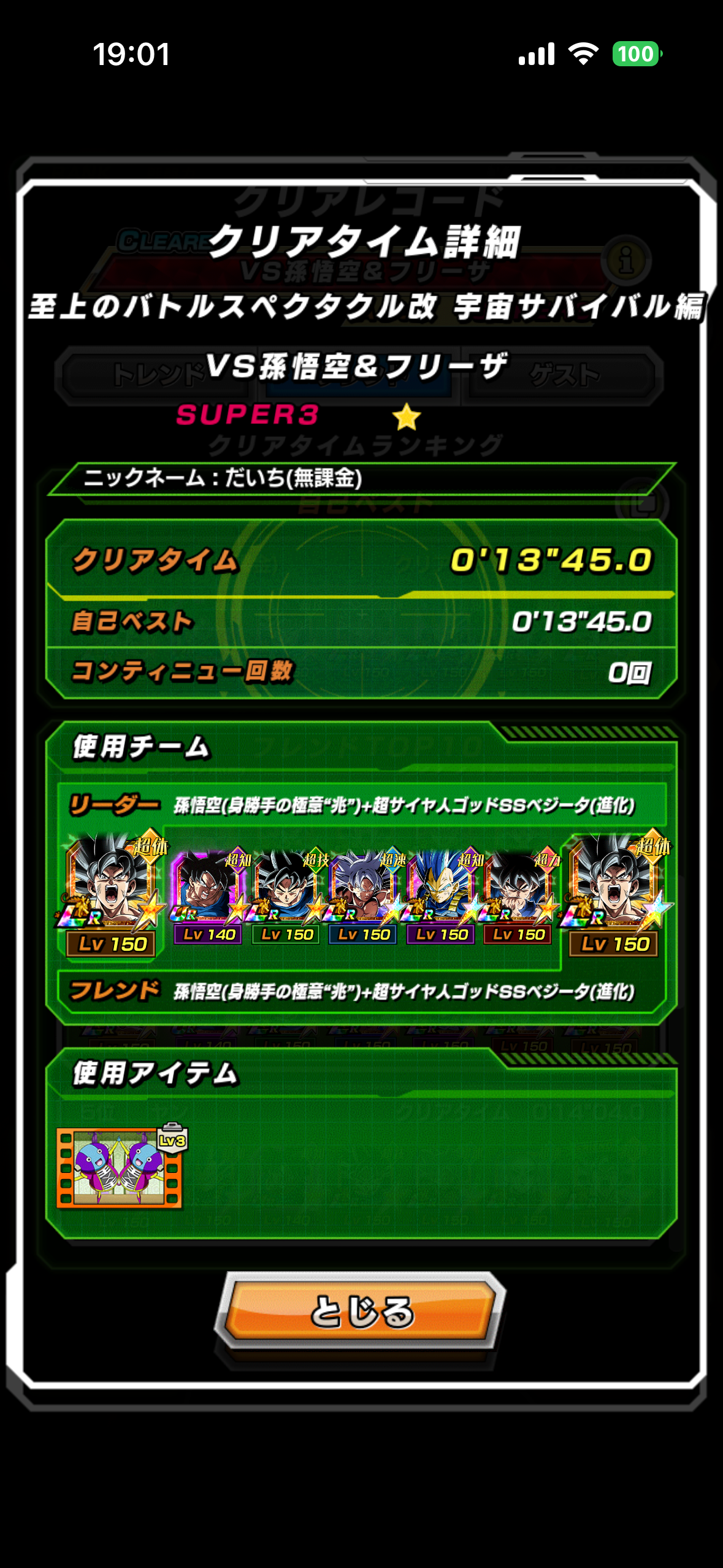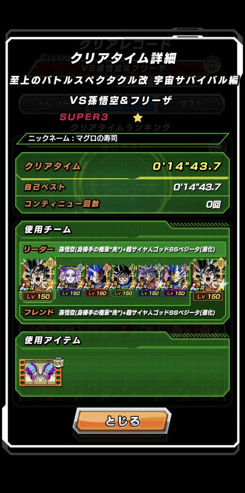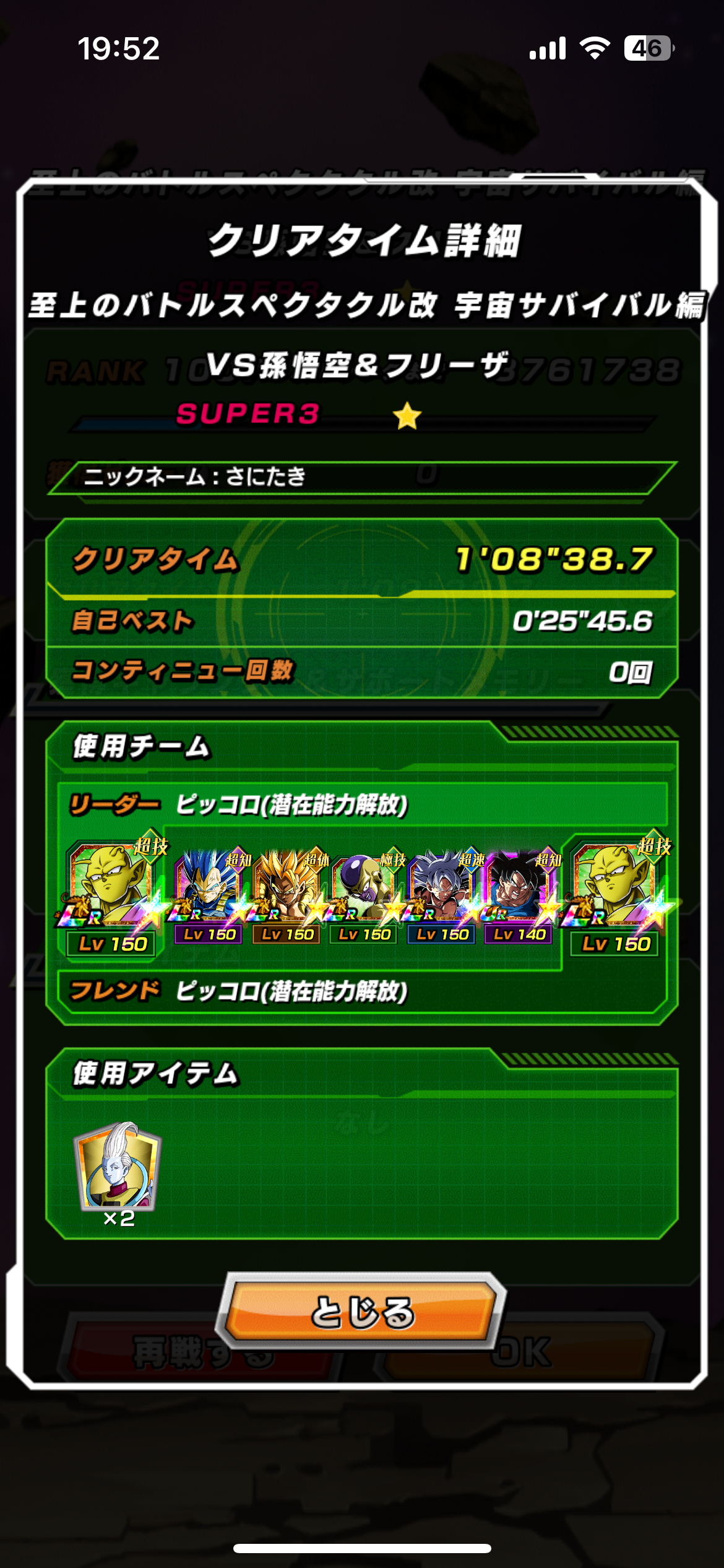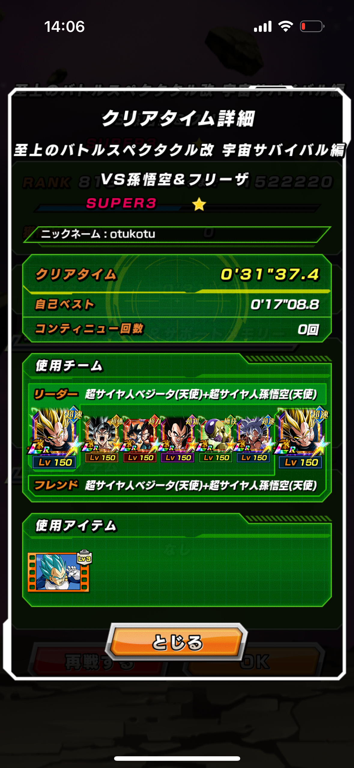 ゴクフリが50%以上ある時に速身勝手が避けなさ過ぎて、残りHP4000になったけど、そのターンで50%以下にしたからここから勝負と思いウイス2枚がけしてカスみたいなHPを削られないようにしつつミギキラのベジータでアクティブ撃って、次のターンで倒せたらいいなと思ってたら残り50%弱を一気に削って倒した。復活せず、速身勝手ともう一体のミガキラはアクティブ未発動。