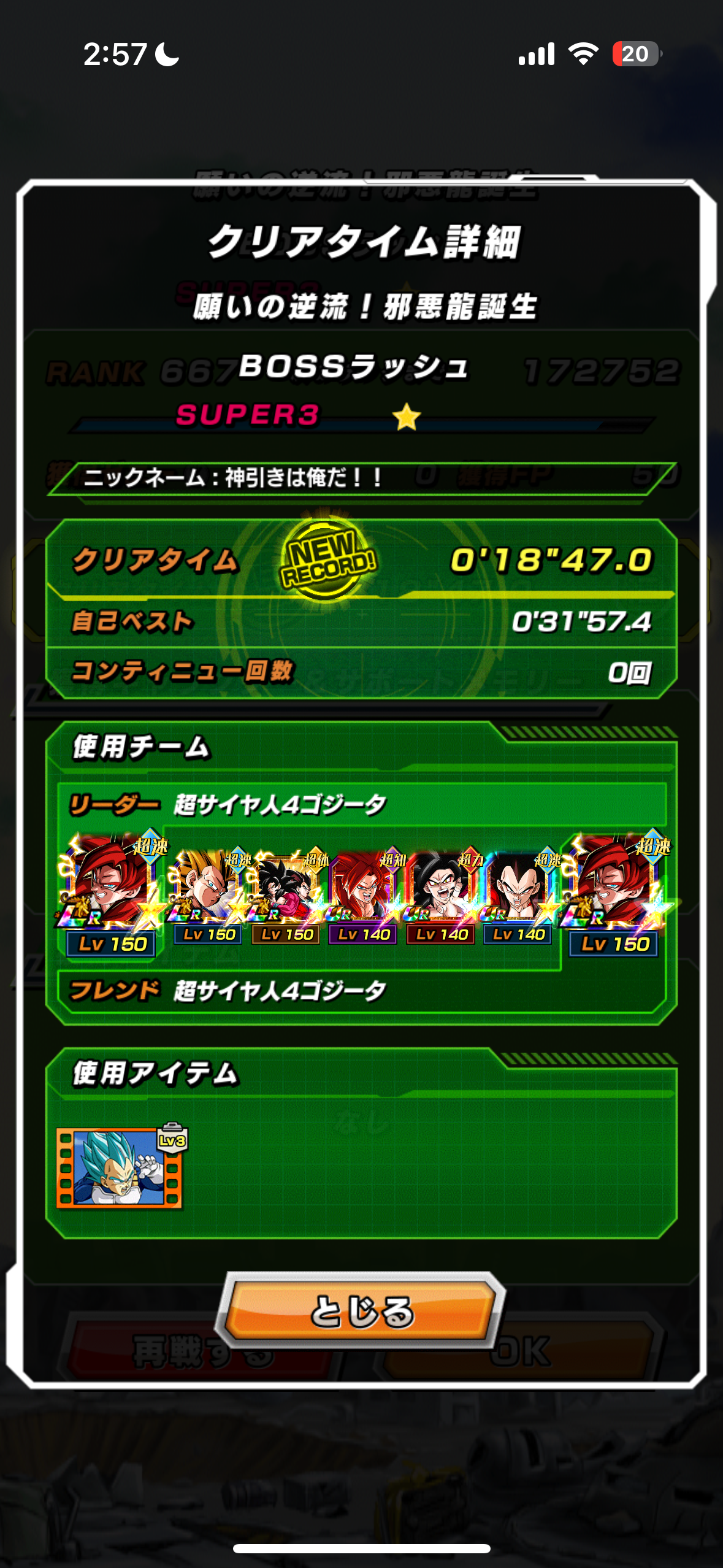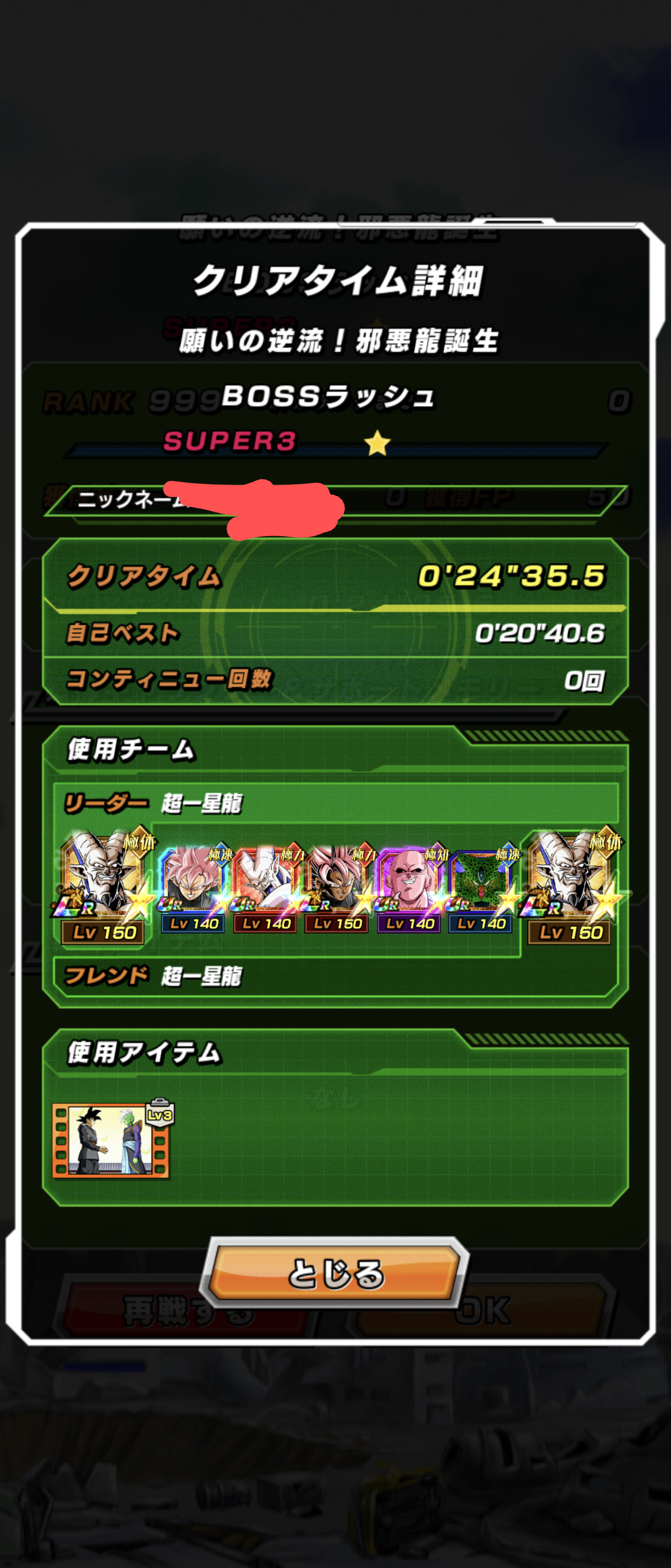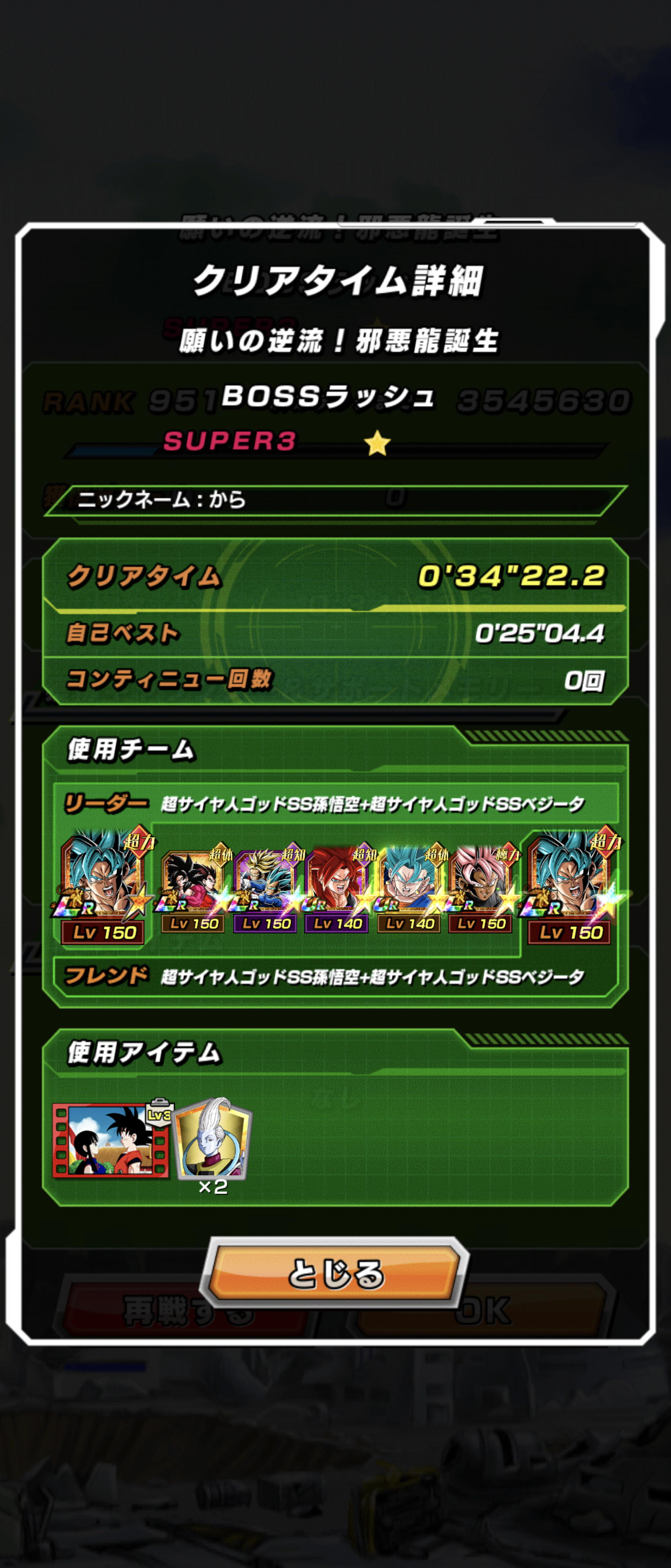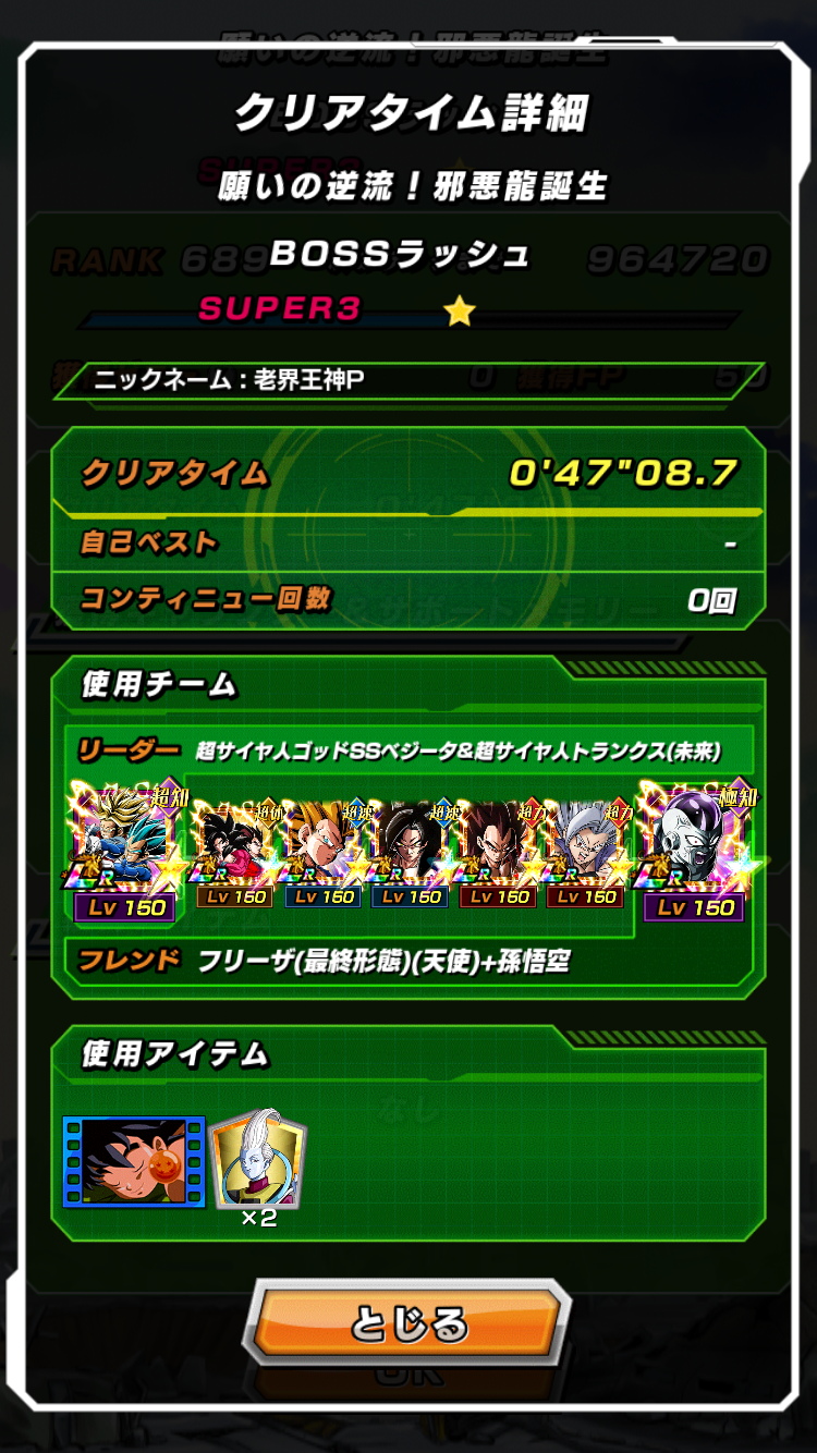 1番手を超極限悟空とフレンドゴジ4で回せば、気絶や必殺封じの心配がない2番手で7周年ゴジータと10周年大猿悟空の無限上昇積めまくれました。最終ラウンドの超一星龍が固いので7周年が全ガ切れるまで変身遅らせて無限上昇積ませて、全体攻撃対策でそこでウイス2体使いました。