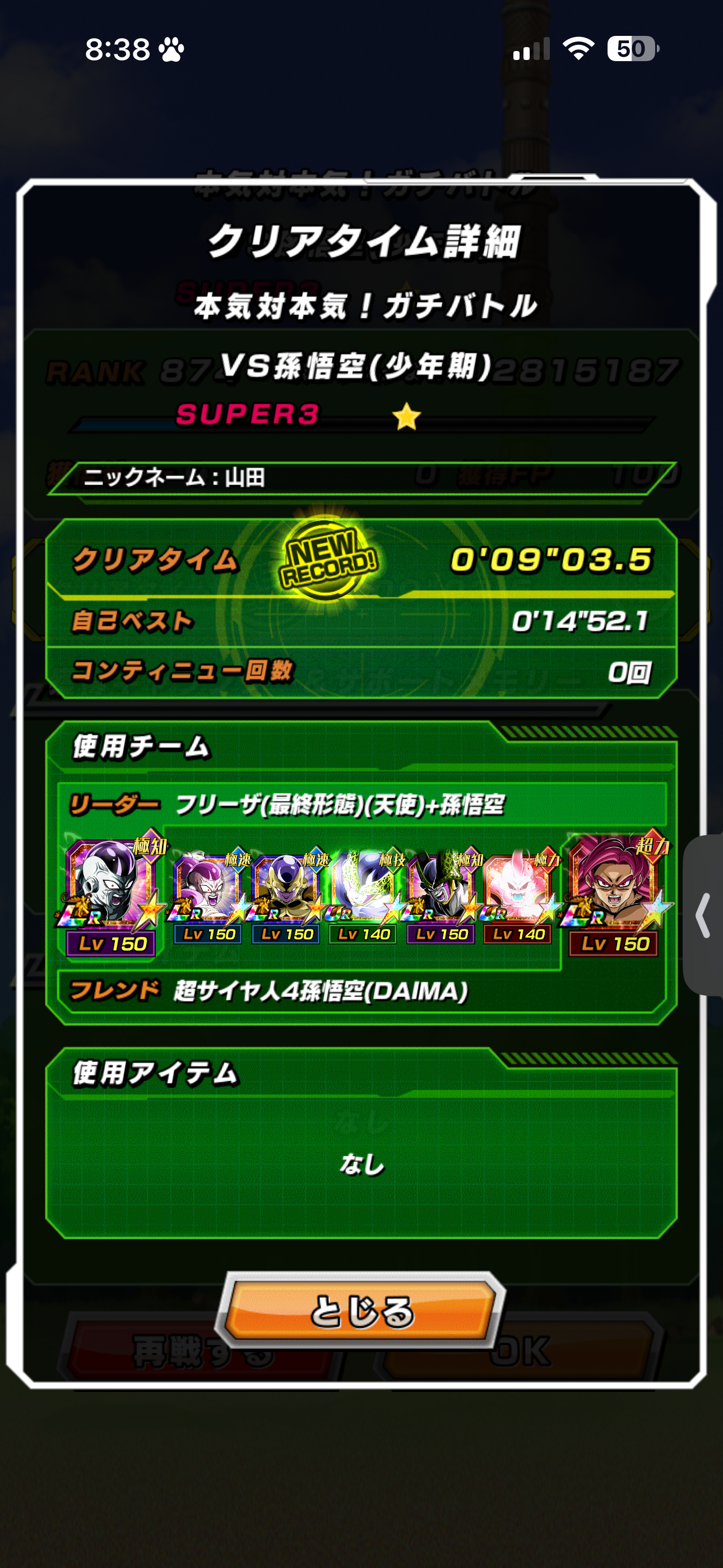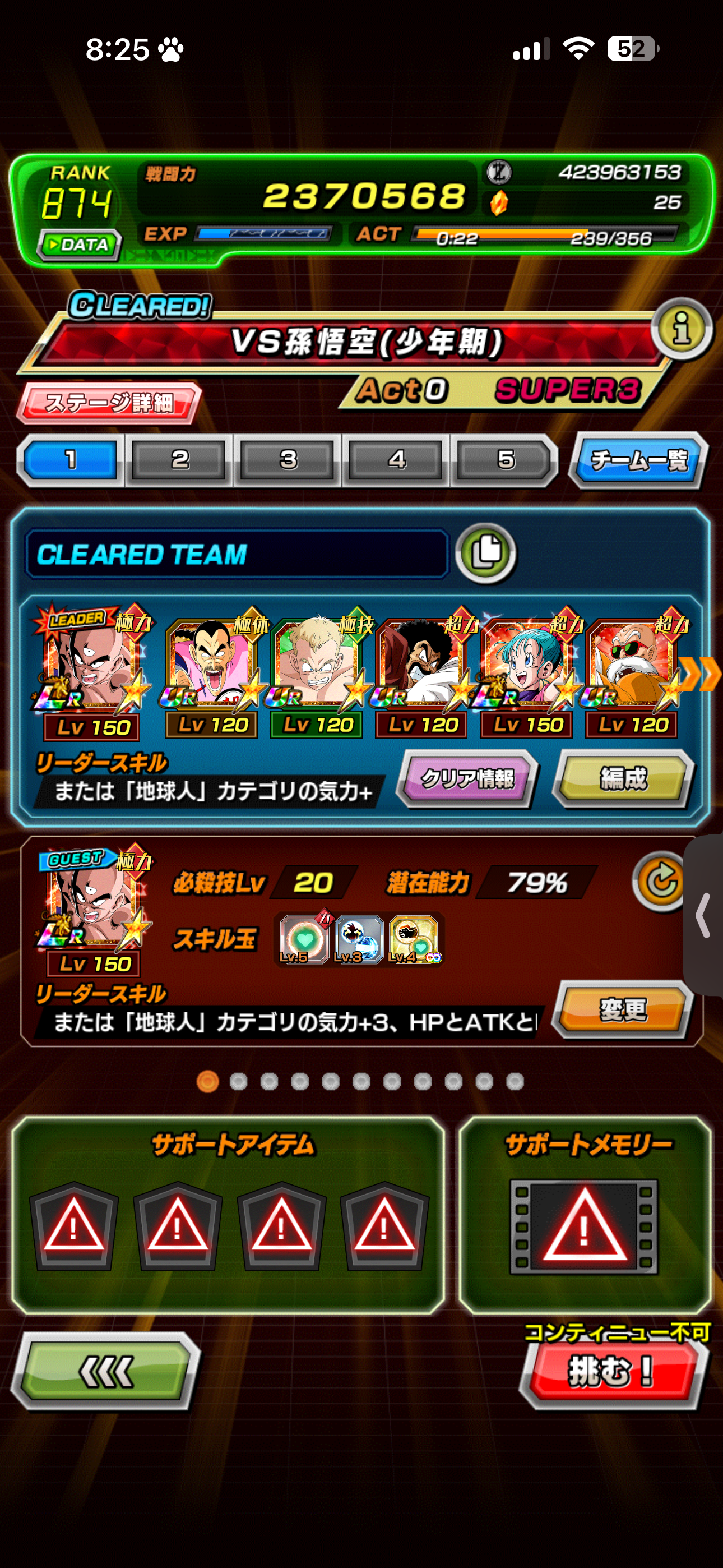 5ターン以内クリア。5ターン目に技と力のベジットに変身して、ブロリーも変身してアクティブ発動。力ベジットはオマケだから別に誰でもいい。ダメージソースは技悟空(ラストはベジットで反撃)、ブロリー(返信前から削ってくれる)、体ベジータ、界王拳悟空。ブルーベジータは役立たず。