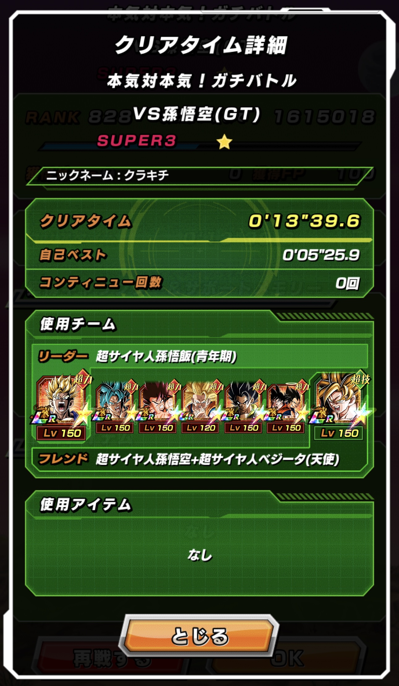 力染め。6ターン目にベジットになったけど削りきれず、7ターン目に悟飯のアクティブで吹っ飛ばす。