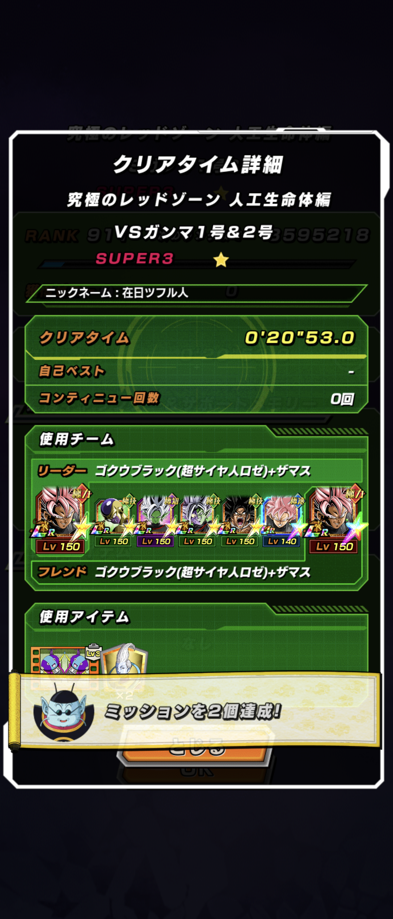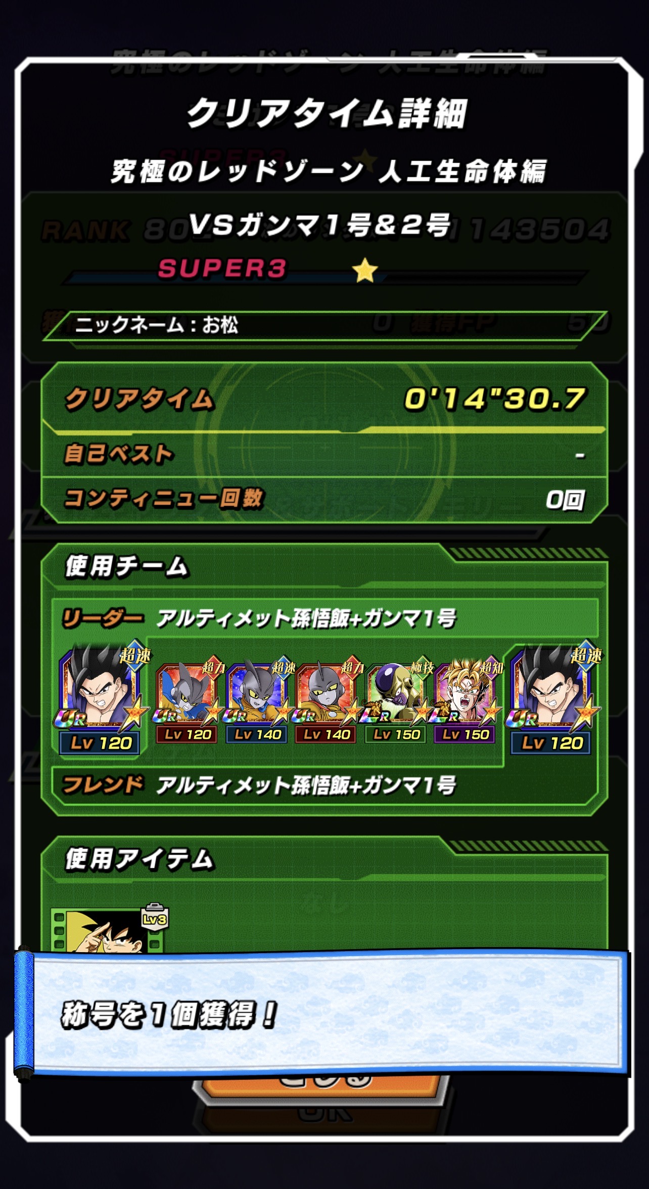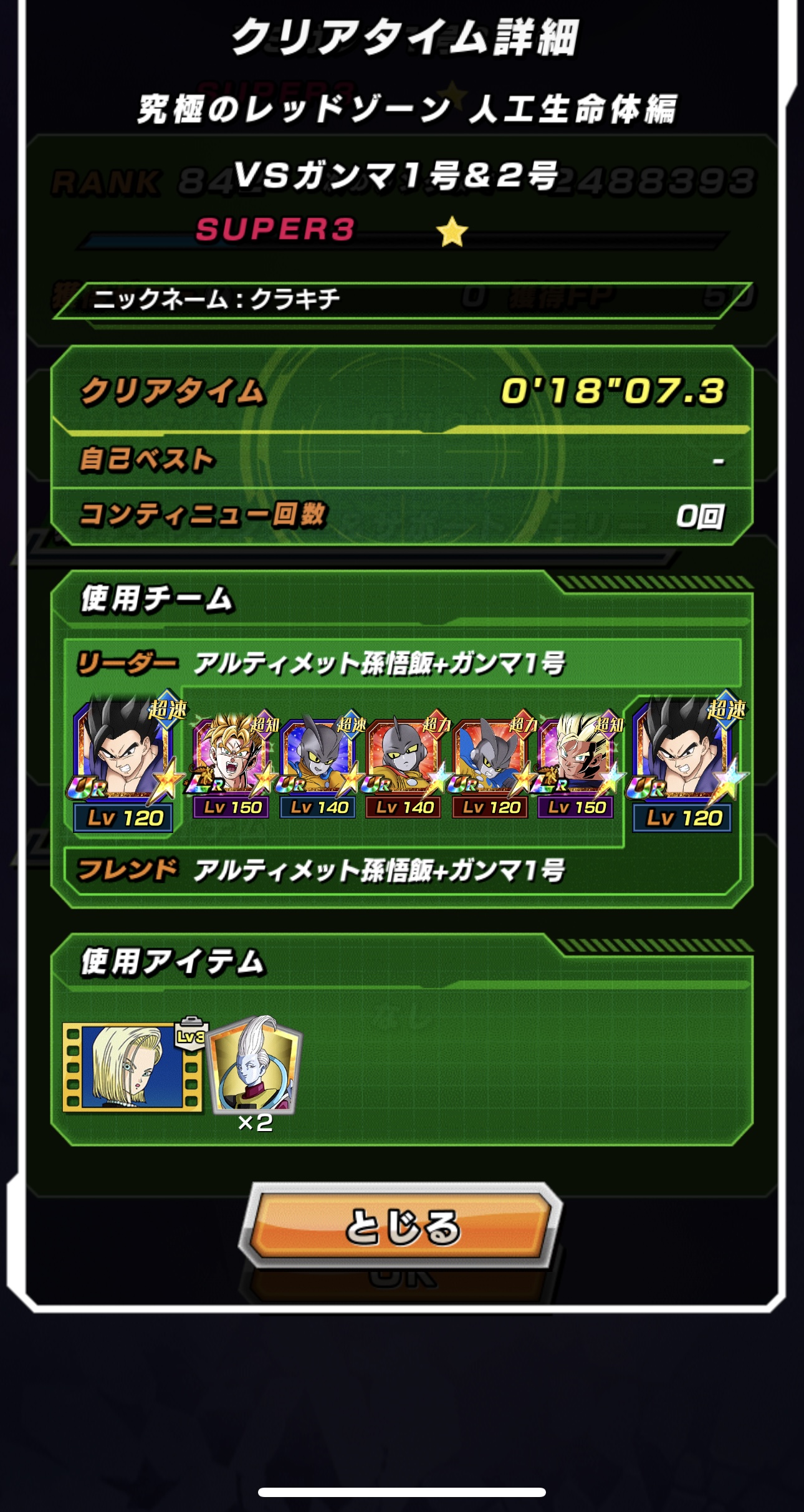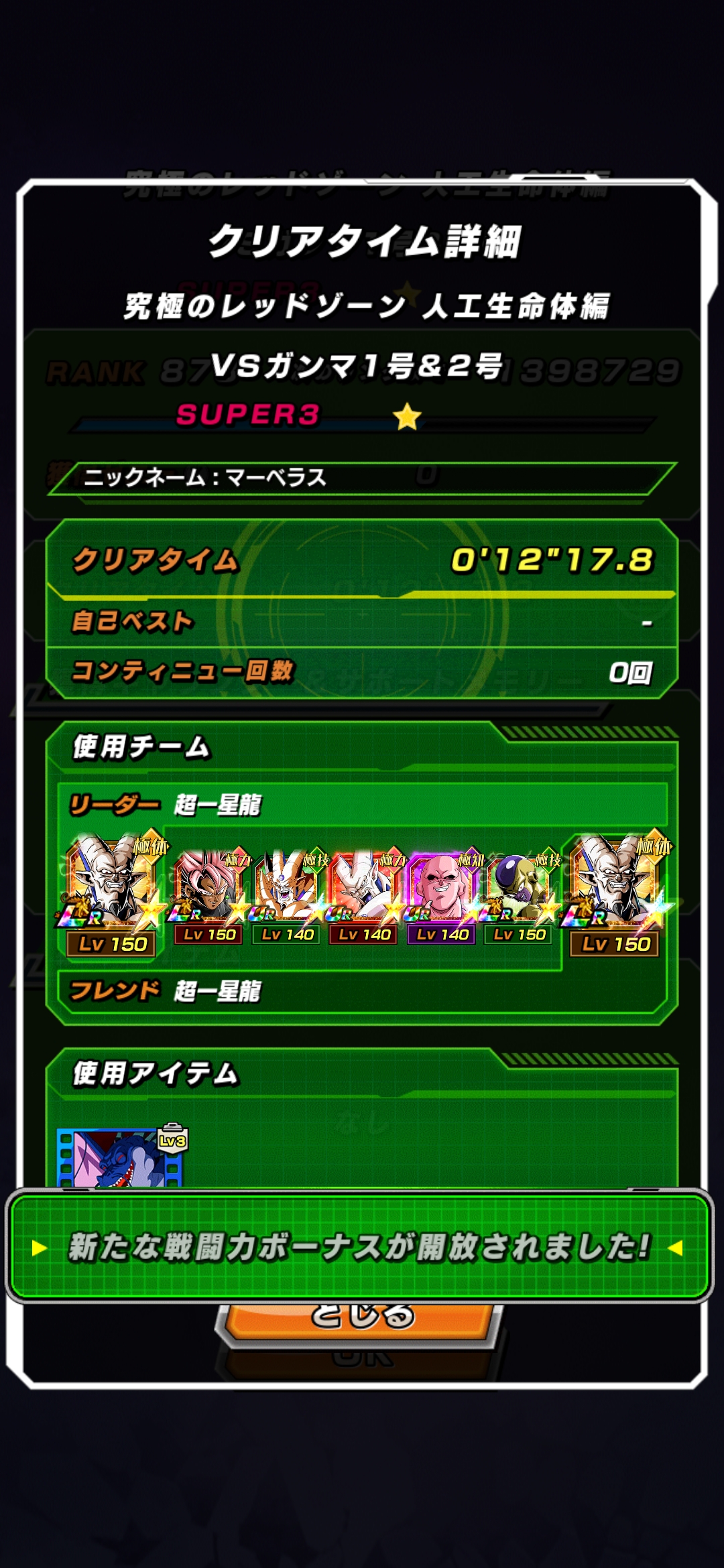 未来悟飯復活することなく終了。イチゴハンのアクティブは、他のキャラで爆弾によるダメージを喰らった後にHP回復できるので安定剤。
