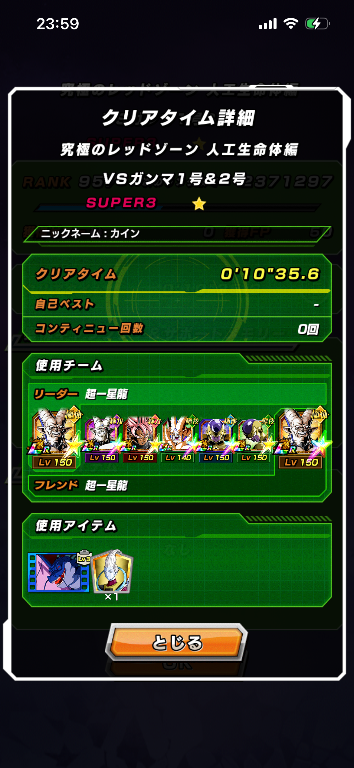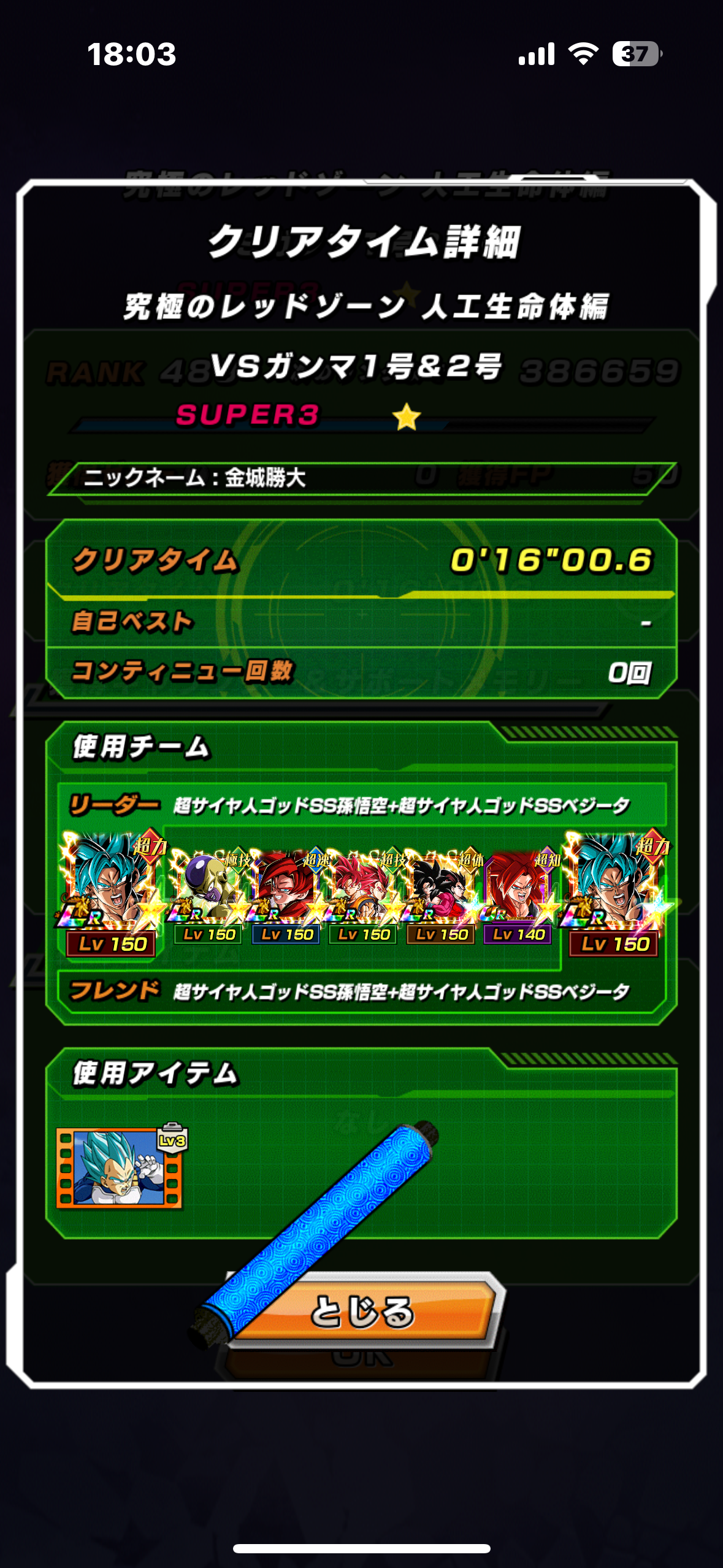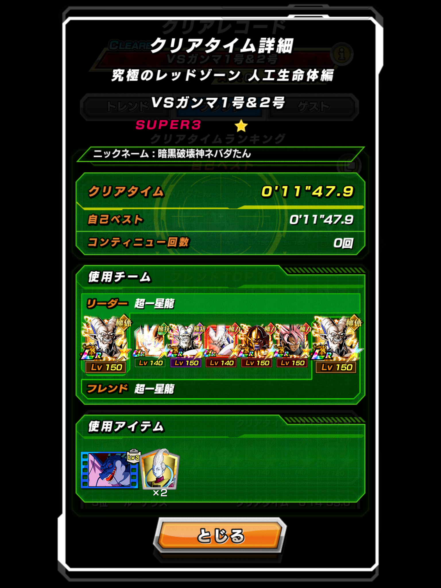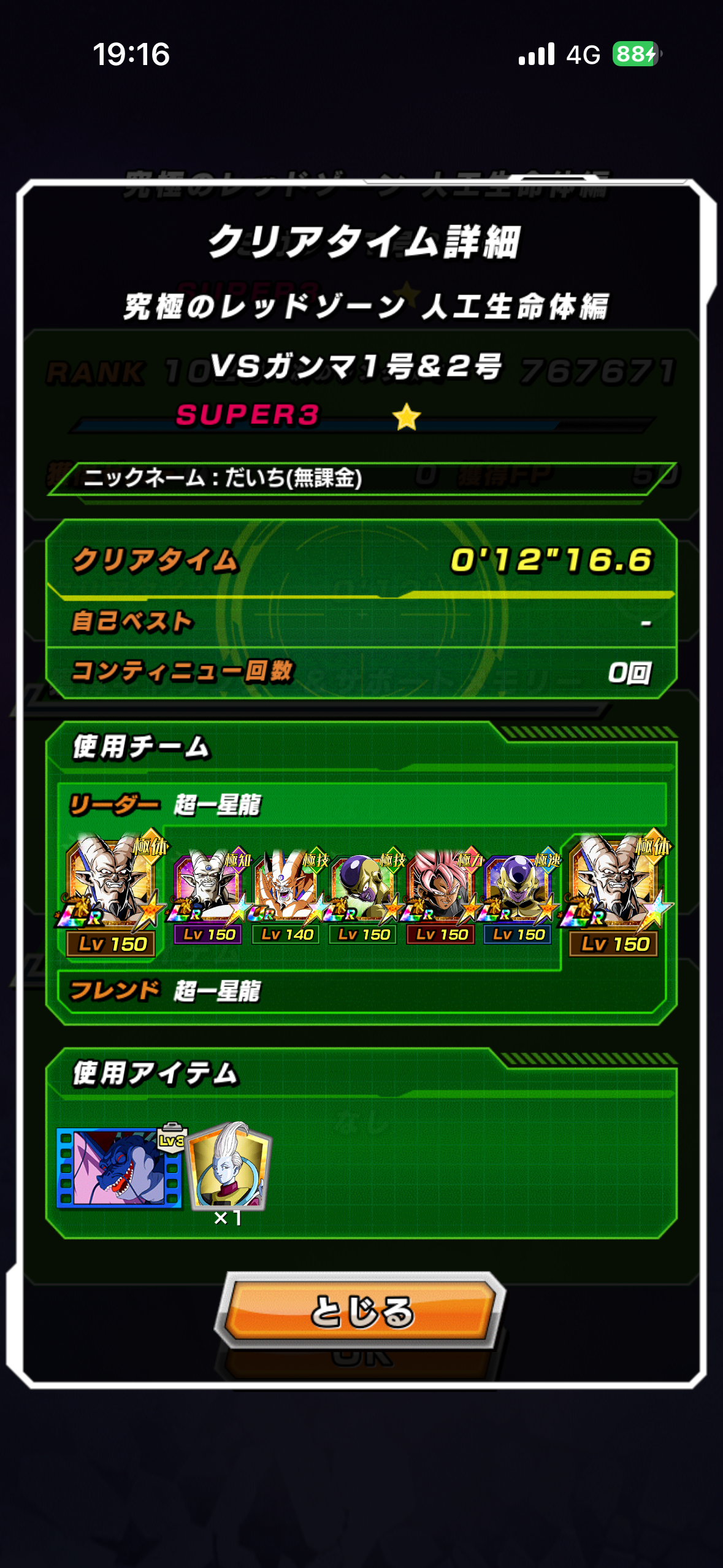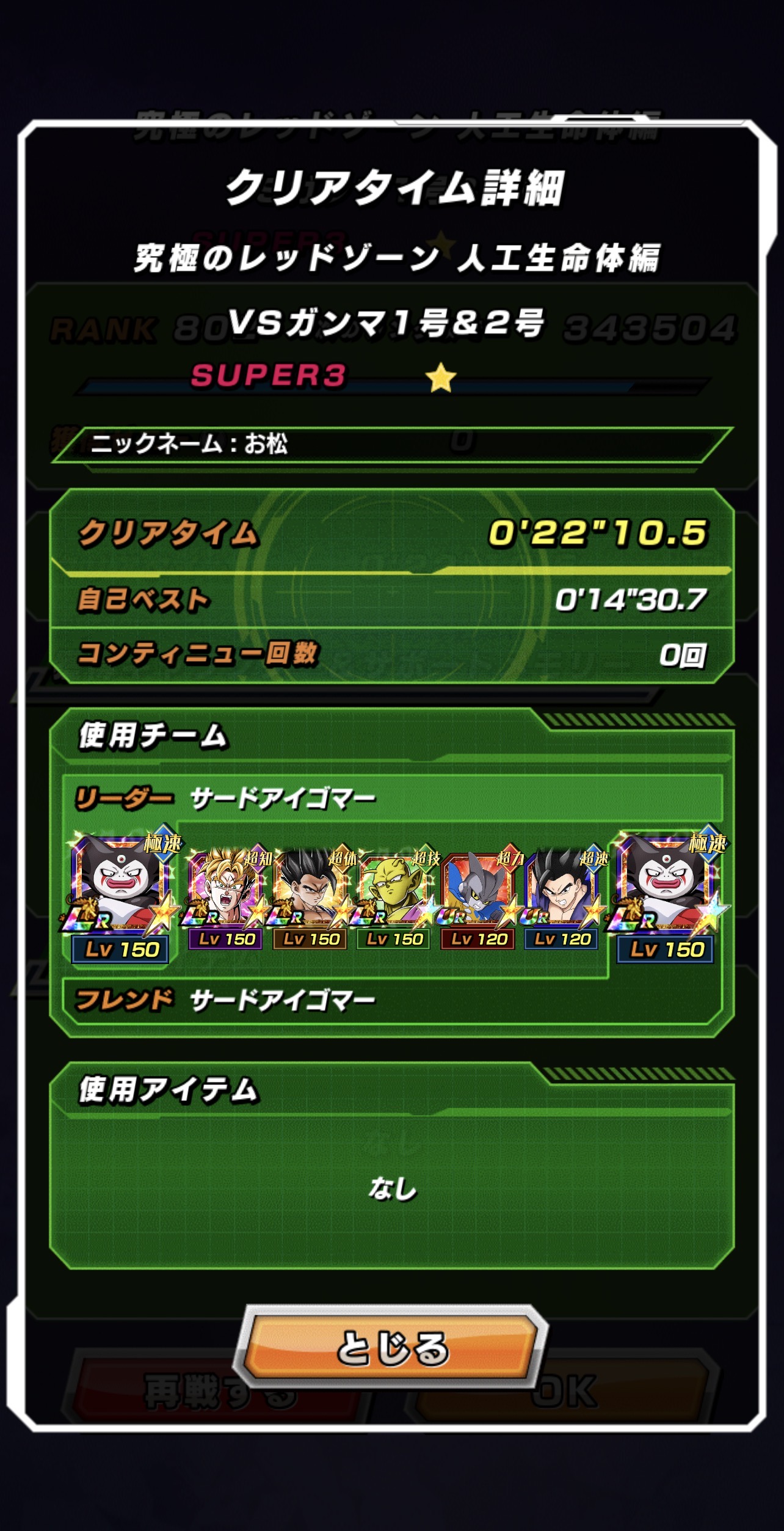 未来悟飯復活することなく終了。イチゴハンのアクティブは、他のキャラで爆弾によるダメージを喰らった後にHP回復できるので安定剤。
