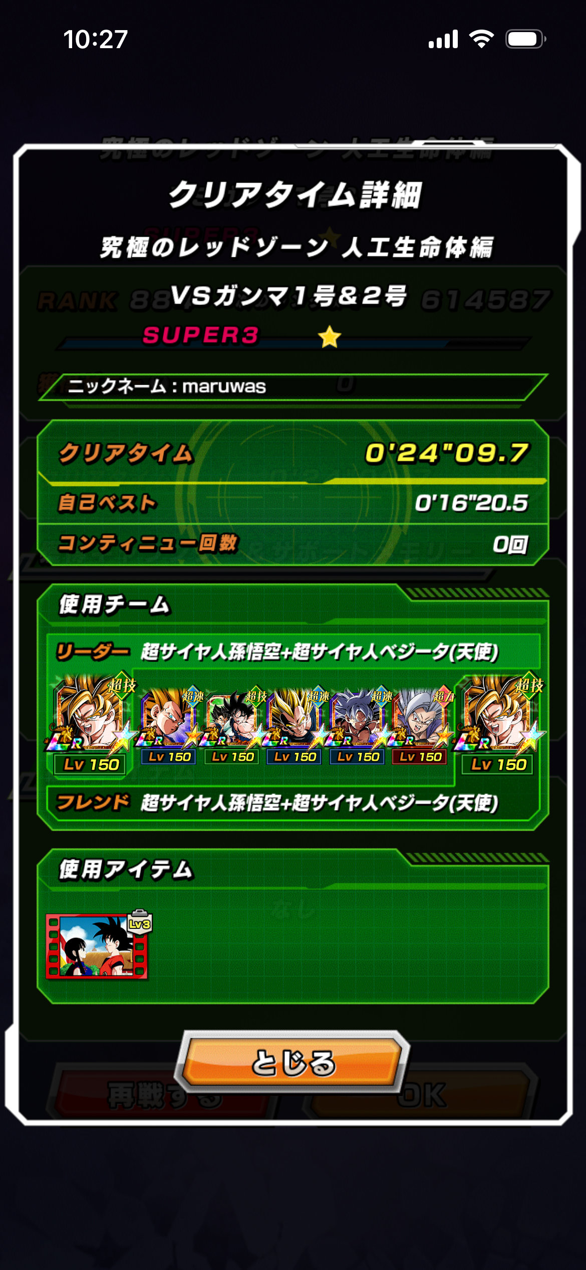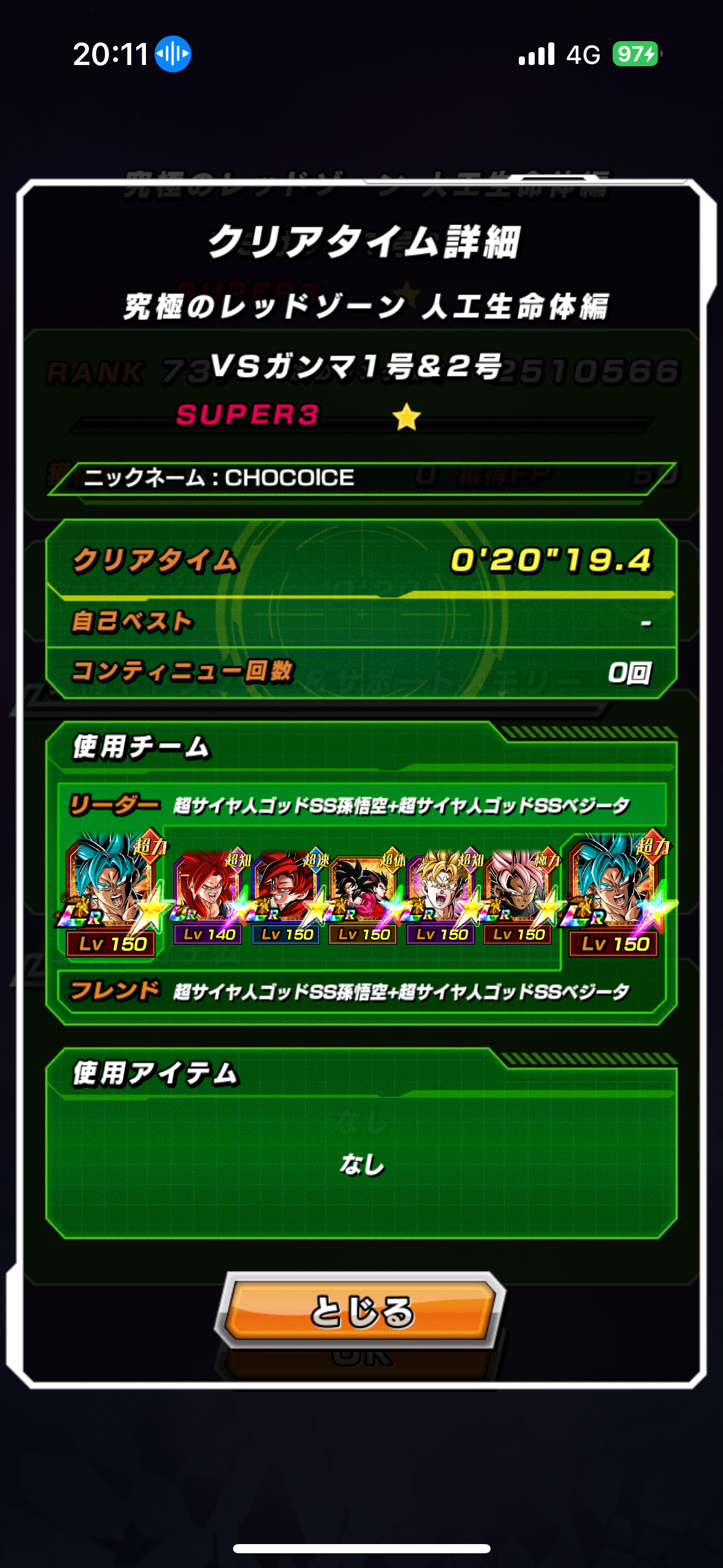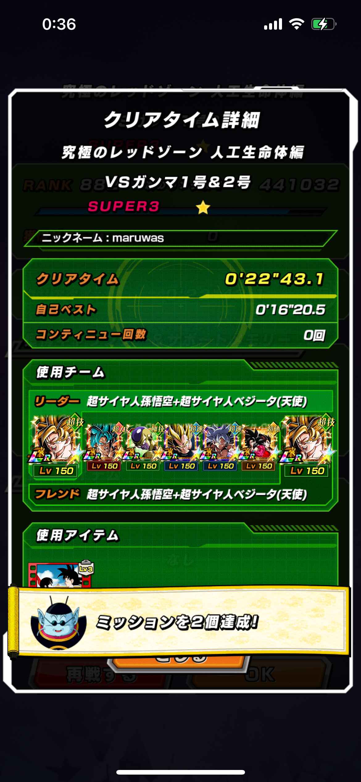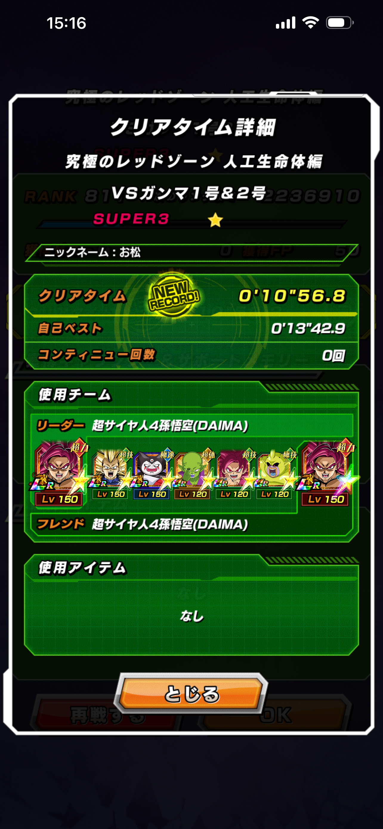未来悟飯復活することなく終了。イチゴハンのアクティブは、他のキャラで爆弾によるダメージを喰らった後にHP回復できるので安定剤。