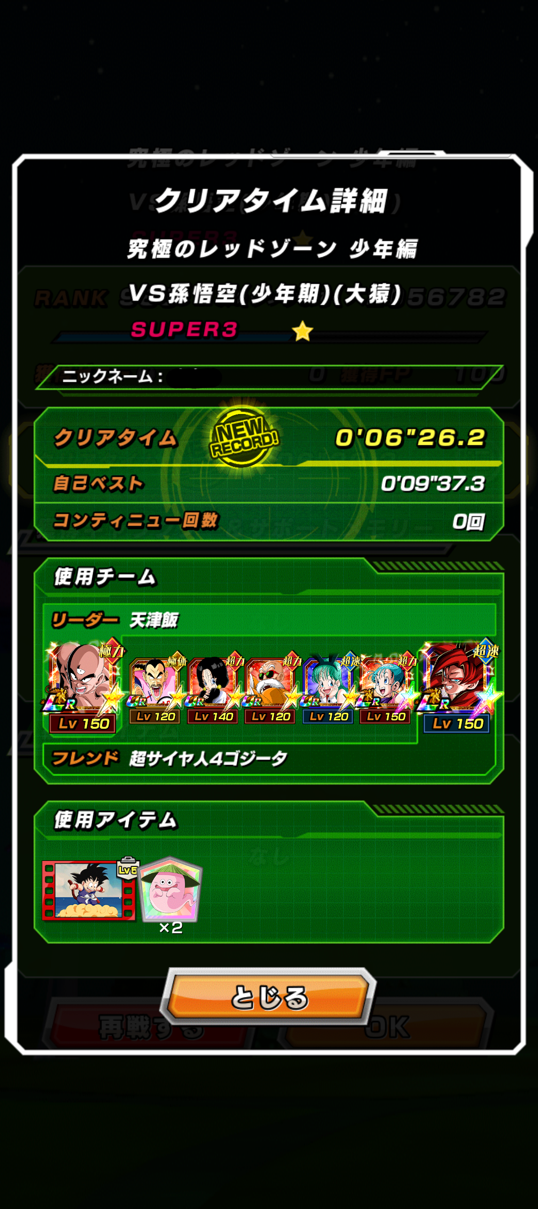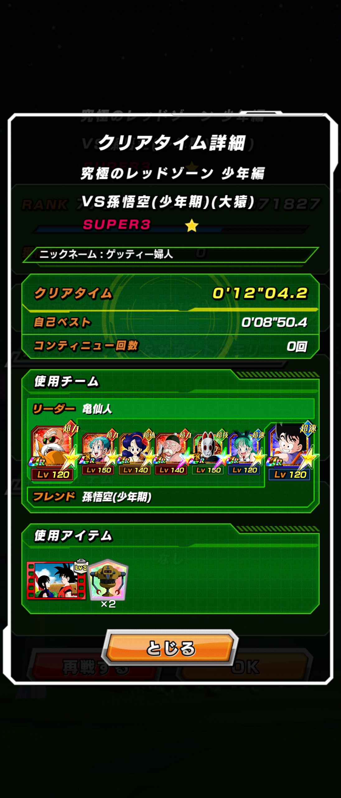 ブヨンや大魔王や桃白白はアイテム使えば実質無敵、4ターンはウイスで持たせて後はフレンドの少年悟空・自前の極限少年悟空で削り切るのみです。5ターン目に食い込んでも1番手のフレンド悟空が消し飛ばしてくれます。