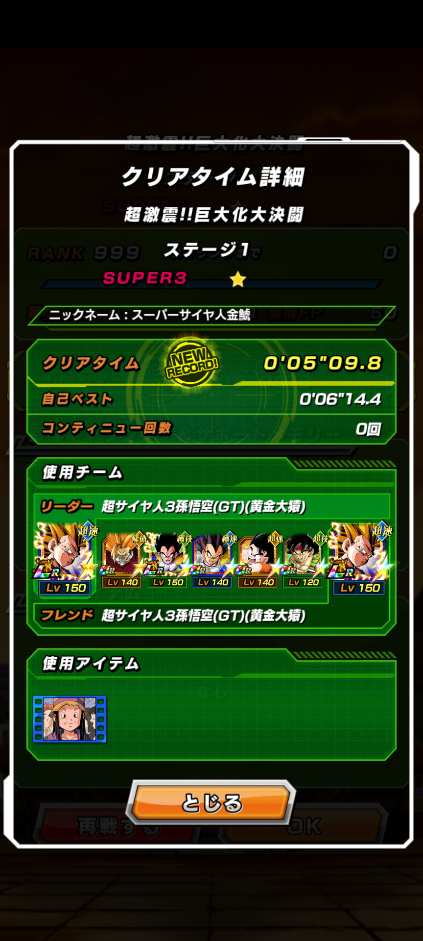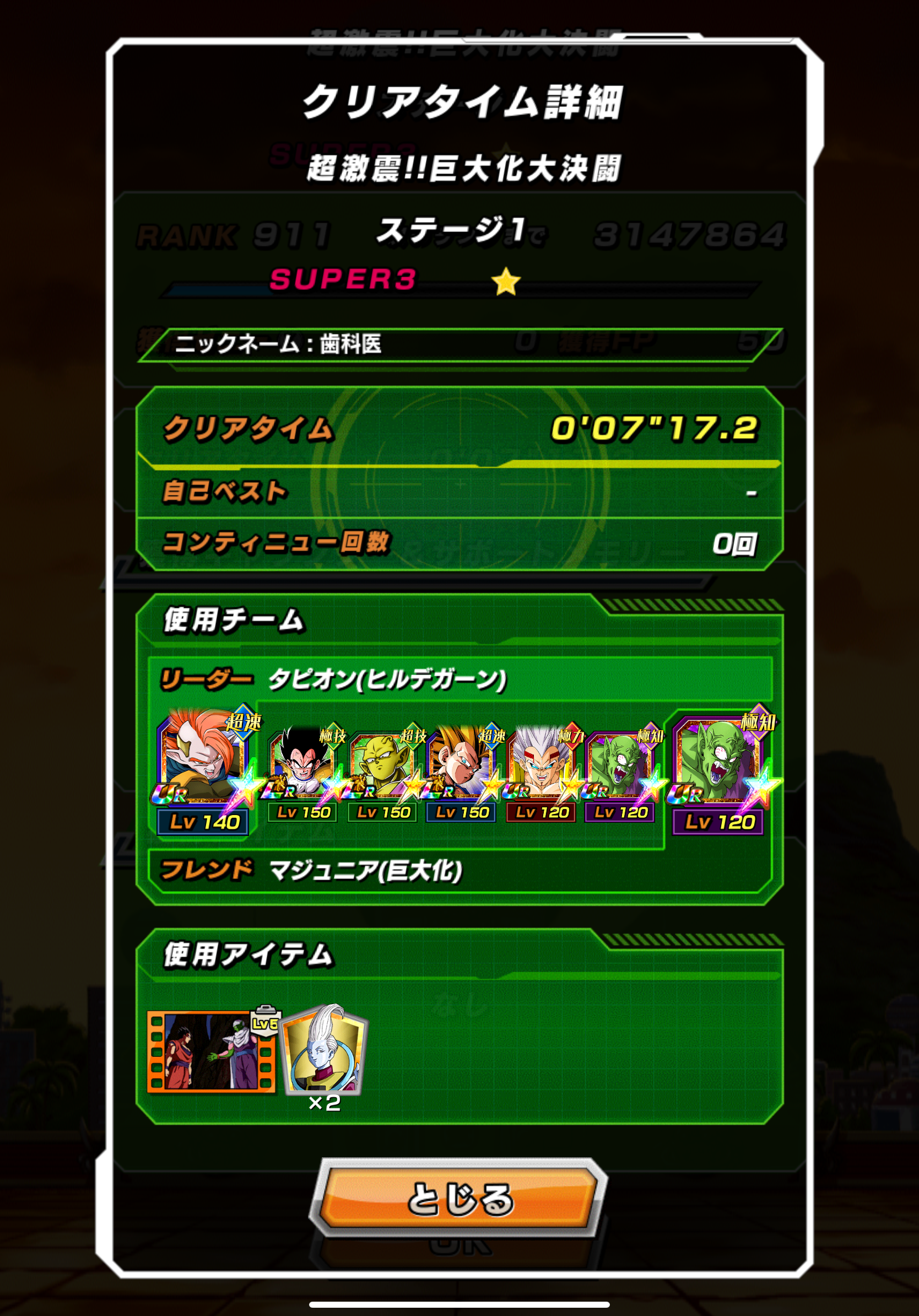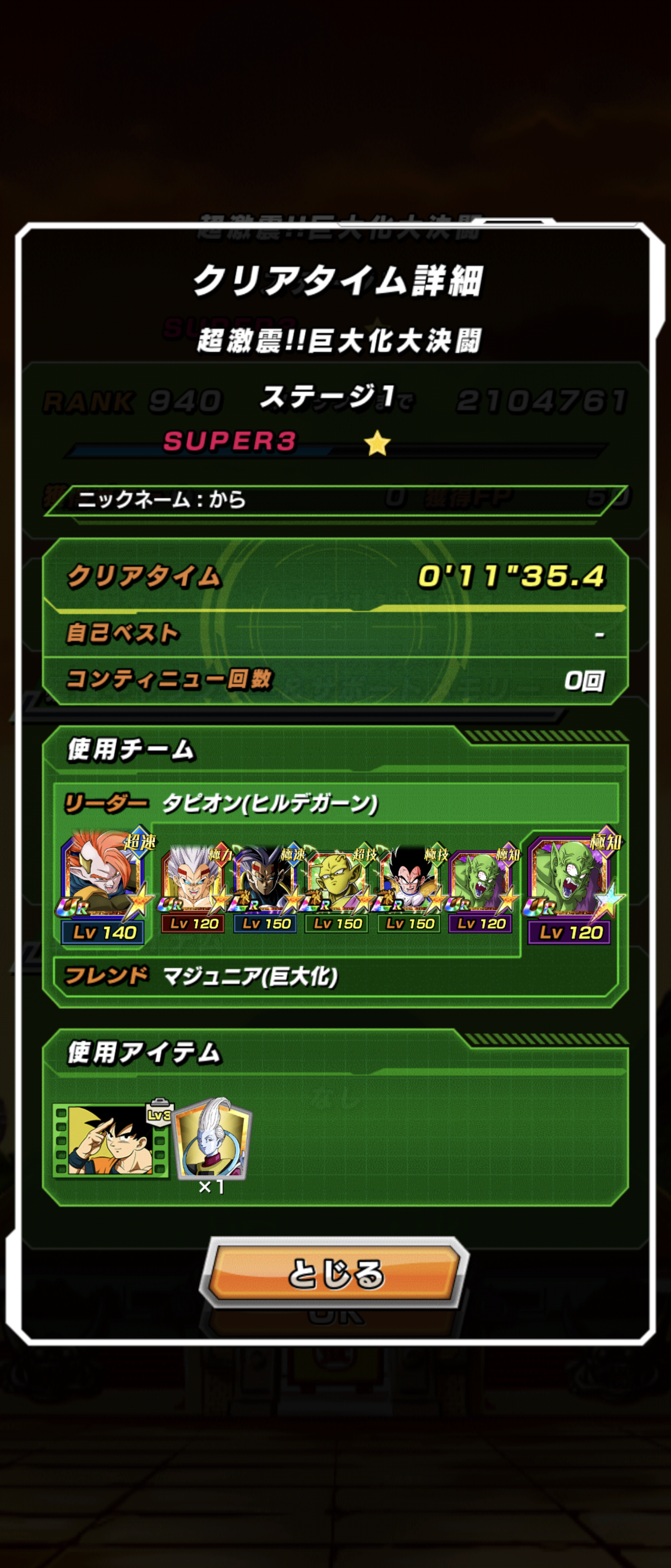巨大化クリア。タピオンか大猿ベジータが大猿悟空ターン初手に来るようにしてタピオンのリーダースキルで増やした巨大化回数を活かして2回連続で大猿化して大猿悟空ターンを丸々飛ばす。後はウイス使ってゴリ押しすれば勝てる。新キャラのベビーいるけど何もしてないからいなくても大丈夫