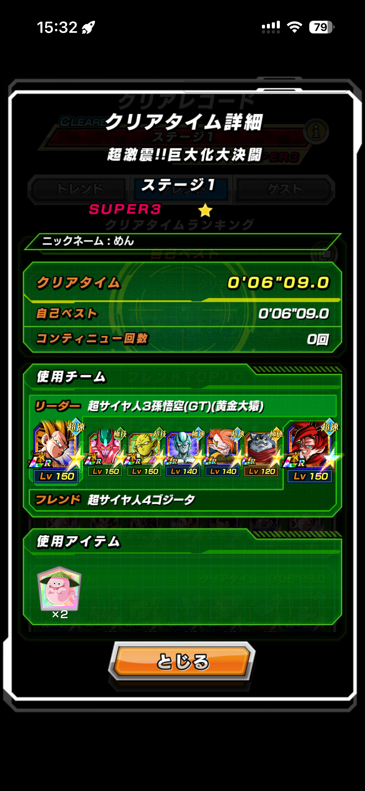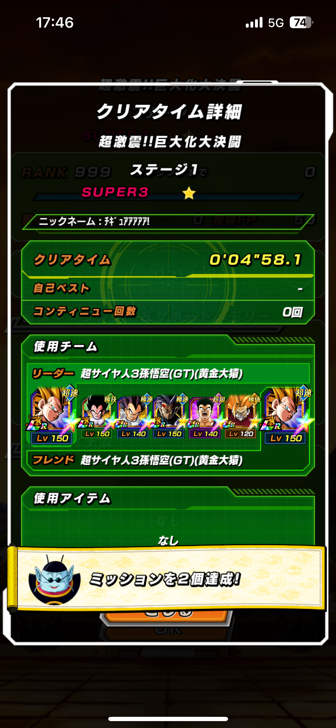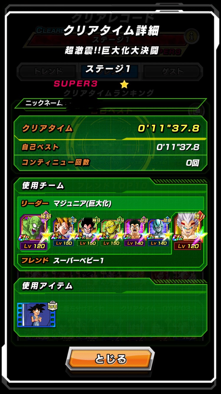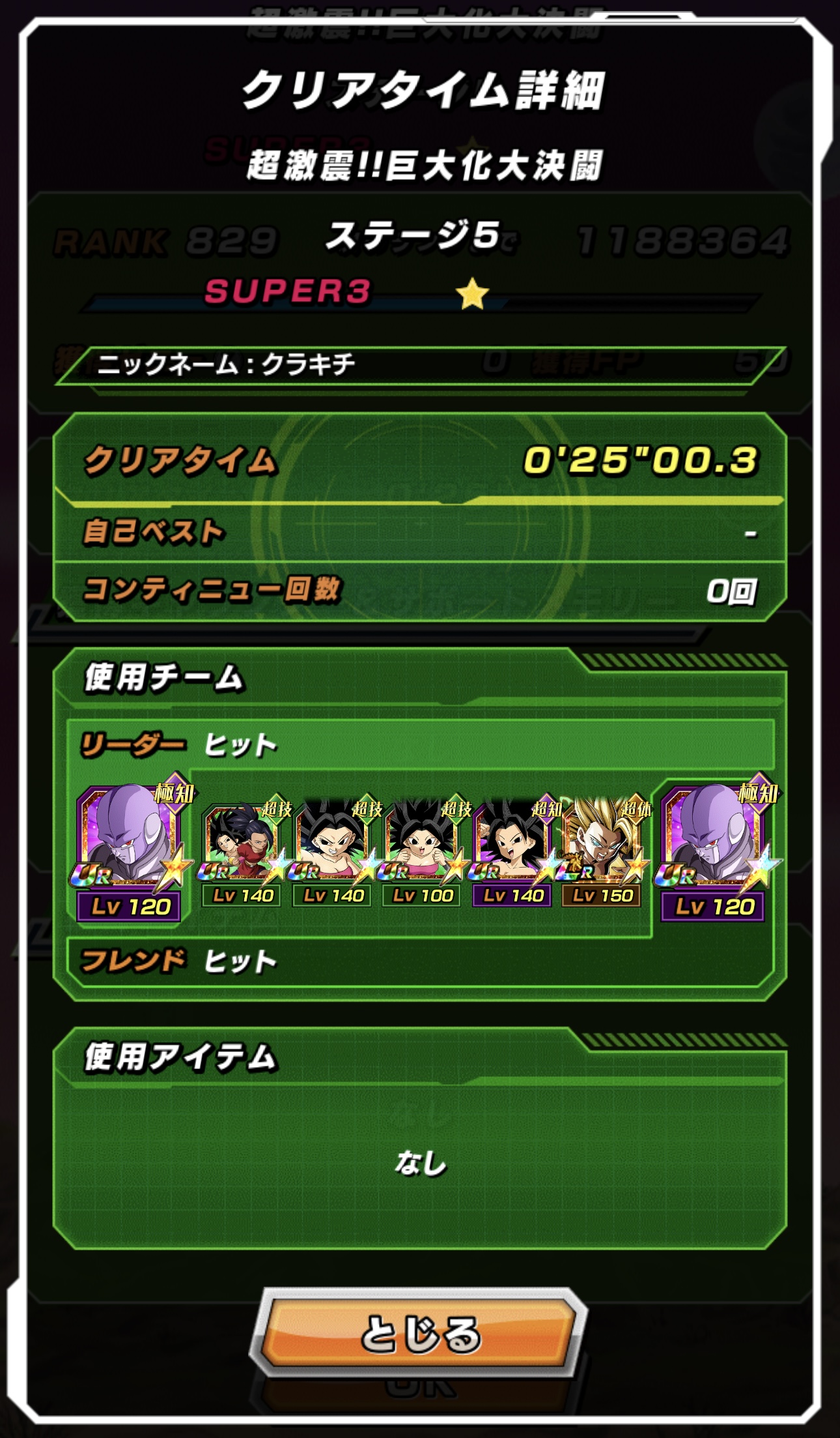 巨大化クリア。タピオンか大猿ベジータが大猿悟空ターン初手に来るようにしてタピオンのリーダースキルで増やした巨大化回数を活かして2回連続で大猿化して大猿悟空ターンを丸々飛ばす。後はウイス使ってゴリ押しすれば勝てる。新キャラのベビーいるけど何もしてないからいなくても大丈夫