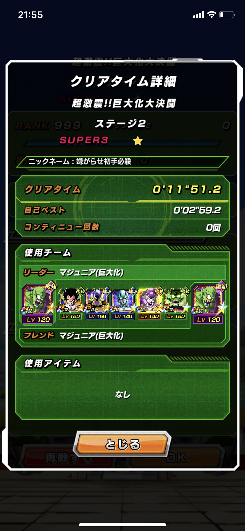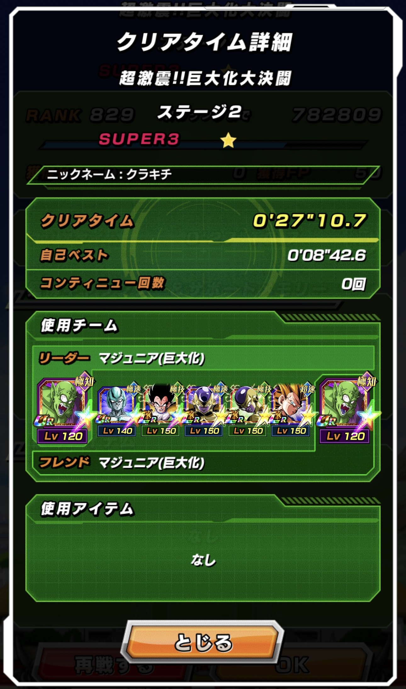 ノーアイテム。3ターン目にメタルカウラが変身できるようにして、3ターン巨大化が続けばいいし、切れたとしても、切れた時に続けてベジータや悟空が変身できれば相手の巨大化を流せる。3ラウンド目は雑魚なので、ゴルフリのアクティブ使って殴れば倒せるし、保険的にマジュニアの気絶も入るから安心。