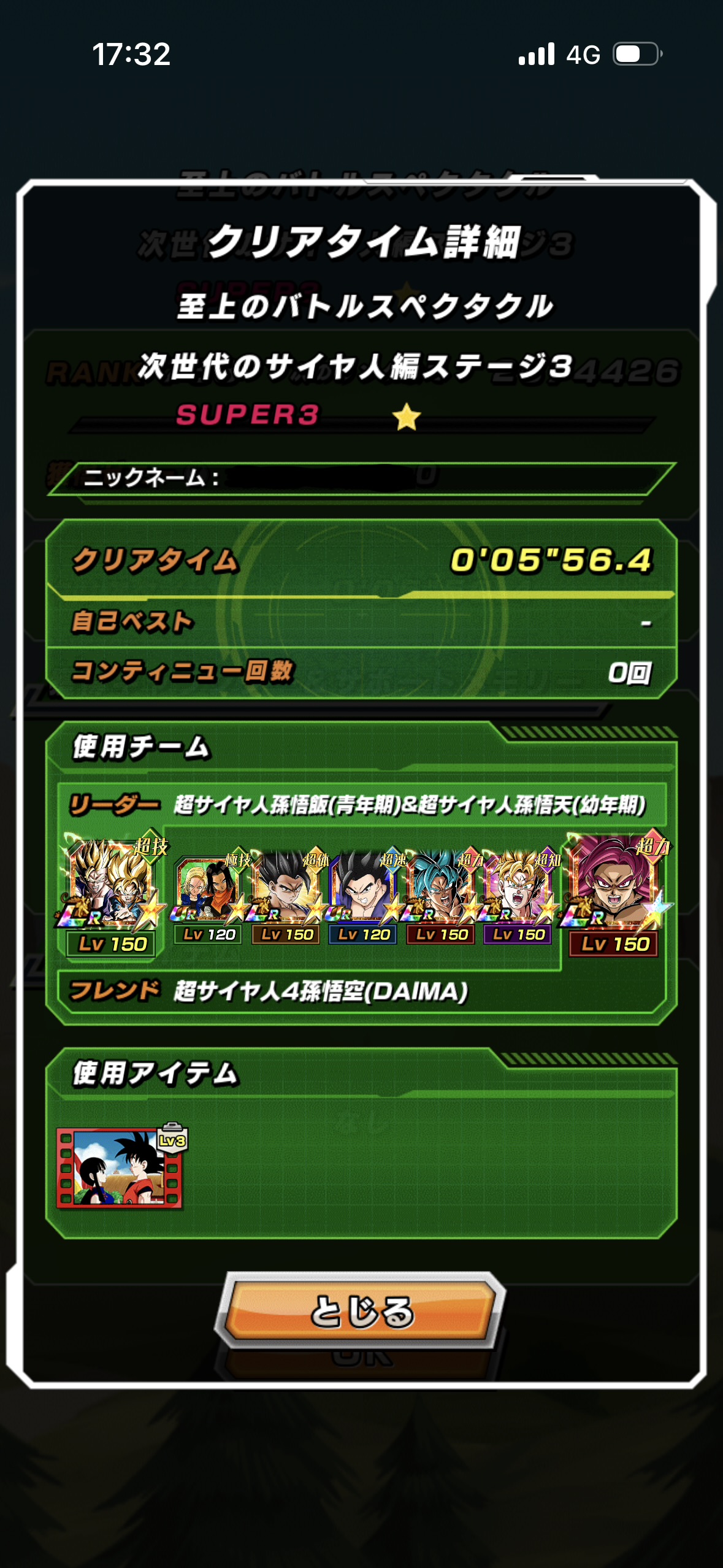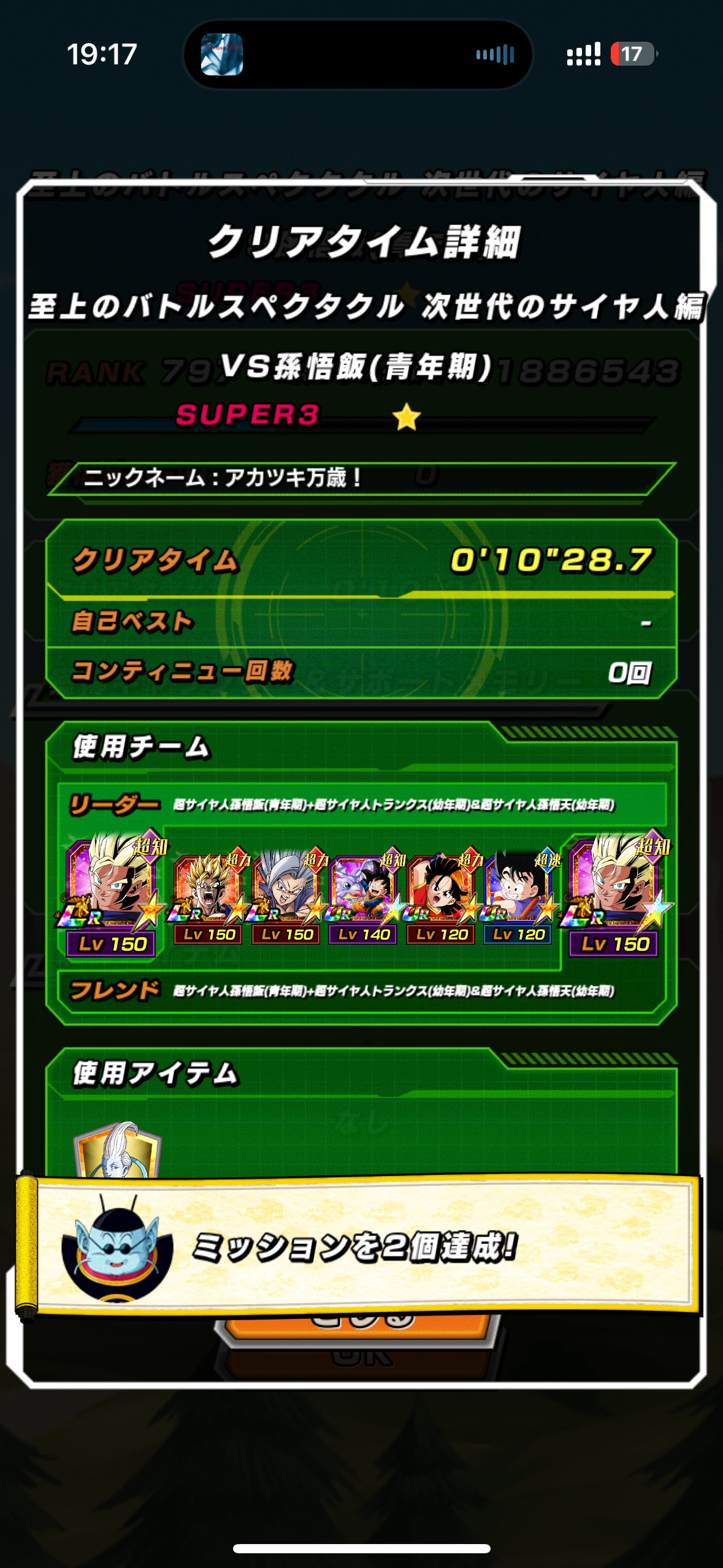数合わせ感満載の面子を10周年ベジット・6周年身勝手でキャリーしてミッションクリアをしてみました。アイテムは結局ウイス1個しか使っていません。