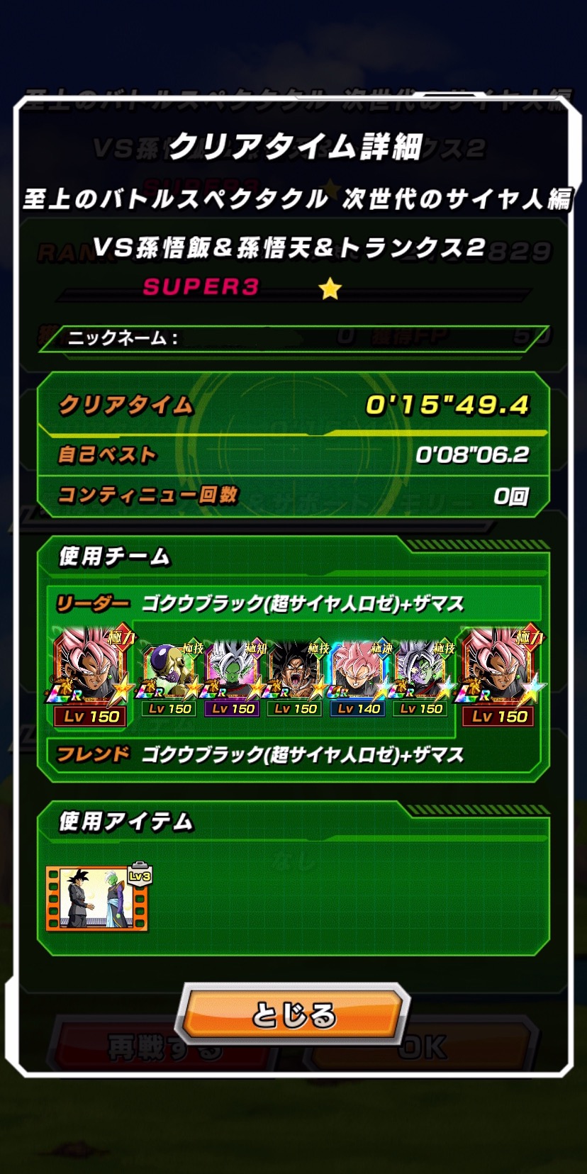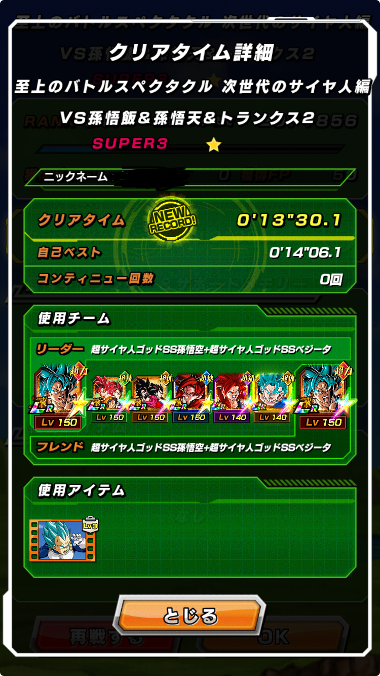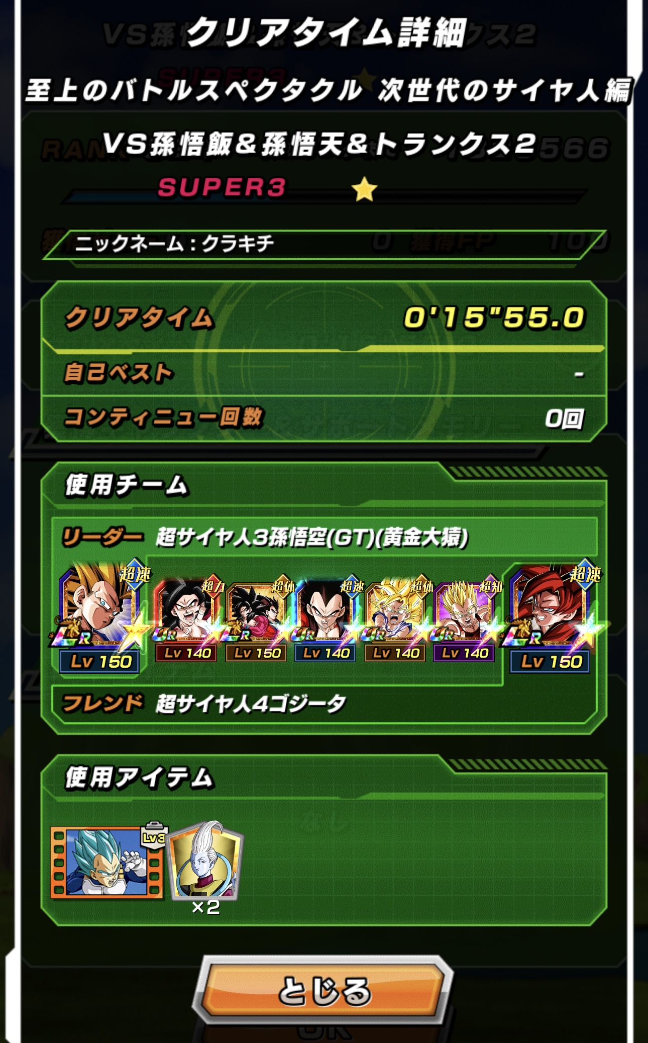 敵のタフさも相当なものではありますが、「親子の絆」縛りミッションに挑む場合はアイテムはしっかり最終局面まで温存するか、悟天&トランクスを処理しきれなかった時に4ターン目辺りで使うかという感じになるでしょう。