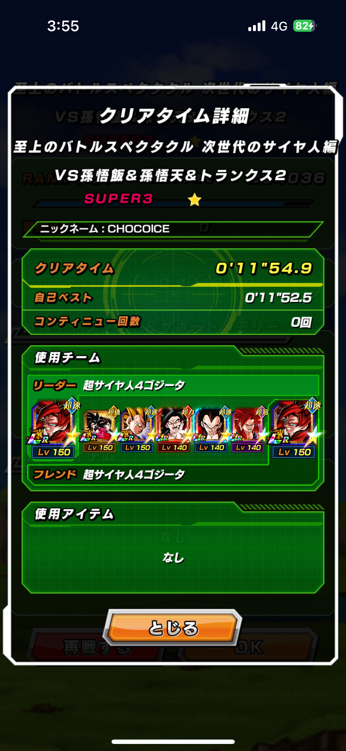 • 親子の絆クリア。最終ターンはウイス切れていたので、ゴジータで受けてもヤられるの必至だったから、ベジ4の反撃を期待して1番手に置いたら、見事に反撃してくれたので2番手のゴジータでトドメ。ベジ4の反撃に全てがかかっていました。