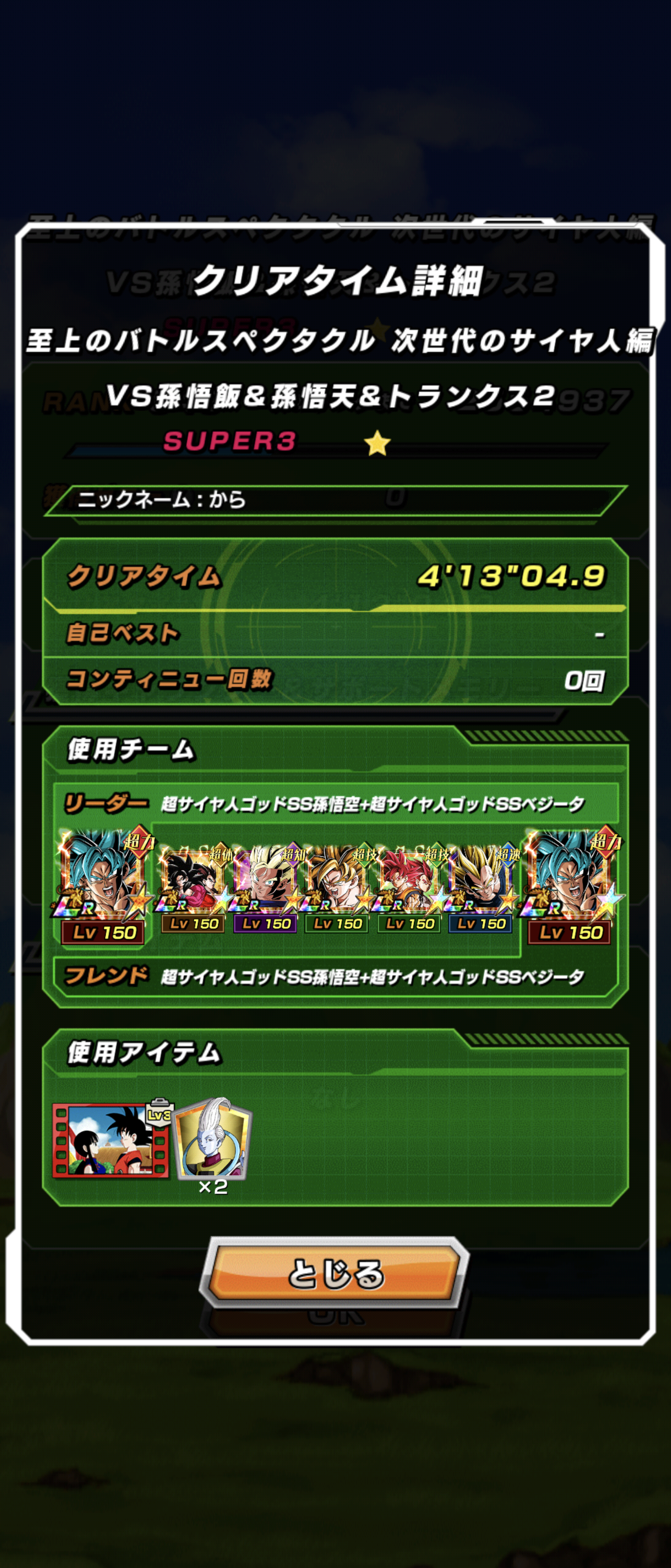 3ターン目からアイテム使って、効果尽きた7ターン目に変身させた7周年ゴッドコンビが必殺を50万強で耐えてくれて、ミリ残しの8ターン目に必中無効のフレ悟空が必殺含めた先手攻撃を全部回避してくれて…