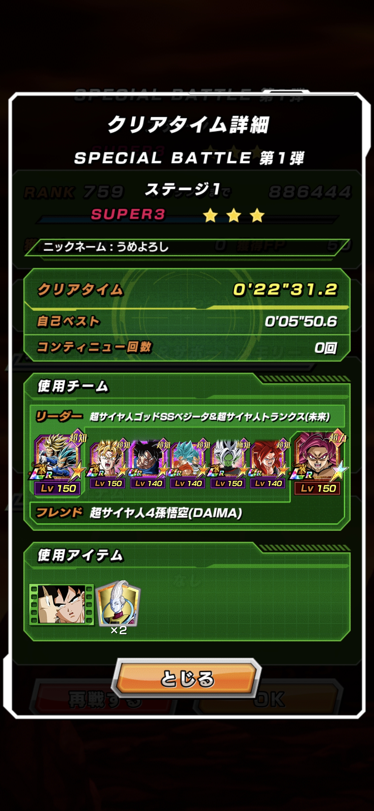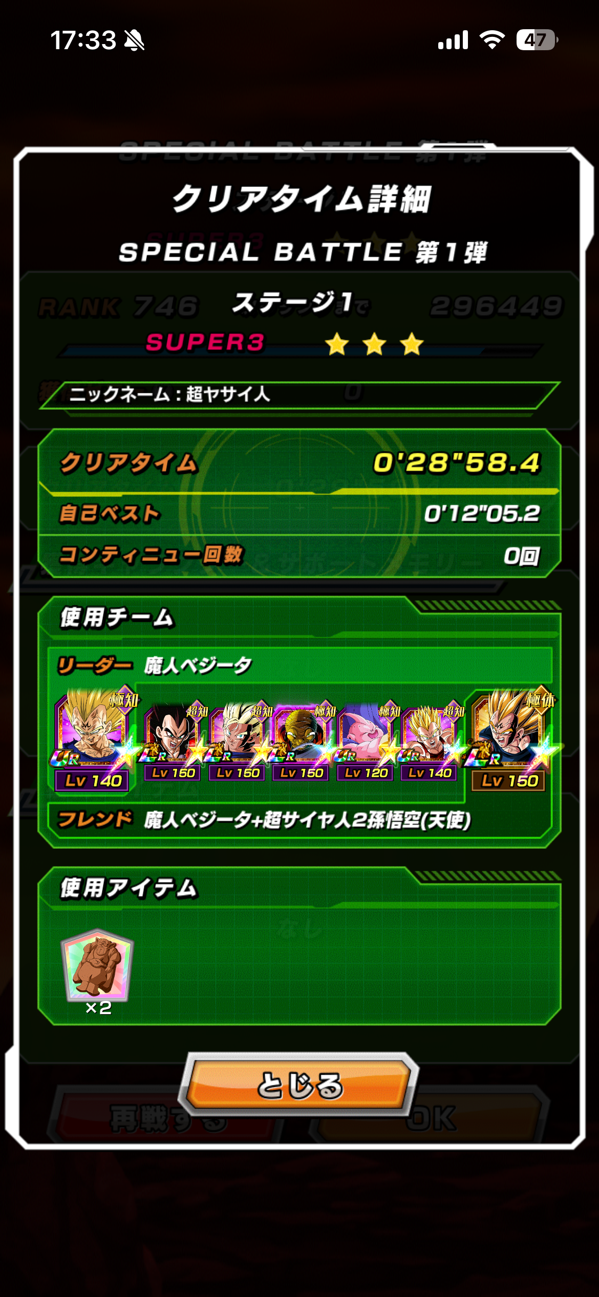 自前ゴマー、11周年悟空ベジータなしでクリア!パンジ、グロリオ、ミニコロ、ミニ超悟空の回避頼り。ミニコロが最後全体攻撃回避しなかったけどウイス使ってたから54万ダメージで何とか耐えられました。