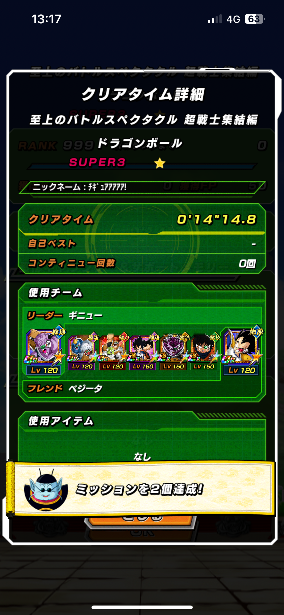 求めし者ミッションもDAIMAキャラで上位キャラを詰め込むのではなく、ギニュー特戦隊で臨むのが正解ですね。リンクの大切さを改めて感じる。幸い敵の火力は大した事ないので。