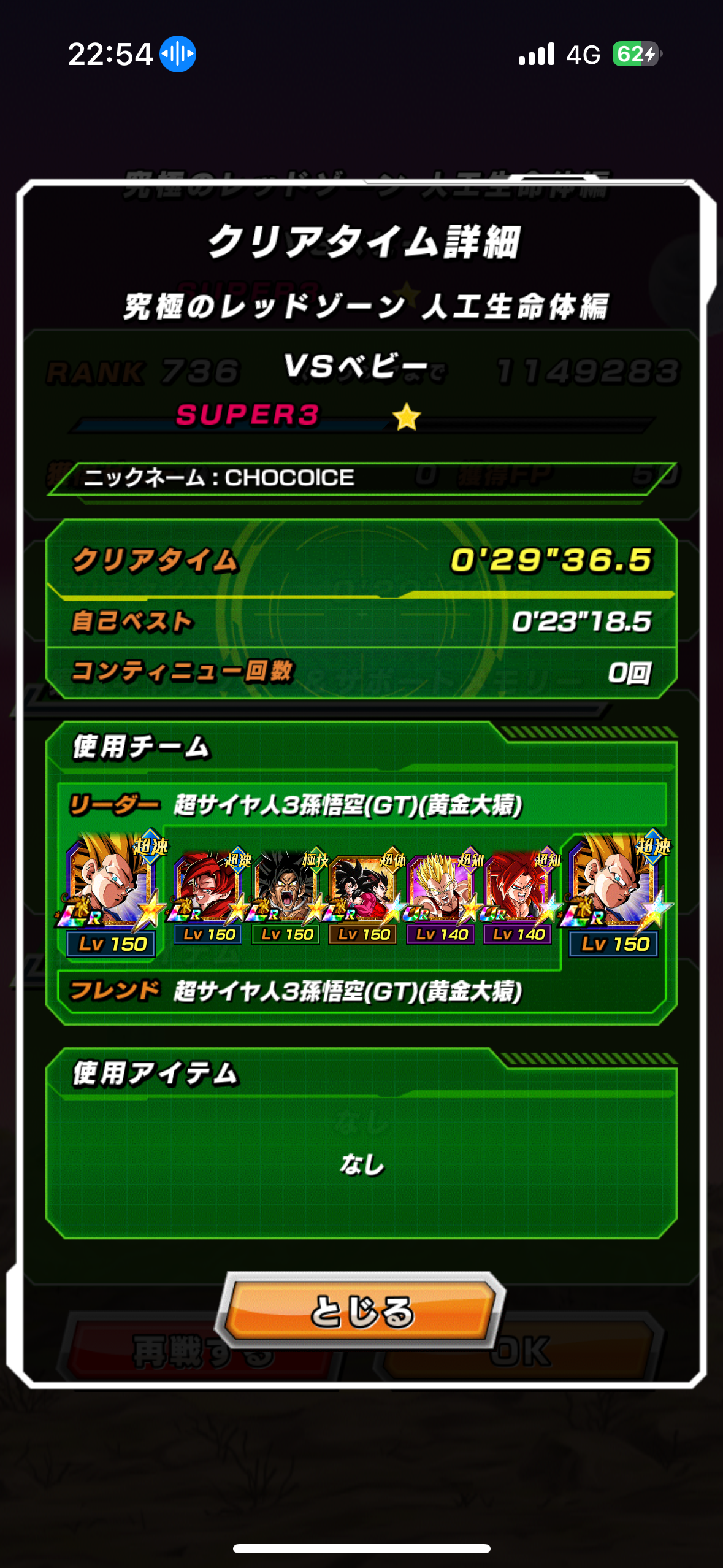 • 大猿ベジータが両面黄金大猿のサポート受けて最終ステージ62万、