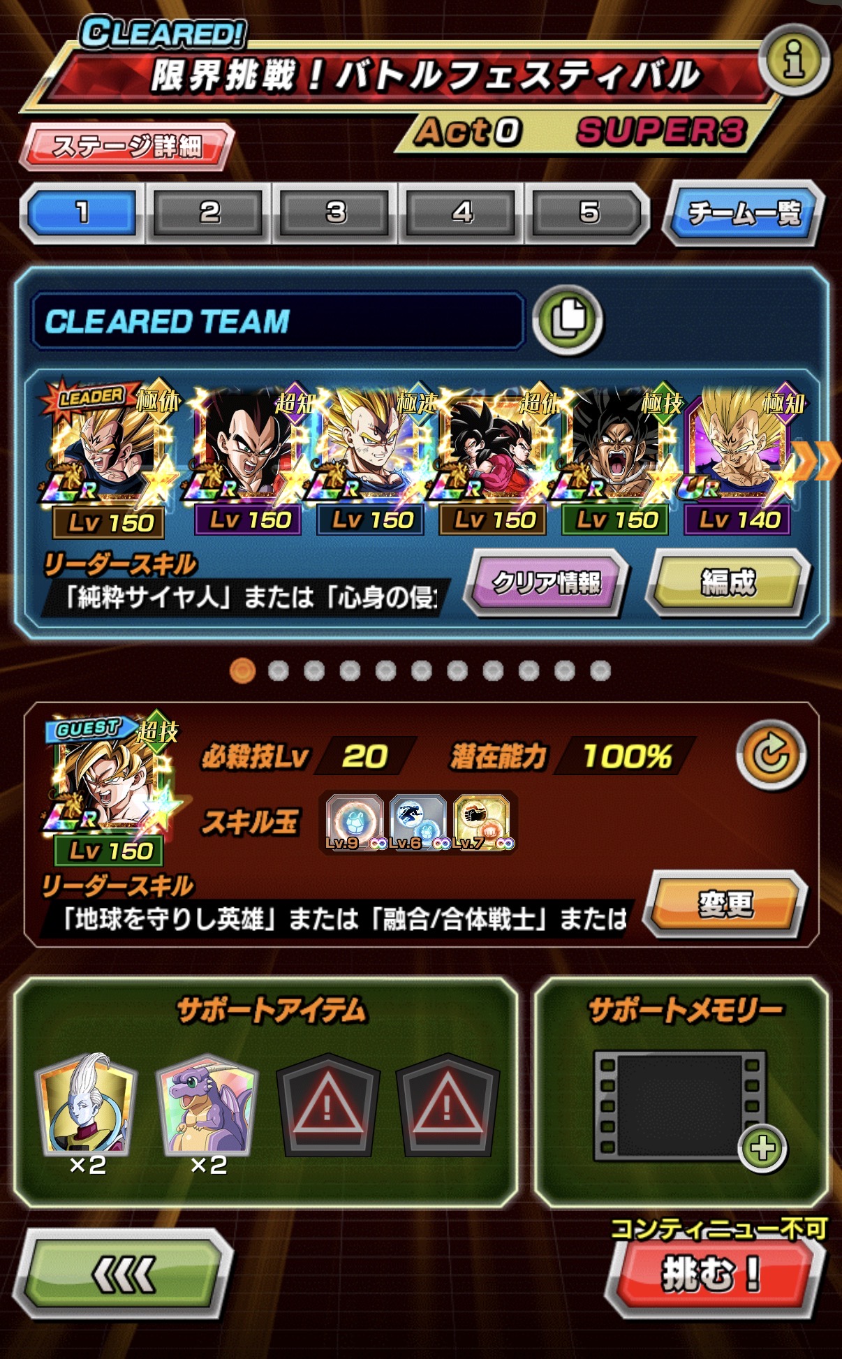 ベジット抜きでも他のエース級キャラを軸にして勝利する事も全然可能ではありますが、その場合は敵の火力計算・ダメージ計算をし、そこから逆算して行動決定をして行かないとクリアが全く安定しなくなるので、『そういうのよく分からん』という人ほどベジット2体積み編成で挑むべきです。(そも、自分で計算して組み立てが出来る人には攻略指針の情報は必要ない)