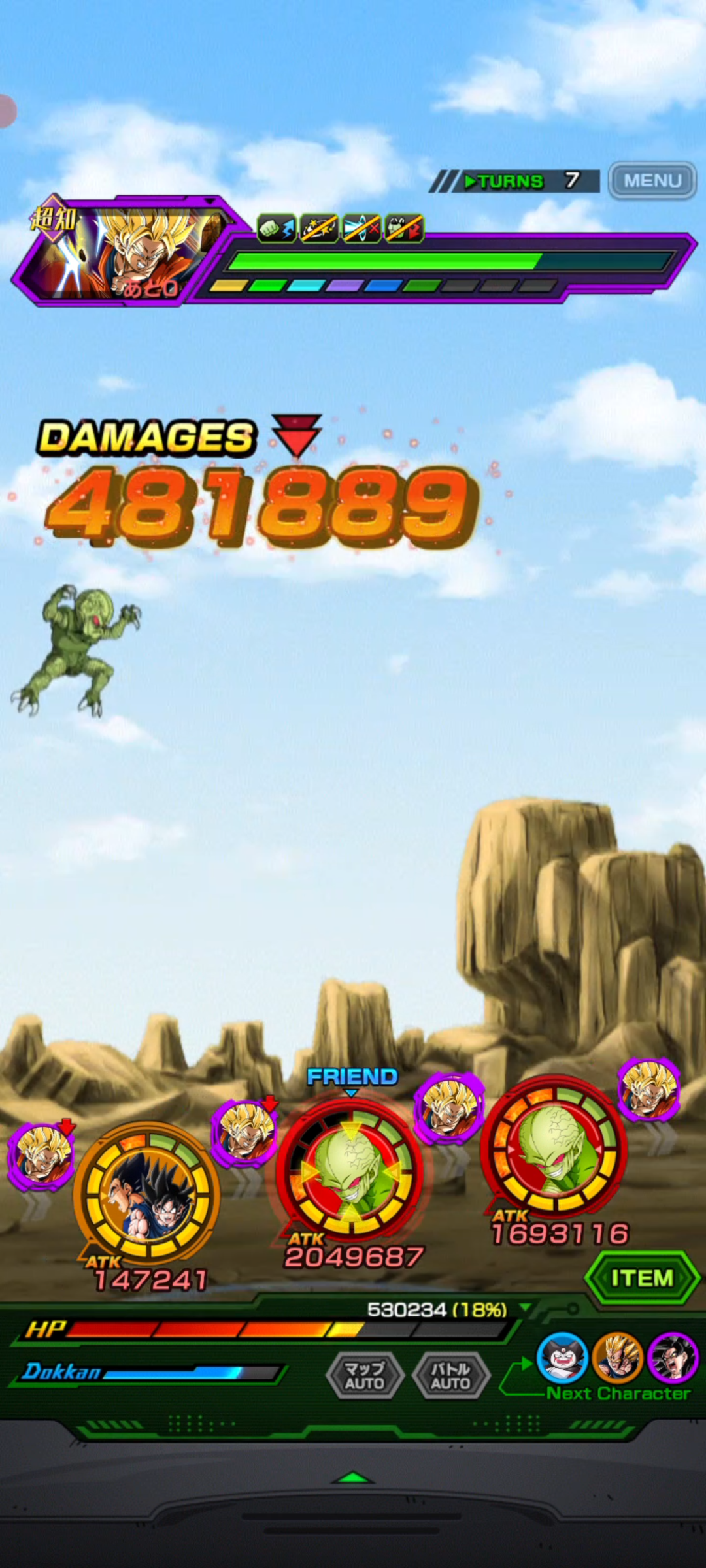 1番手、2番手にサイバイバトル置いて、3番手に最強スキル玉付けた虹のお供栽培マン置けば1億会心を9連打してくれるぞ