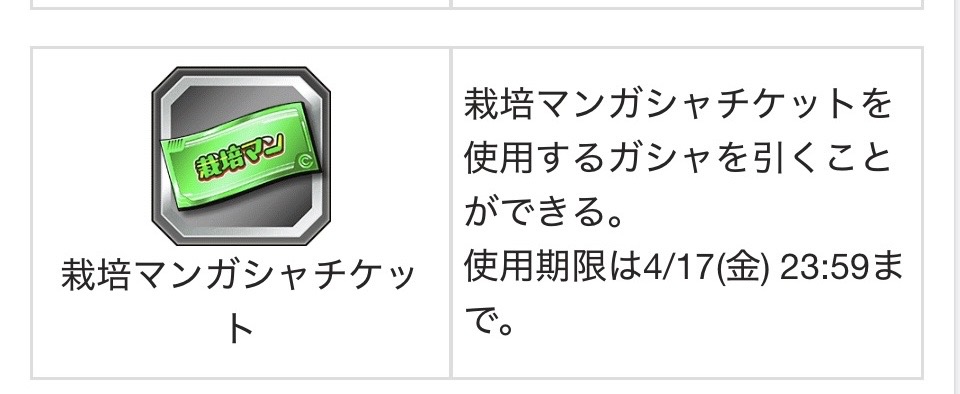 てか栽培マンガシャチケットてなんだ?これの事か?さすがに新キャラの栽培マンが引けるとかは無いよな