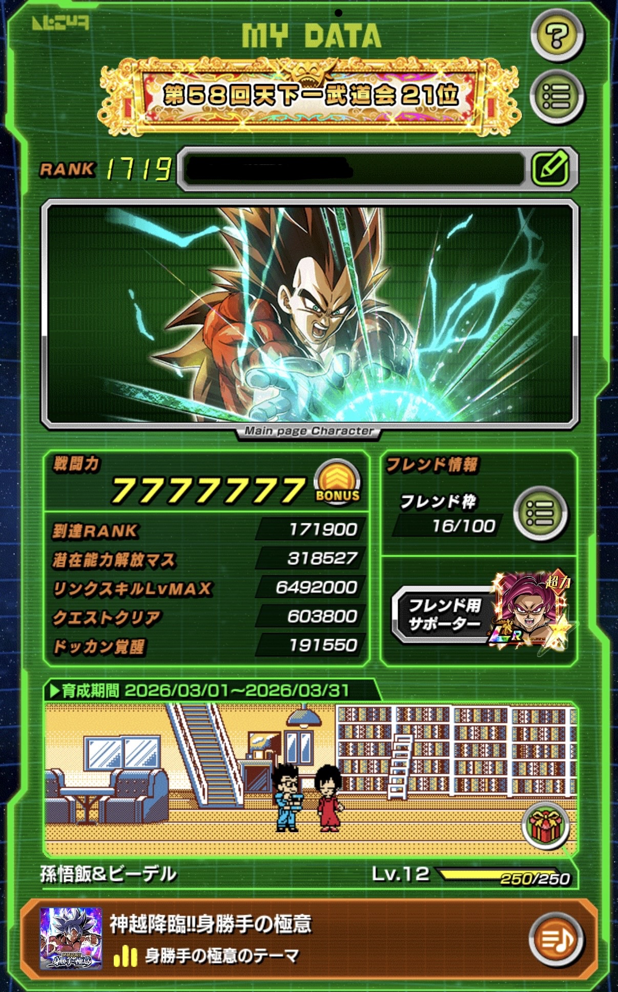 カテゴリ縛り・属性縛りミッションは同時達成が可能なので『ブウ編&心身の侵食の極系5属性』『超えた力&親子の絆&兄弟の絆の超系5属性』みたいな感じで最短2日で達成出来ますが、7回クリアのミッションだけはどうやっても短縮出来ないので6日以上挑むのを忘れると達成不可能になります。必ず毎日挑戦しておきましょう。