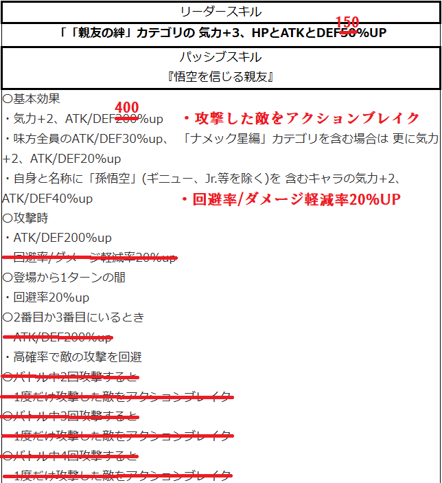 | 〇基本効果 ・気力+2、ATK/DEF200%up ・味方全員のATK/DEF30%up、 「ナメック星編」カテゴリを含む場合は 更に気力+2、ATK/DEF20%up ・自身と名称に「孫悟空」(ギニュー、Jr.等を除く)を 含むキャラの気力+2、ATK/DEF40%up 〇攻撃時 ・ATK/DEF200%up ・回避率/ダメージ軽減率20%up 〇登場から1ターンの間 ・回避率20%up 〇2番目か3番目にいるとき ・ATK/DEF200%up ・高確率で敵の攻撃を回避 〇バトル中2回攻撃すると ・1度だけ攻撃した敵をアクションブレイク 〇バトル中3回攻撃すると ・1度だけ攻撃した敵をアクションブレイク 〇バトル中4回攻撃すると ・1度だけ攻撃した敵をアクションブレイク |