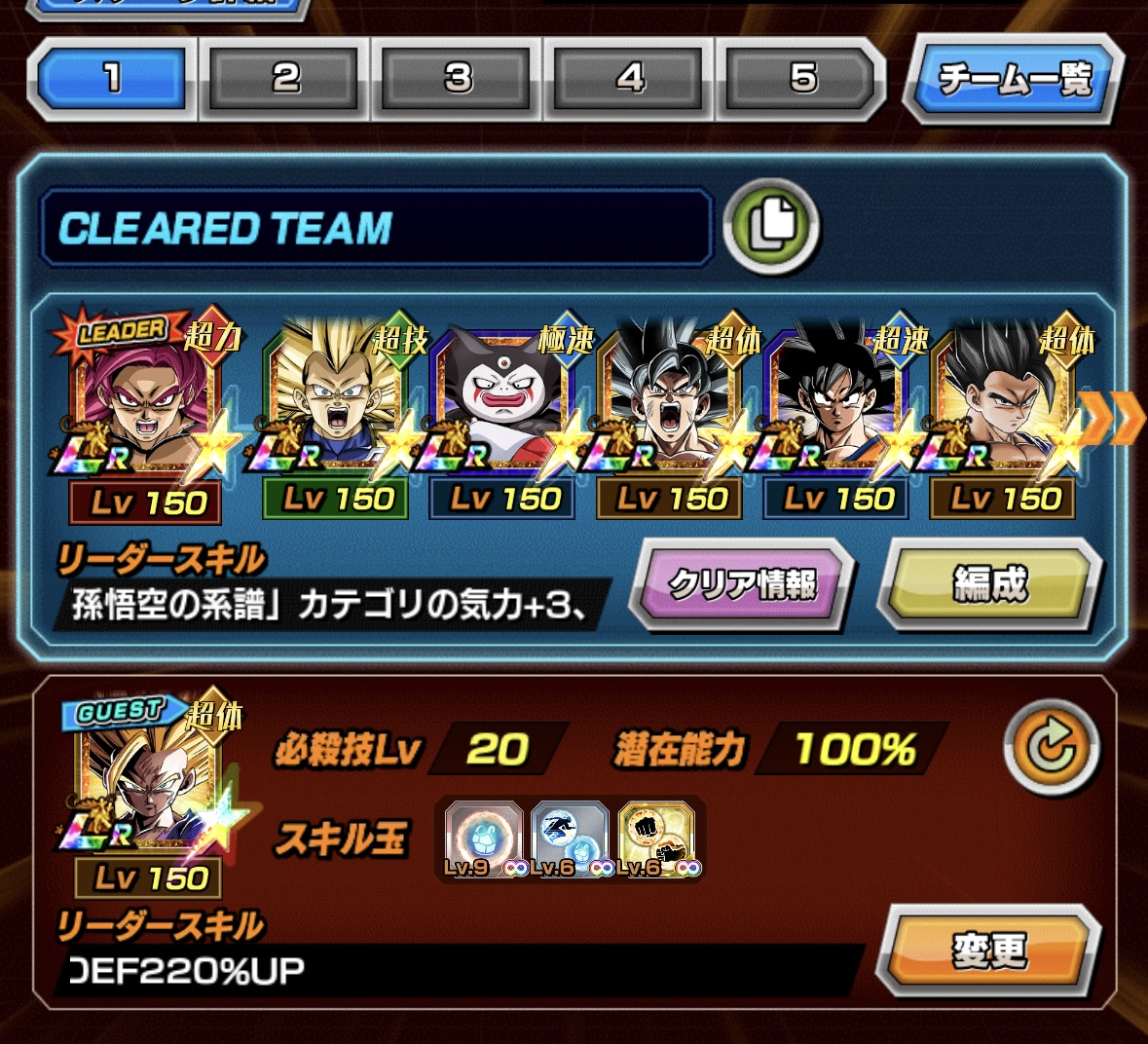 『悟空で無限上昇貯めてベジータで爆発!』みたいな雰囲気ですが掛け算補正が『ATK150%,DEF100%』しかないので実数値は全然伸びず…。