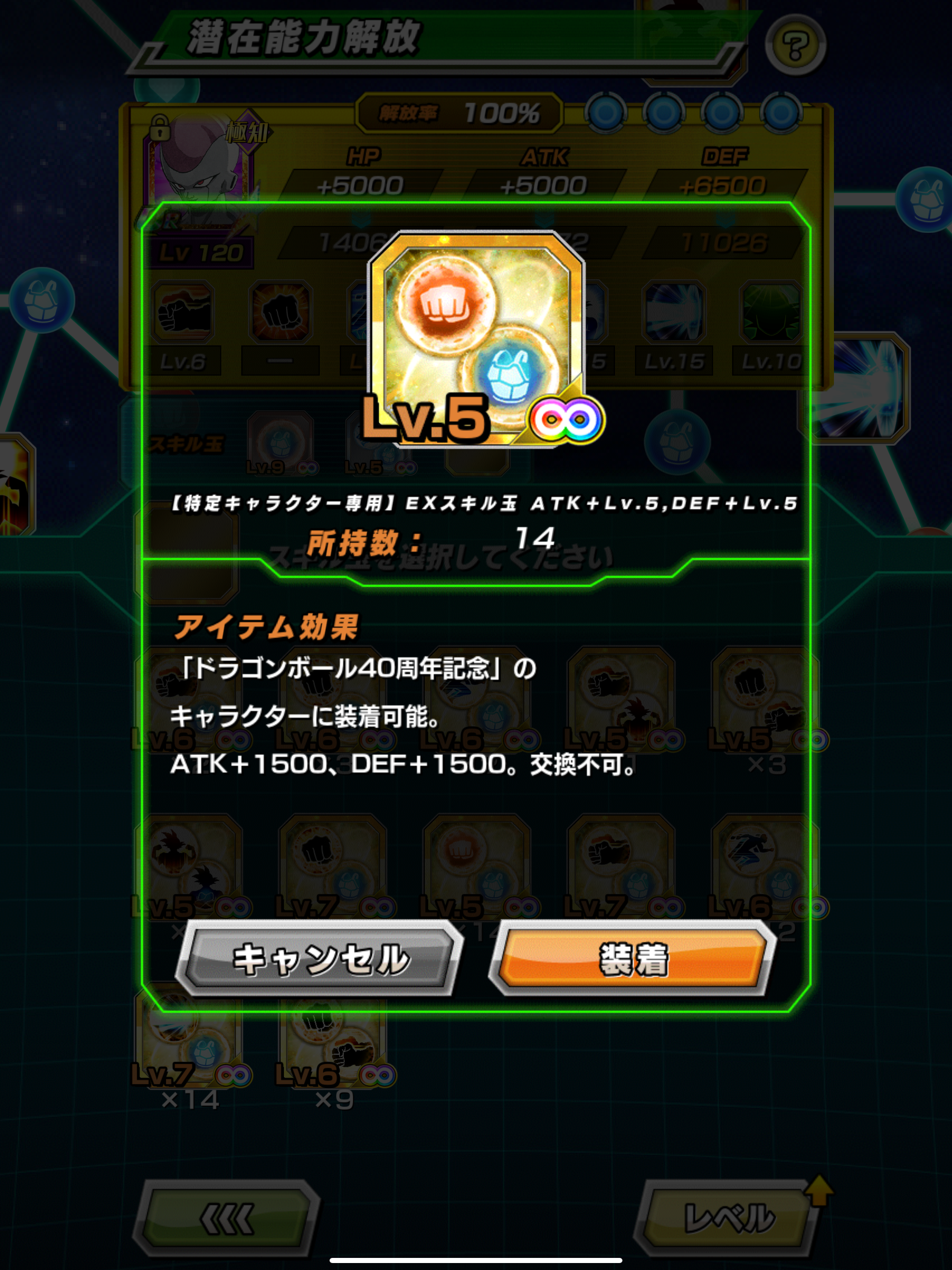 フリーザなんかも『DB40周年チーム』で使うなら重要なダメージソースなので金の『ATK+1,500&DEF+1,500』は是非とも欲しいですが、他の編成で3枠目の回避サポーターとして使うなら火力など全く不要なので金は『回避+Lv.6&DEF+1,200』の方が望ましいし、ケースバイケースで適切なEXスキル玉が異なるパターンも勿論あります。