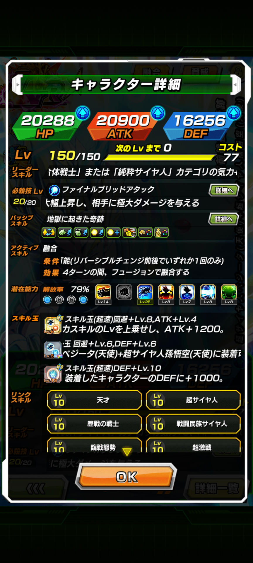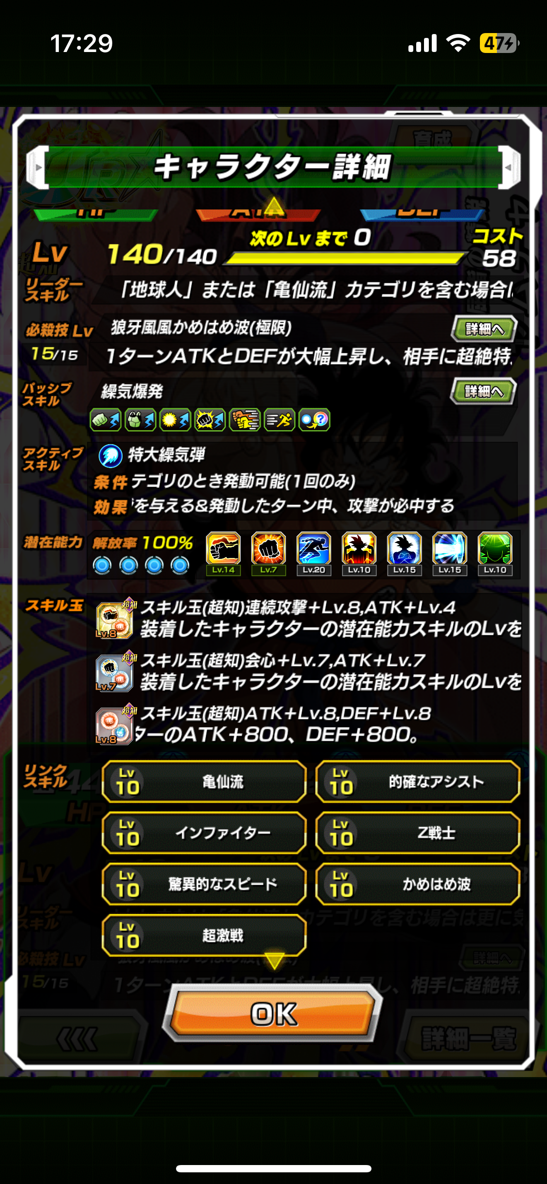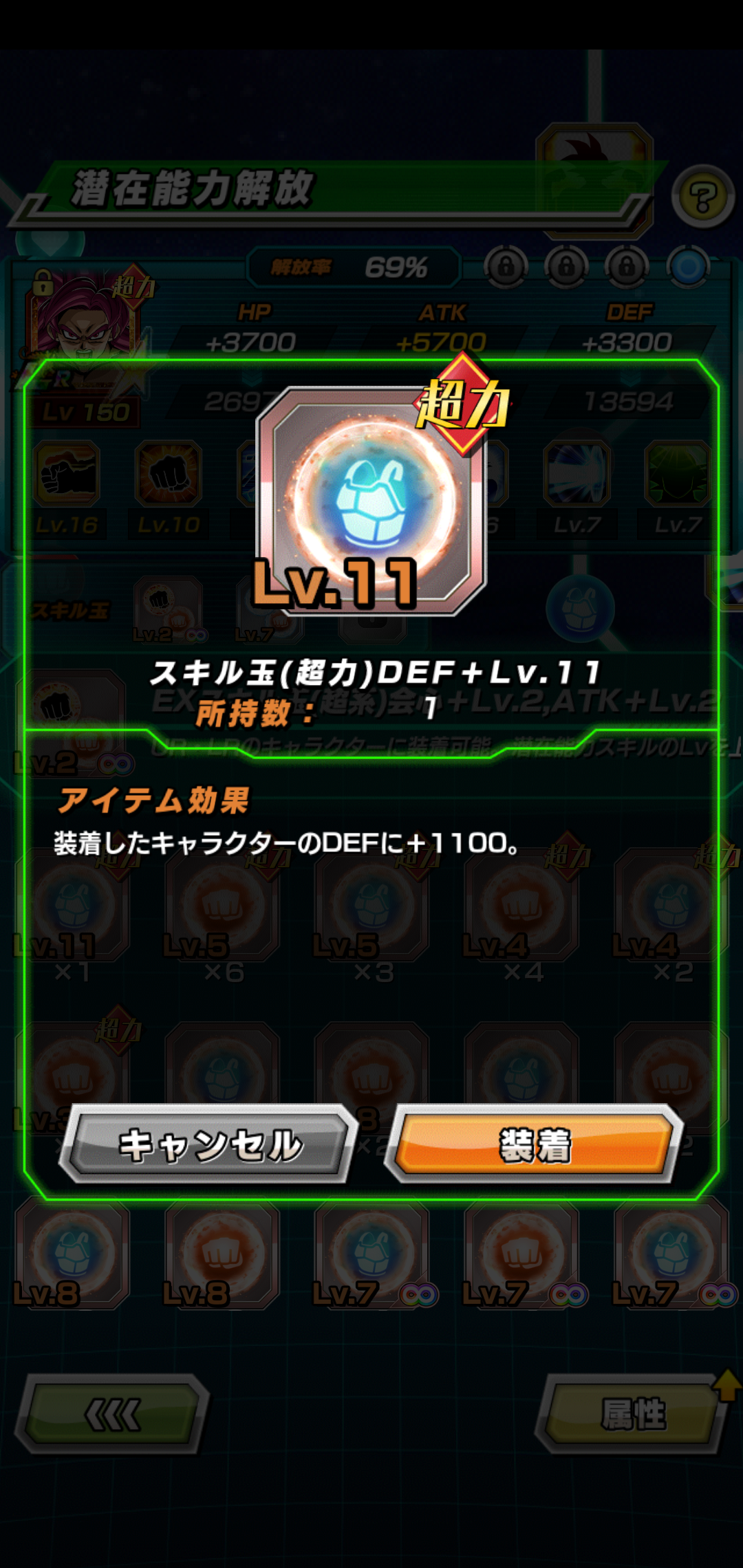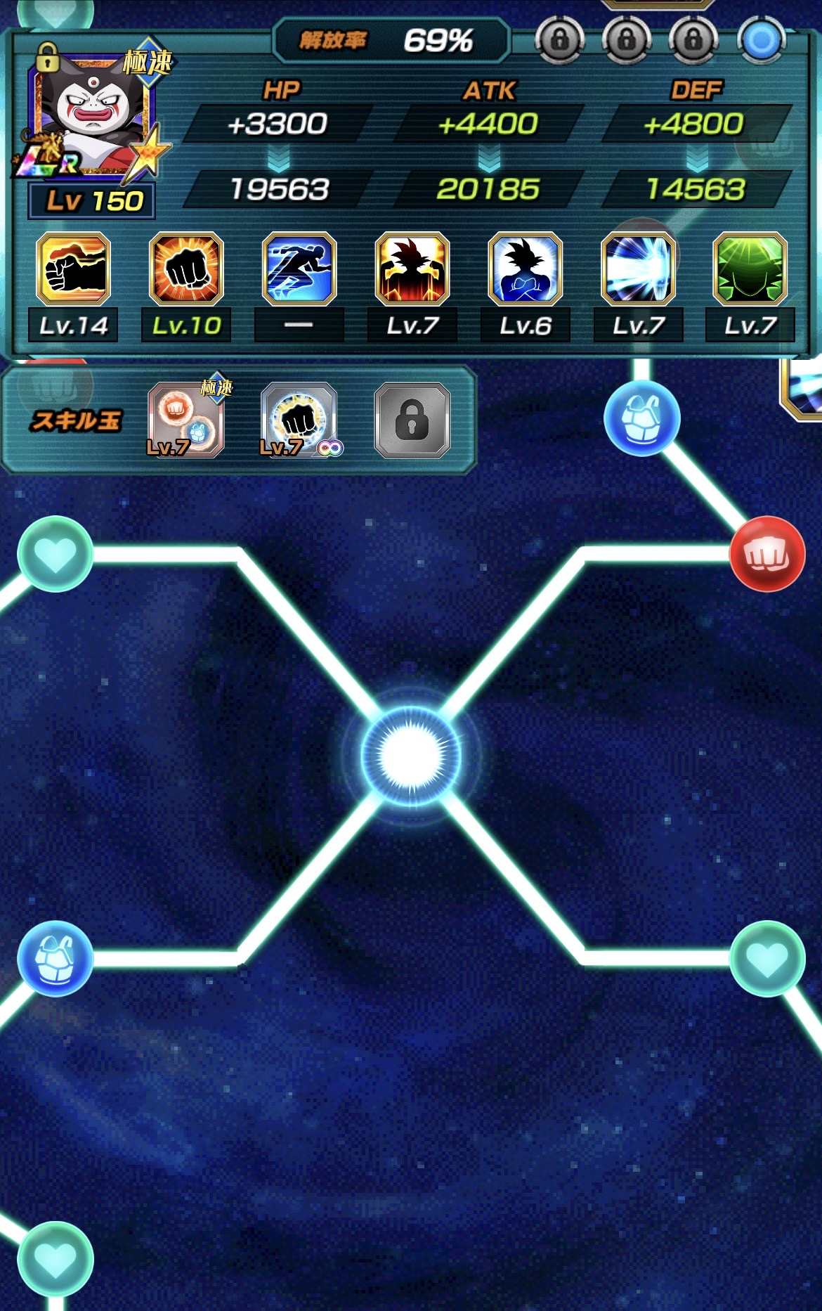 この悟空の場合スキル玉でDEFが100万~150万くらいも増加、被ダメージ量に直すと50万~70万くらいの減少に繋がっています。