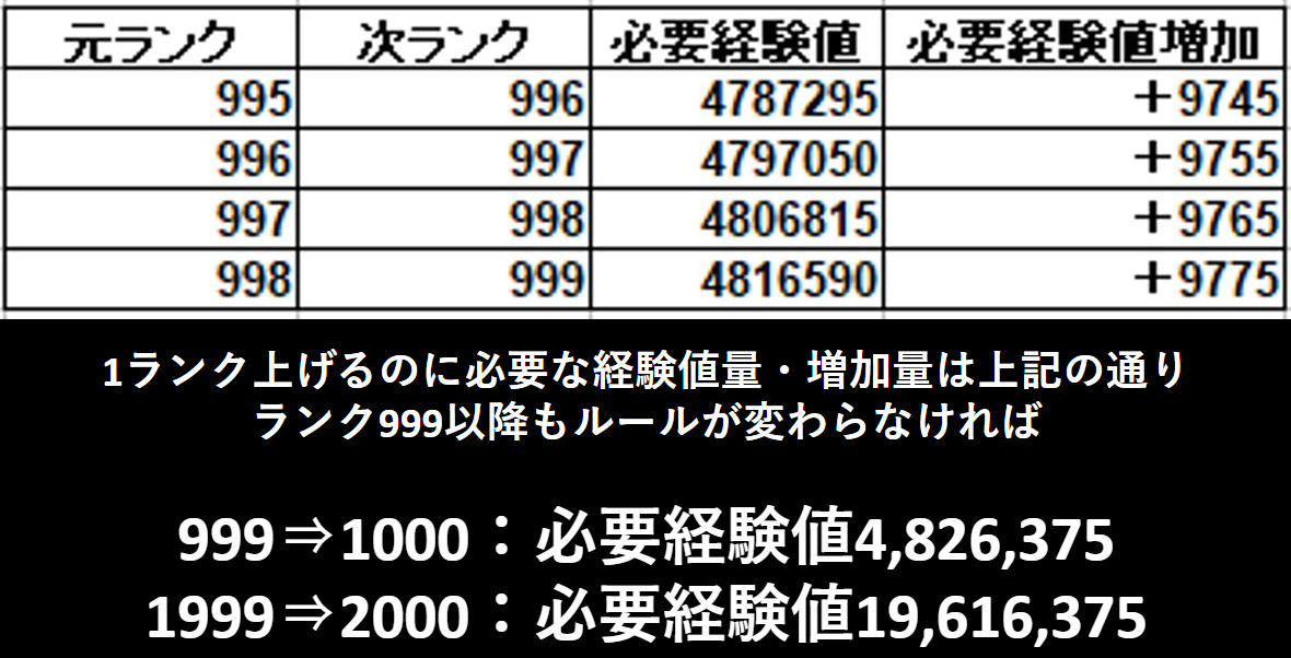 またこのゲームのランク上げに必要な経験値の法則は上記のように決まっており、1000~2000でも法則が変わらなければランク2,000までの所要経験値なども現時点で計算可能です。