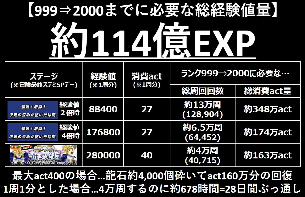 毎月15日・30日の『ドッカンスペシャルデー』限定で解放される『究極レベルアップ!精神と時の部屋』は消費act40で経験値28万とact効率・時間効率共に最高効率ステージ、リンクレベルも上がりやすいので①の趣旨にも合っているし、スペシャルデーはここを周回してランクアップを狙って行きましょう。