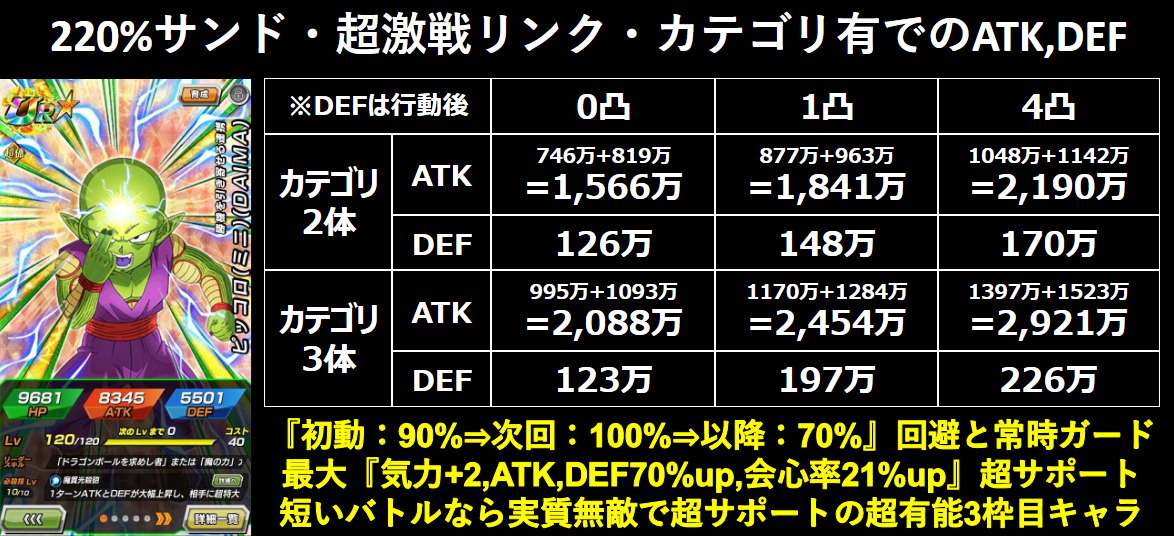 90%~100%回避のおかげで敵火力が1億になろうが6ターン以内で終わるバトルなら採用可能、仕事が仕事なので味方の平均火力が10億になろうがサポート枠として採用可能、少し大袈裟に言えばこのピッコロは『敵味方のインフレに全く影響されない性能デザインをしている』とも言えるでしょう。