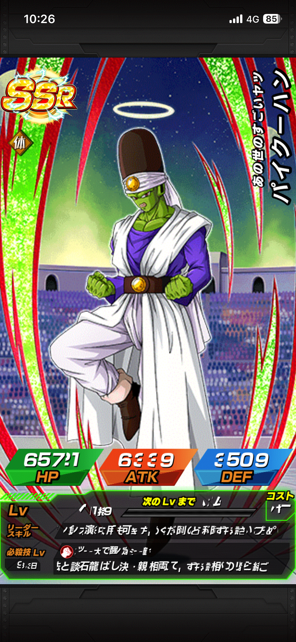 | 〇基本効果 ・気力+1、ATK/DEF200%up ・高確率で会心が発動 ・高確率で敵の攻撃を回避 〇気力メーター12以上で攻撃時 ・ATK200%up 〇そのターン中自身が攻撃を受けるまで ・ダメージ軽減率60%up 〇攻撃を受けるとき ・DEF200%up ・HP30%以下で回避率15%up 〇攻撃を受けると ・回避率10%up 〇攻撃するたび ・バトル中、ATK150%up(最大300%) 〇バトル中2回以上攻撃するたび ・次の攻撃参加ターン中、 ATK666%up、必ず会心が発動 〇自身の他に攻撃参加中の 「DAIMA」または「魔人の力」または「魔の力」 カテゴリの味方がいるとき ・味方全員の気力+1、ATK/DEF40%up ・1度だけ気玉変化:全気玉→クッキー(※)+技+力 (※ドラゴンボールが出現している気玉を除く) 〇取得お菓子気玉1個以上 ・1度だけ気力+3、必ず追加攻撃 ・バトル中、回避率20%up ・バトル中、自身と名称に「魔人ドゥー」を 含むキャラの気力+1、ATK/DEF60% |