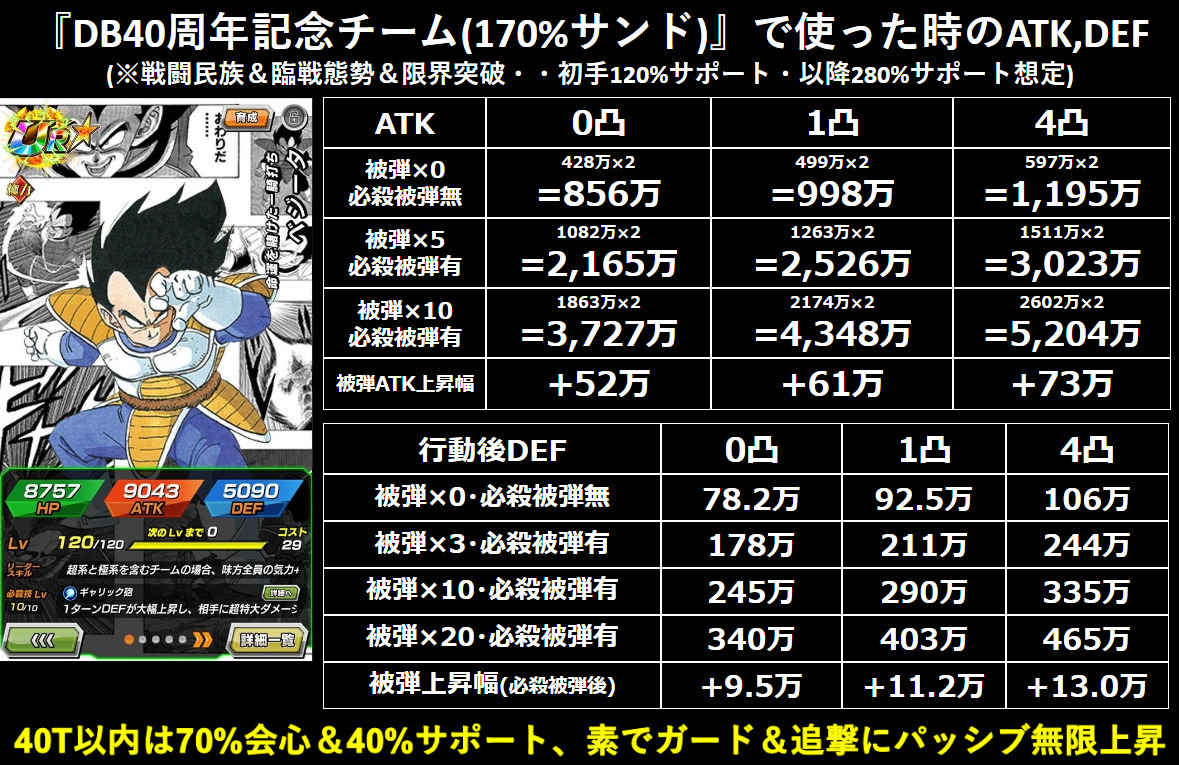 『パッシブ無限上昇&全属性ガード&1度だけの必殺技耐性』で2,3番手を無難にこなしつつ、裏まで届くサポートと70%会心&連撃火力で戦うDB40周年記念キャラクターです。