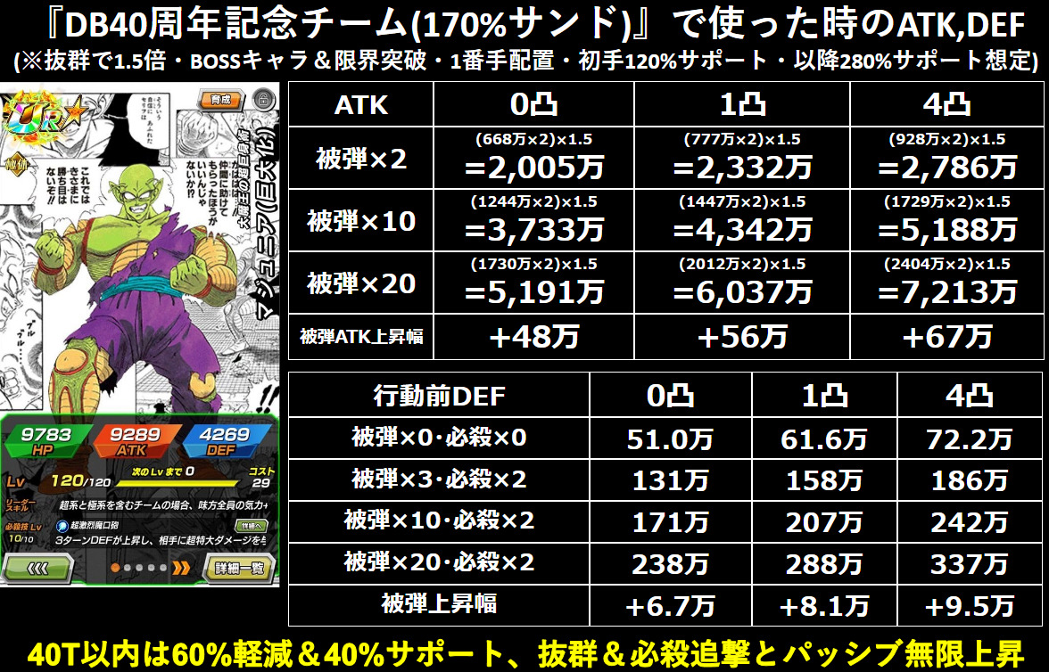 『パッシブ無限上昇&ダメージ60%軽減』で1番手を守りつつ、裏まで届くサポートと抜群&連撃火力で戦うDB40周年記念キャラクターです。