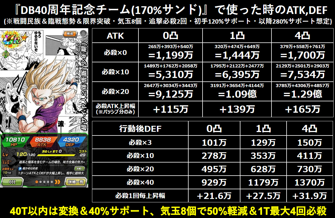 『DB40周年記念ガシャ』限定キャラの内の1体、セットで使う事でリーダースキル補正は170%ながら『ATK,DEF280%サポート』を受けつつ戦えるキャラクターですが、悟飯は『気玉8個』の取得さえ行えれば最も強大な絶対性能を持っているキャラクターと言って良いでしょう。