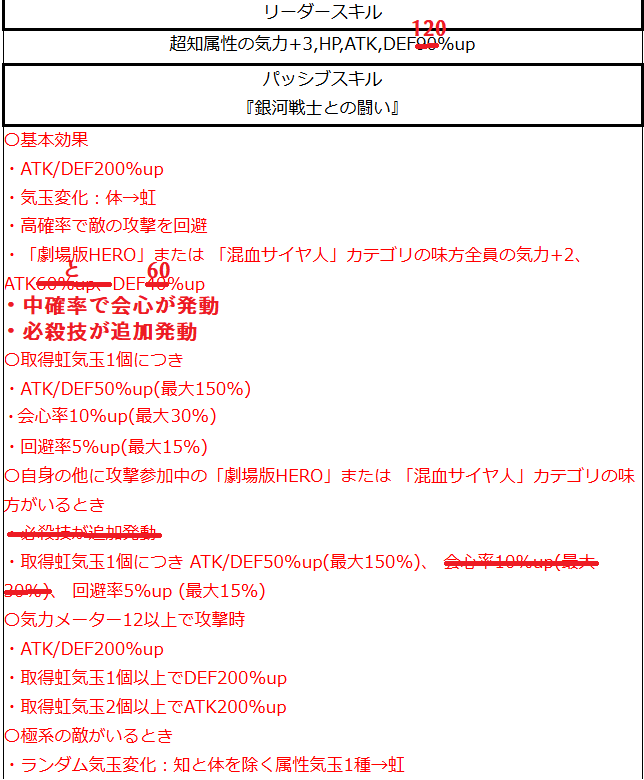 | 〇基本効果 ・ATK/DEF200%up ・気玉変化:体→虹 ・高確率で敵の攻撃を回避 ・「劇場版HERO」または 「混血サイヤ人」カテゴリの味方全員の気力+2、ATK60%up、DEF40%up 〇取得虹気玉1個につき ・ATK/DEF50%up(最大150%) ・会心率10%up(最大30%) ・回避率5%up(最大15%) 〇自身の他に攻撃参加中の「劇場版HERO」または 「混血サイヤ人」カテゴリの味方がいるとき ・必殺技が追加発動 ・取得虹気玉1個につき ATK/DEF50%up(最大150%)、 会心率10%up(最大30%)、 回避率5%up (最大15%) 〇気力メーター12以上で攻撃時 ・ATK/DEF200%up ・取得虹気玉1個以上でDEF200%up ・取得虹気玉2個以上でATK200%up 〇極系の敵がいるとき ・ランダム気玉変化:知と体を除く属性気玉1種→虹 |