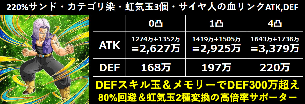 DEFは気玉さえ取れれば確率依存要素は無し、スキル玉やメモリーを盛れればDEF300万も目指せるし、天下一武道会で無料で手に入る回避型サポーターとしては十分に及第点と言えるでしょう。