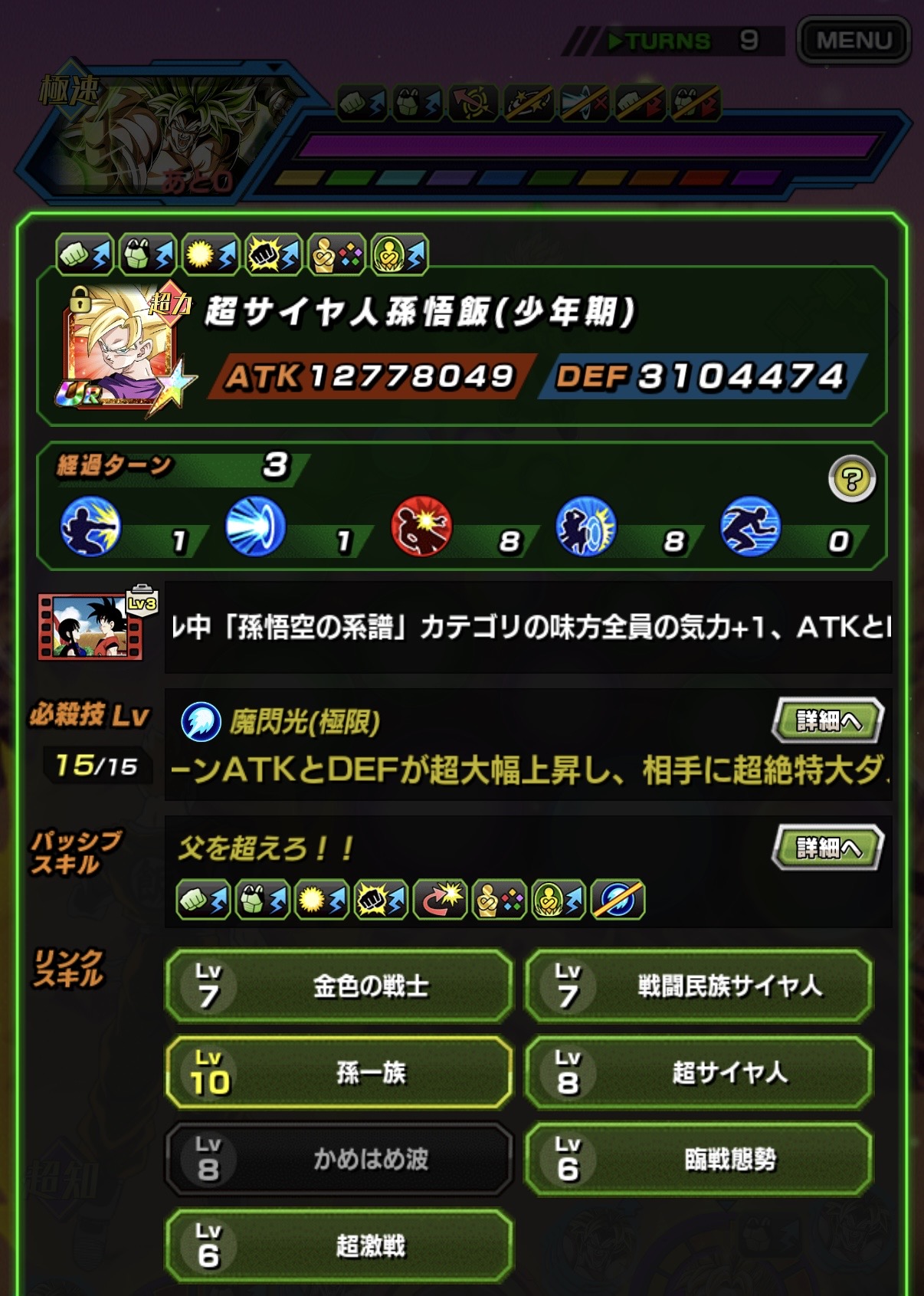 | 〇基本効果 ・ガンマ2号とリバーシブルチェンジ可能 ・気力+2、ATK/DEF 250% ・必ず追加攻撃し超高確率で必殺技発動 ・ダメージ軽減率50% 〇気力メーター12以上で攻撃時 ・ATK150% 〇攻撃時のターゲットの状態:HP70%以下 ・会心率50%、必殺技が追加発動 〇攻撃時のターゲットの状態:HP50%以下 ・会心率50%、必殺技が追加発動 〇気玉を取得すると ・1度だけ全ての攻撃をガード 〇1番目か2番目にいるとき ・DEF200% ・ダメージ軽減率20% ・2ターンの間、「超HERO」カテゴリの味方全員のATK/DEF20%、「魔の力」カテゴリの味方全員のATK/DEF20% 〇2番目で攻撃すると ・ATK250% 〇攻撃を受けるとき ・DEF150% ・2ターンの間、「超HERO」カテゴリの味方全員の気力+2 |