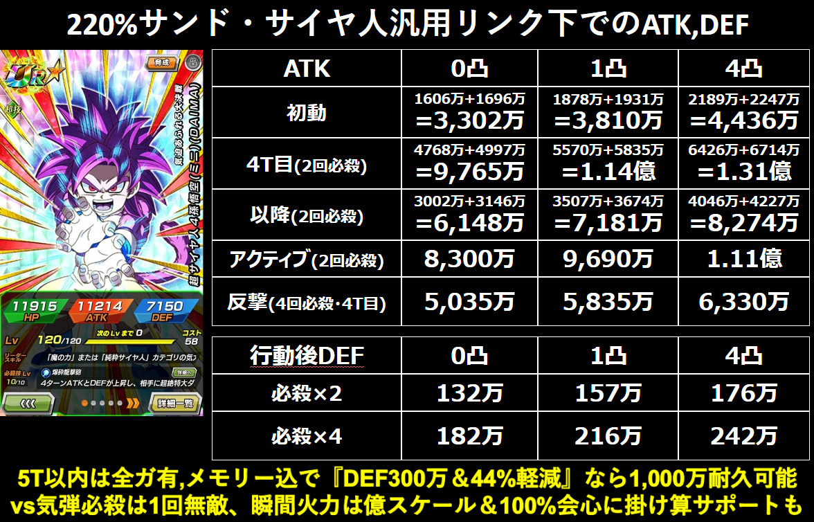 実際には潜在追撃も非常に出やすいキャラなので更に回数を盛れるケースも十分想定可、DEFスキル玉やサポートメモリやサイヤの咆哮リンクなど上乗せ要素も想定しやすく、『DEF300万+44%軽減+全属性ガード』くらいの水準も実戦レベルで普通に想定されるでしょう。