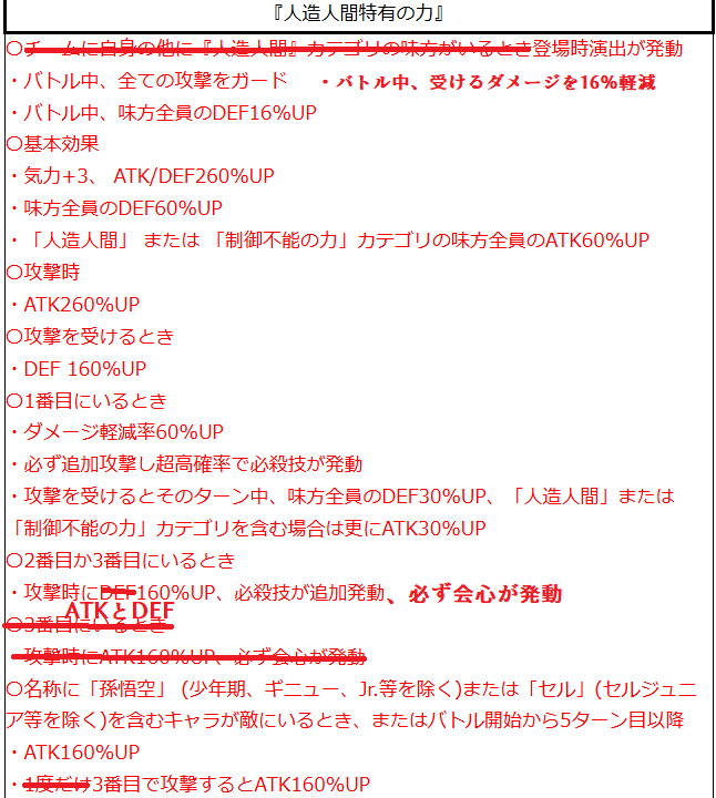 | 〇チームに自身の他に『人造人間』カテゴリの味方がいるとき登場時演出が発動 ・バトル中、全ての攻撃をガード ・バトル中、味方全員のDEF16%UP 〇基本効果 ・気力+3、 ATK/DEF260%UP ・味方全員のDEF60%UP ・「人造人間」 または 「制御不能の力」カテゴリの味方全員のATK60%UP 〇攻撃時 ・ATK260%UP 〇攻撃を受けるとき ・DEF 160%UP 〇1番目にいるとき ・ダメージ軽減率60%UP ・必ず追加攻撃し超高確率で必殺技が発動 ・攻撃を受けるとそのターン中、味方全員のDEF30%UP、「人造人間」または「制御不能の力」カテゴリを含む場合は更にATK30%UP 〇2番目か3番目にいるとき ・攻撃時にDEF160%UP、必殺技が追加発動 〇3番目にいるとき ・攻撃時にATK160%UP、必ず会心が発動 〇名称に「孫悟空」 (少年期、ギニュー、Jr.等を除く)または「セル」(セルジュニア等を除く)を含むキャラが敵にいるとき、またはバトル開始から5ターン目以降 ・ATK160%UP ・1度だけ3番目で攻撃するとATK160%UP |
