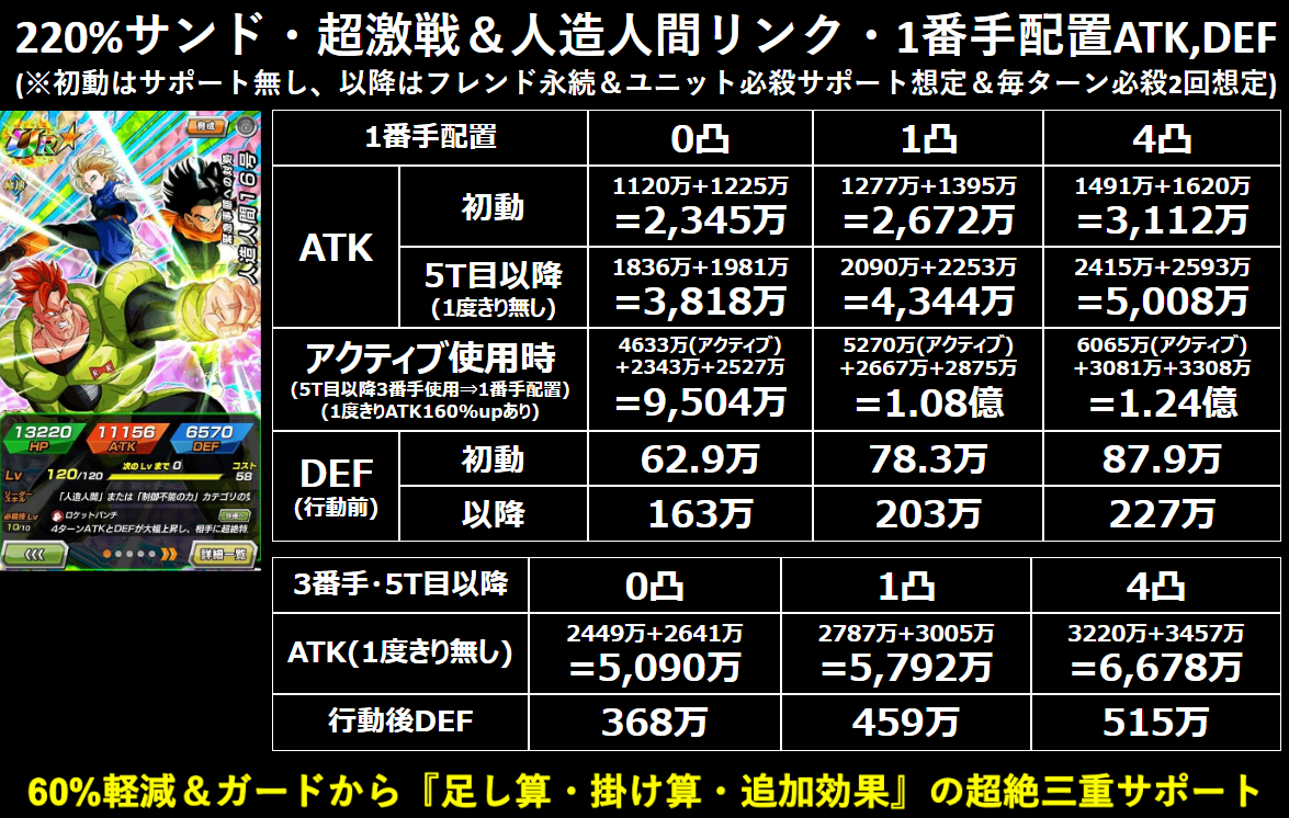 上の表を見れば分かる通り火力は全然大した事はなく、アクティブ発動時だって1番手に置けば会心も抜群も一切無し、サポートもATK部分もありますがメインは明らかにDEF、そして主力となるセルや超17号も上の表を見れば分かる通りサポート前提でも火力はそこまで図抜けている訳でもないし、チームとしてのパワー不足は明らかでしょう。