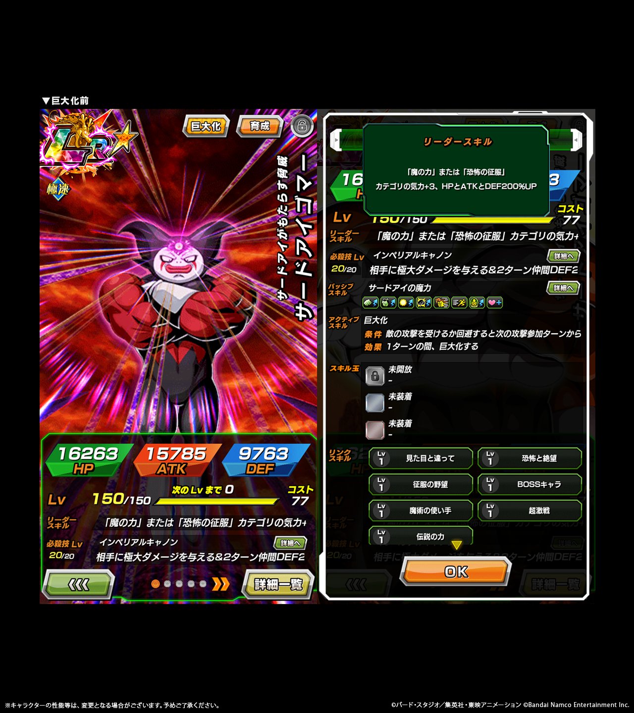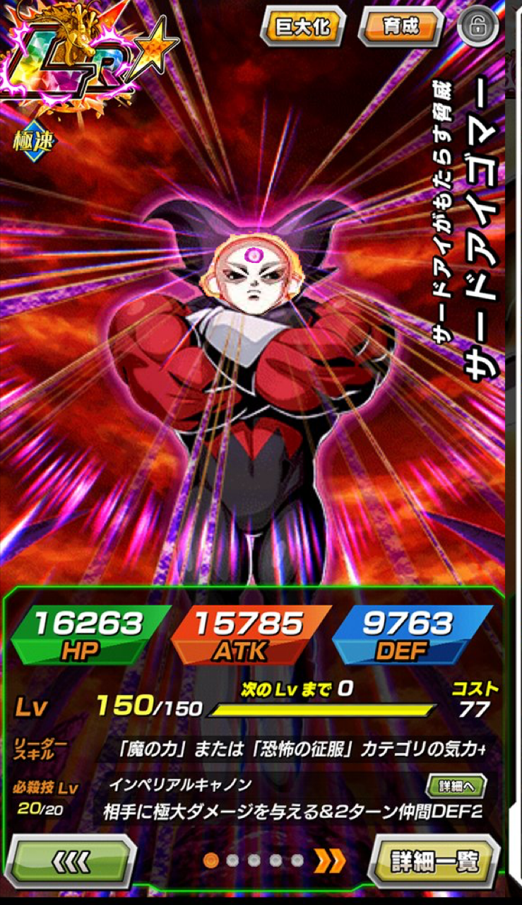 こいつ、ダイマ編成よりも今後極系の強キャラが出た時の必須サブになりそうじゃない?恐怖の征服で登場時演出満たせるし、ちゃんとBOSSキャラも持ってるから使いずらいってこともないし