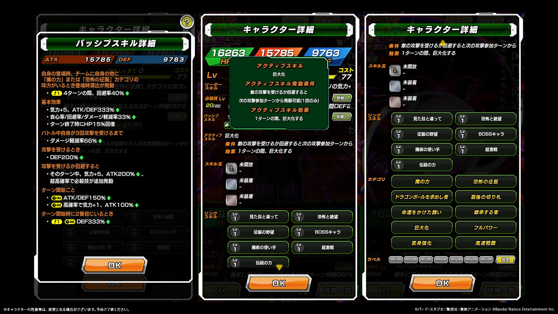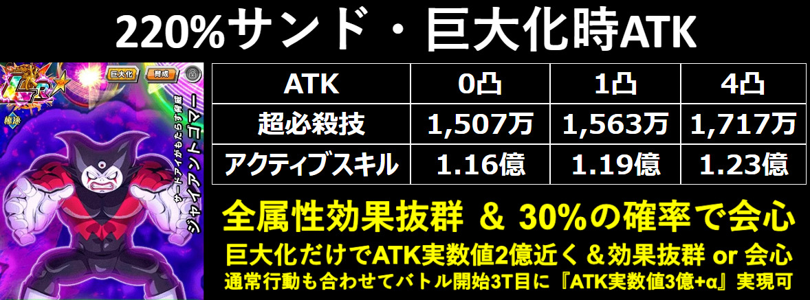 『巨大化アクティブ+巨大化中の攻撃+巨大化を終えた後の自身の行動』全部合わせて合計ATK3億~(&抜群 or 会心)くらいのパワーも現実的に狙えそうで、しかもこの火力を『バトル開始3ターン目』に実現可能です。