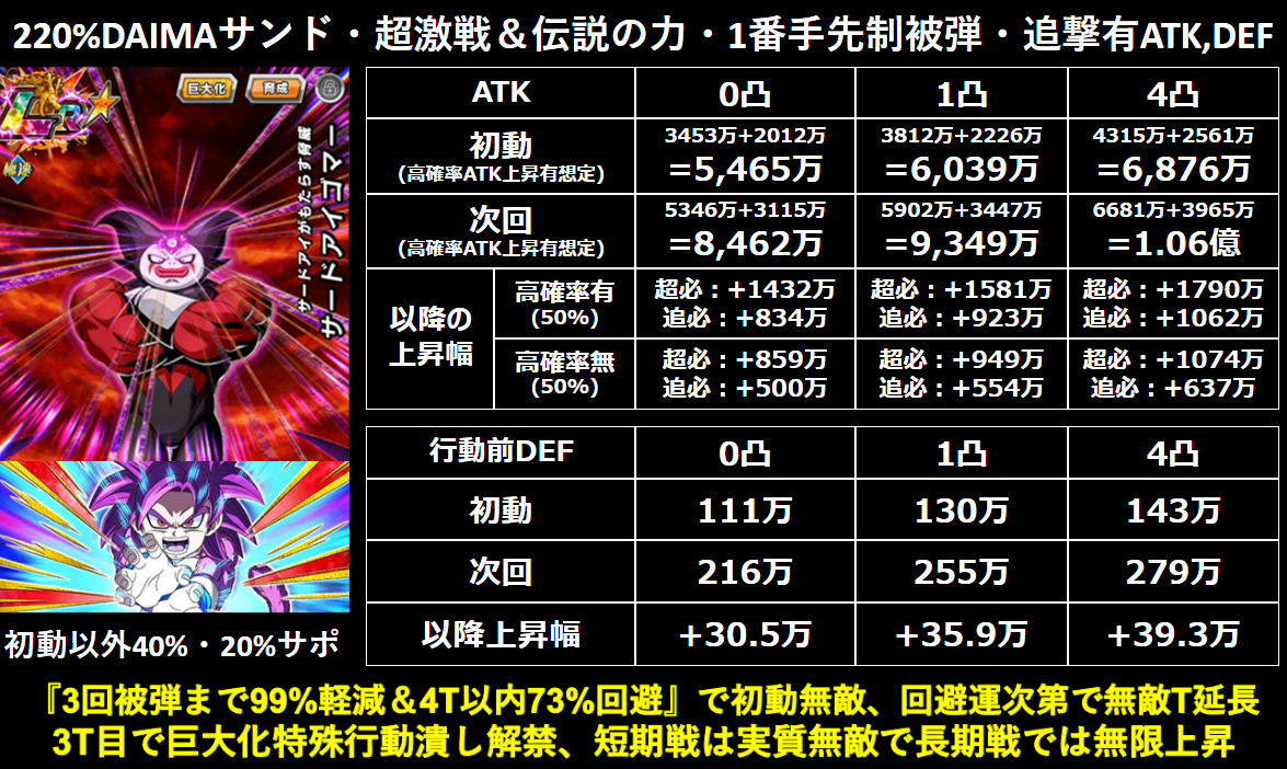 220%サンド・超激戦&伝説の力リンク・1番手配置(=次回2番手登場)・追撃有・確率上昇有・2度目以降はダイマ悟空サポート込でのATK,DEFは以下の通りです。