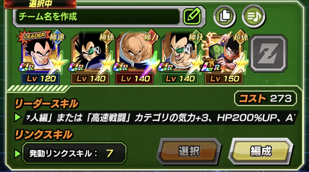 素の火力はそこまで大したものではないですがフィニッシュは実数値で大きく1億を超え、実際には極限キャラが力気玉大量生成などもしてくれるしナッパベジータの20%アクティブサポートなどもあり、『2億超え&100%会心』くらいの一撃も十分狙えそうでしょうか。